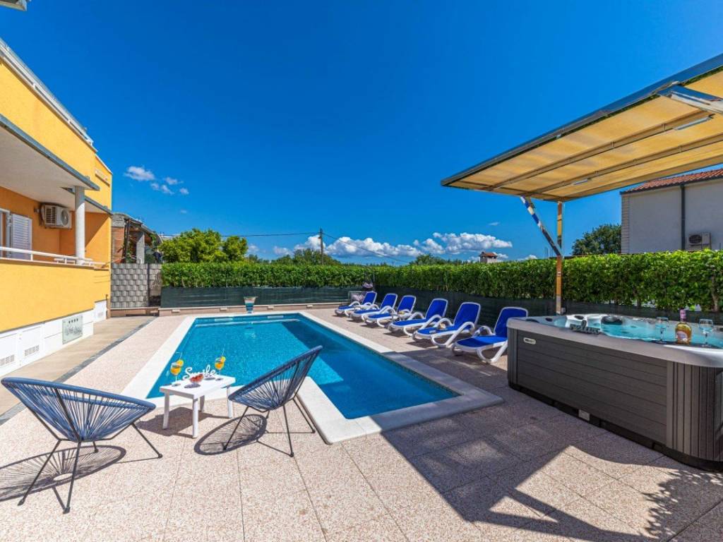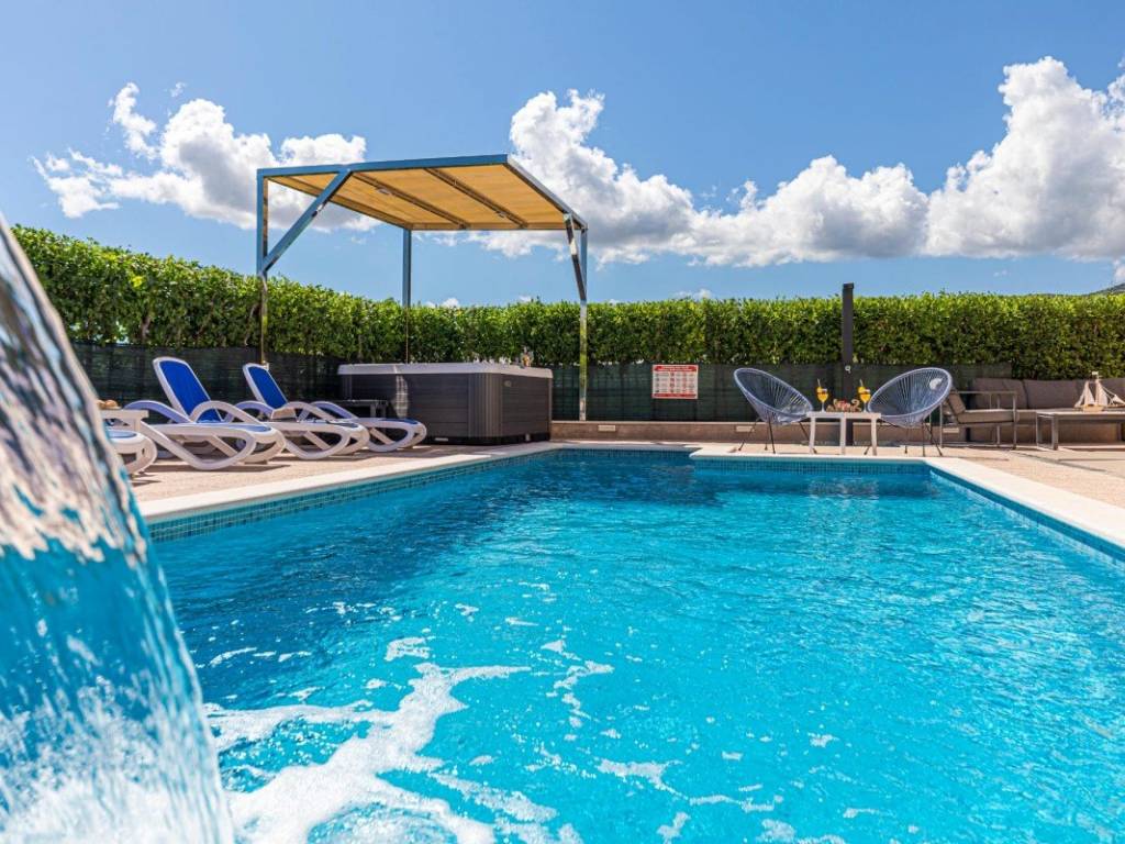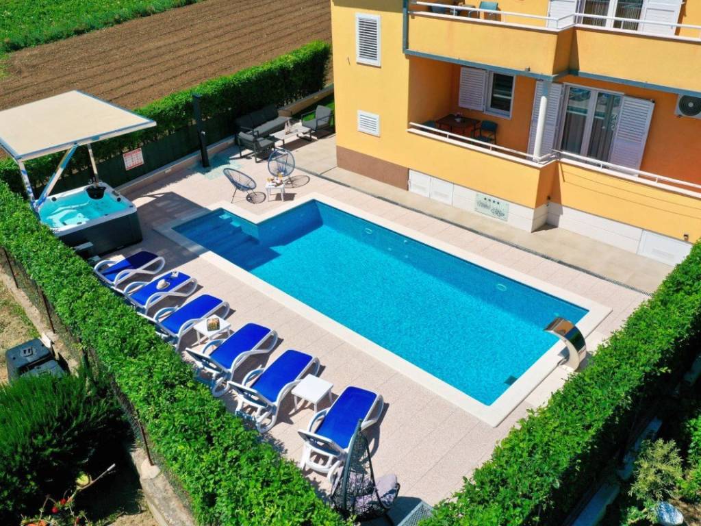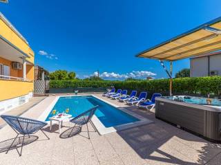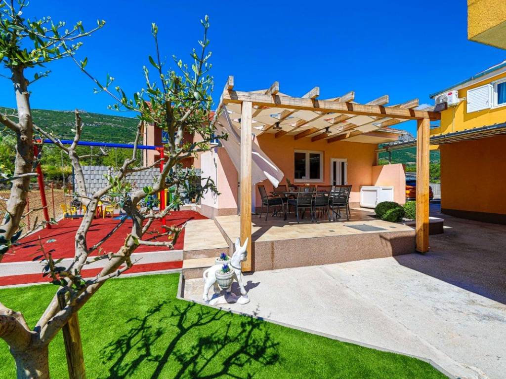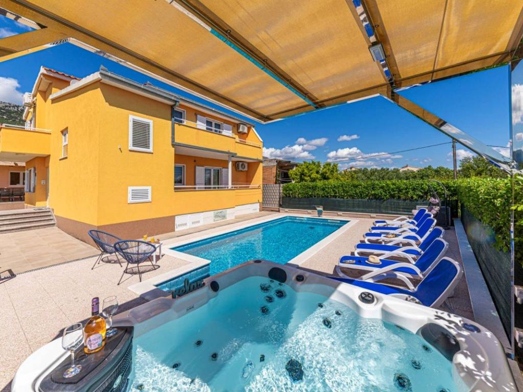 A villa with a swimming pool covers 270 square meters of living space and an auxiliary building of 30 m2 in Kaštela. It consists of two residential units. The main entrance of the villa leads to a spacious ground floor apartment, where there is a kitchen, living room and dining room. The open space concept creates a sense of spaciousness and connection. The kitchen and living room on the first floor have access to a beautiful south terrace that offers a view of the sea. In total, the villa has five bedrooms, two modern bathrooms with showers, while three more toilets are located throughout the building. The rooms are decorated and air-conditioned. In addition to the villa itself, the property also contains an auxiliary building with a fireplace and a room for preparing food on the grill, and a large swimming pool surrounded by a landscaped garden and horticulture typical of this climate. The location of the villa in a peaceful environment makes it an ideal destination for relaxation and rest. One can enjoy privacy. This villa offers the perfect combination of luxury, comfort and beautiful surroundings, making it an excellent choice for family life or as an investment. It has a garage parking space and 3 outdoor parking spaces. The property can be remodeled for family living, or continue to be used as a tourist mecca ideal for vacation.