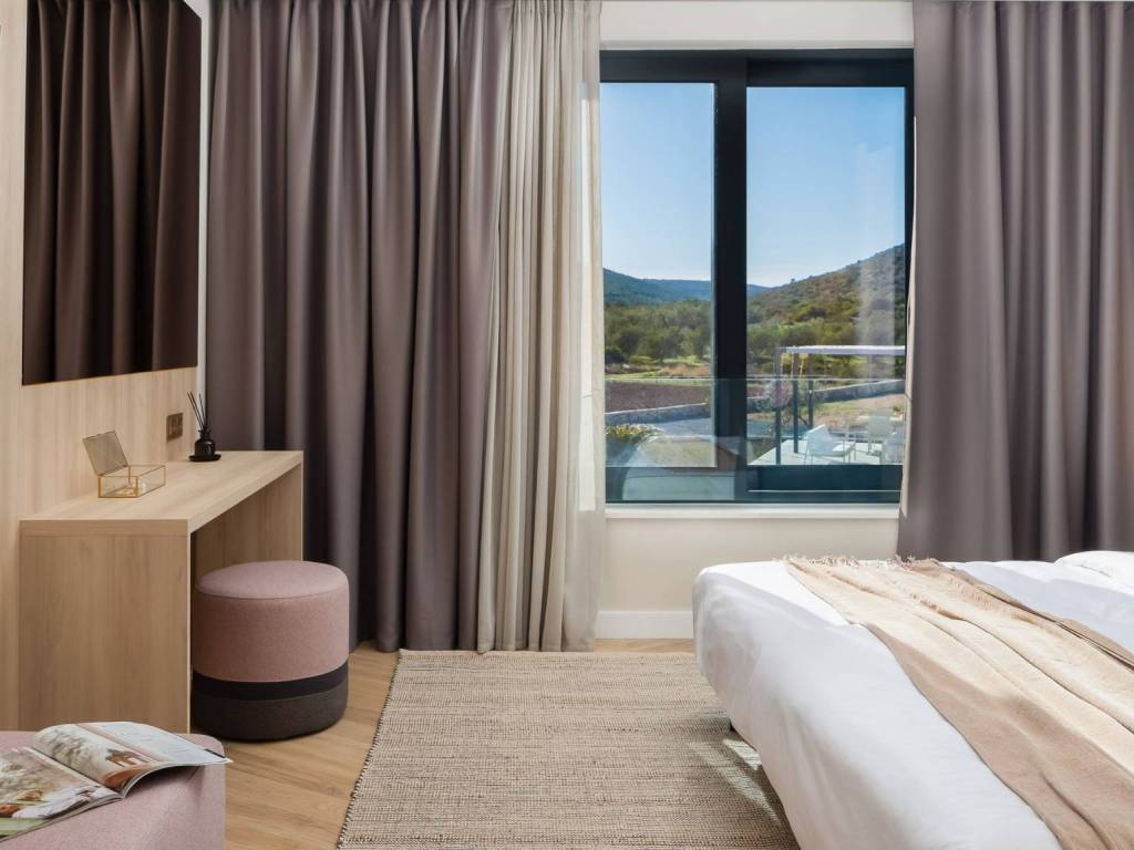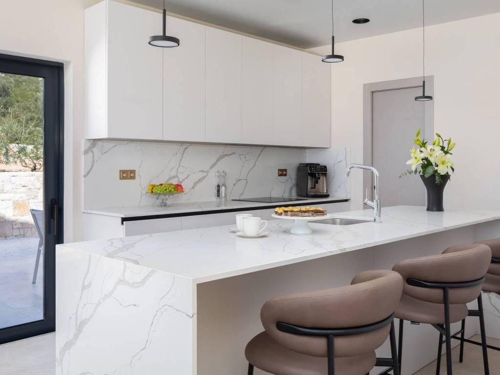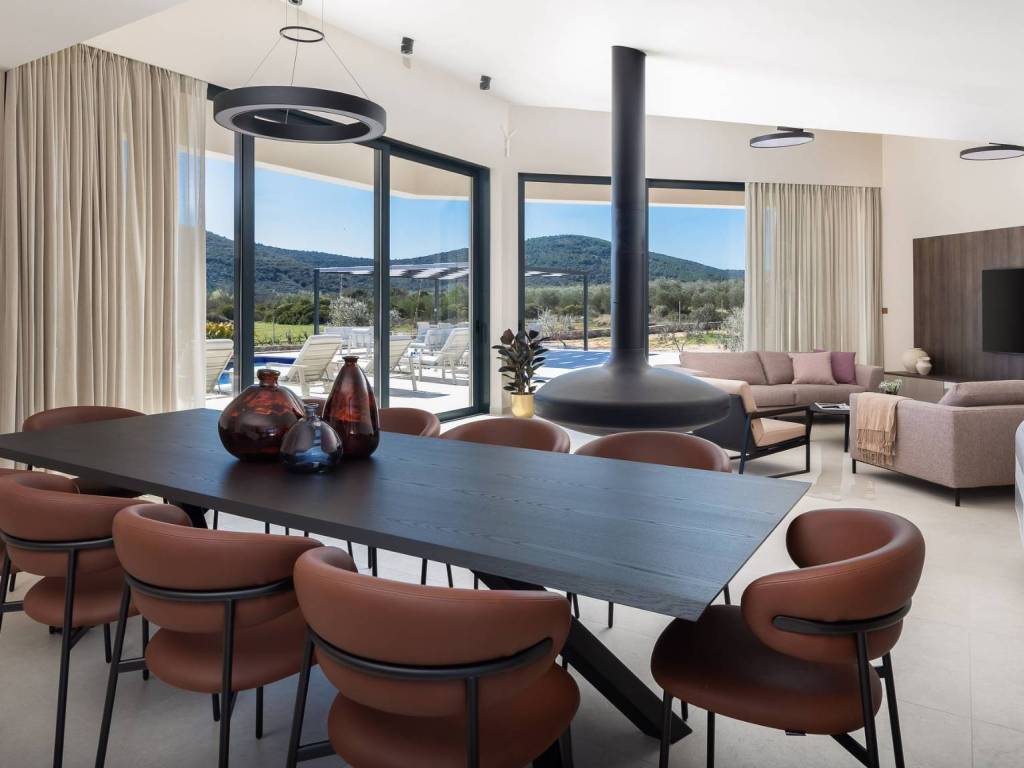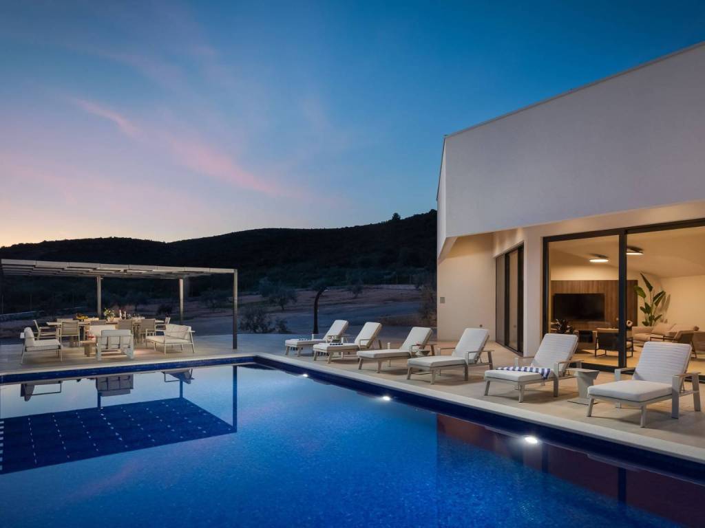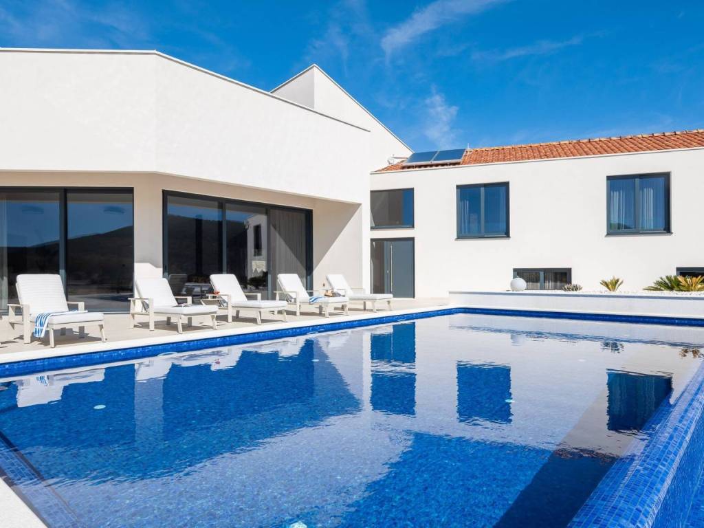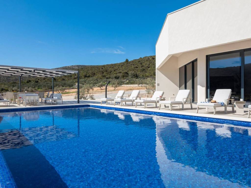 For sale is a luxurious villa in a great location near Trogir. It is an extremely modern design with carefully arranged interior as well as exterior. The villa consists of 2 floors (ground floor and 1st floor) equipped with top quality materials. The building also has a basement. It has a total living area of 310 m2 and is located on a plot of land of 7000 m2. On the first floor there is a bathroom, a kitchen with a dining room and a spacious living room with a view of the outdoor pool. The outdoor pool has a surface of 66 m2 and around it there is outdoor furniture as well as a covered outdoor dining room designed for enjoying summer vacations. On the second floor of the villa there are 5 bathrooms and 5 bedrooms. The villa is characterized by a quiet location, extremely modern design and a garden landscaped with Mediterranean plants. What also makes the property stand out is the uninterrupted view of nature. The villa has a garage of 35 m2 with two parking spaces and two outside parking spaces. Distance from the sea is 1.5 km and 13 km by air from the center of Trogir. It is 17 km from Split airport. It represents an excellent offer either in the form of use for tourist rental or vacation in the summer months.