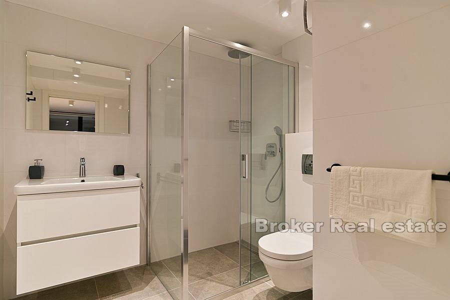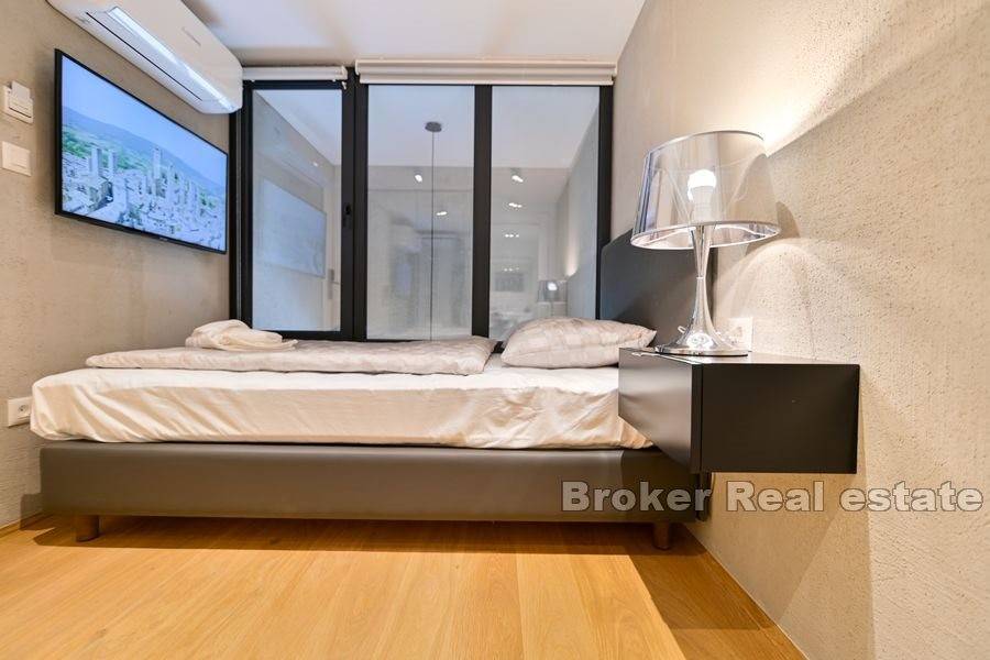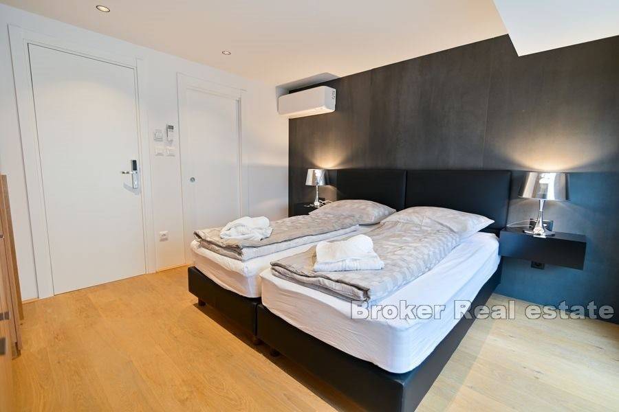 On the ground floor there is a common living area with equipped kitchen and one bedroom with bathroom. On the first floor there are the remaining two rooms with bathrooms, one for two people and the other one for one person. Each apartment is equipped with a mini fridge, TV and air conditioner and in the common area there is a fridge, kitchen hob and washing machine. Entrance to the apartment and each room is provided by a code lock. Public parking is nearby.