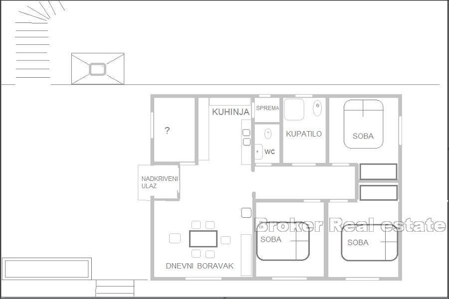 The house is located in an attractive location by the sea. With no road or road in front of you, with your own practically private beach where there is also a mooring for a boat. The house is one-story, unfinished, infrastructure equipped with electricity and water, it currently has a habitable 1 floor with a floor plan area of 96m2.