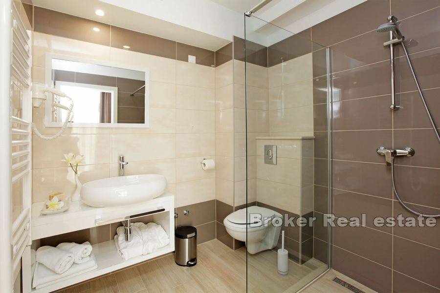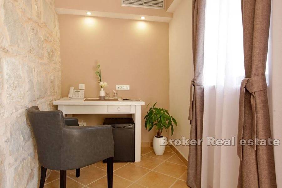 The yard is decorated with Mediterranean plants and olive trees, it has six parking spaces. Additional possibilities of the hotel are the installation of a solar power plant on the gazebo of the parking lot with a peak power of 16 KW (possibility of financing from EU funds) + charger for e-cars, Certificate for Eco Hotel (procedure in progress). The villa-hotel offers great potential with the possibility of continuing the already well-established business.