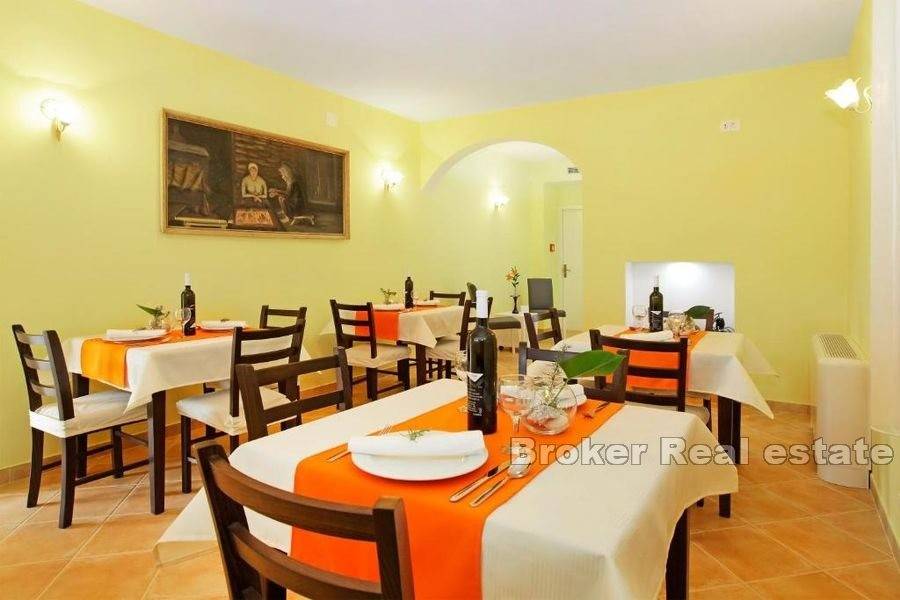 On the ground floor there is a reception, restaurant/bar, kitchen and two bathrooms. There are four bedrooms on the first floor, while there are three bedrooms on the second floor. The rooms were renovated and equipped in 2019, have a smart system with card entry and air conditioning control (Adria electronic) with software. In the basement there is a room for socializing that offers