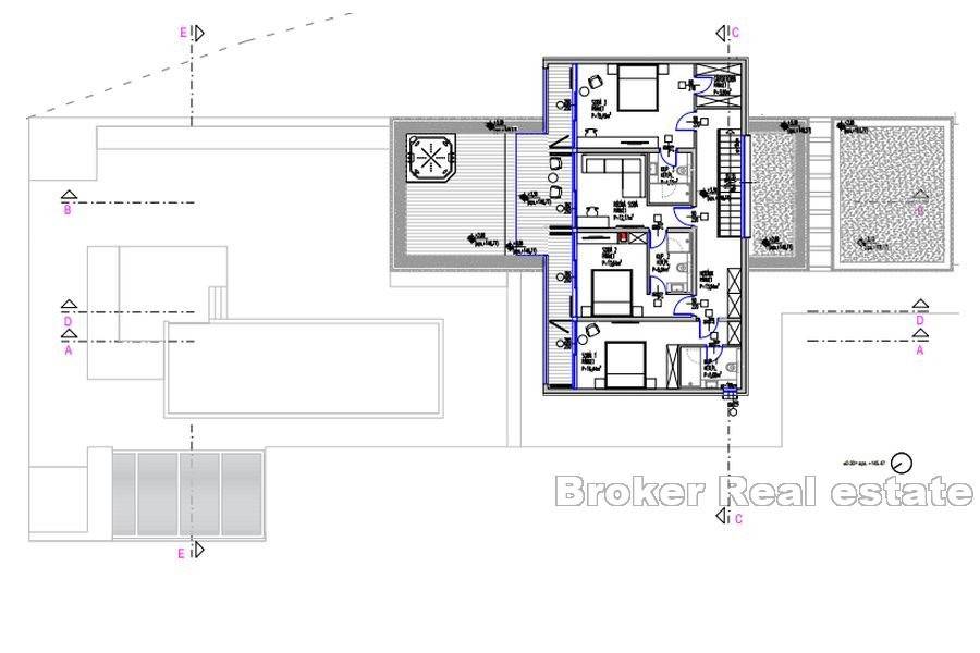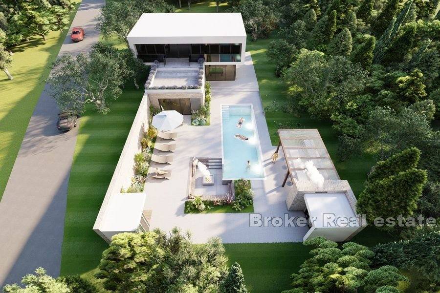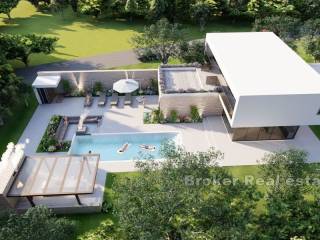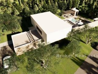 In the olive grove there is a luxury villa under construction on the island of Šolta. The design is a blend of Mediterranean and modern style. It consists of 320 m2 of living space over 2 floors. The ground floor has a living room, dining room, kitchen, toilet and pantry. On the first floor there are 3 bedrooms, study, dressing room, 3 bathrooms and a large terrace with jacuzzi.