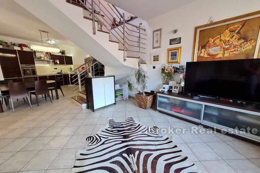 The first floor of approx. 62 m2 consists of a kitchen with dining area and an open concept living room. This whole floor has underfloor water heating. Together with the second floor of approx. 59 m2 on which are laid two bedrooms and a bathroom, is a duplex apartment.