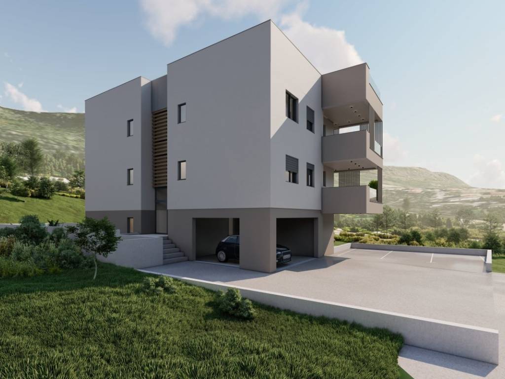 This three-bedroom penthouse is located on the second floor of a smaller residential building comprising a total of four units.