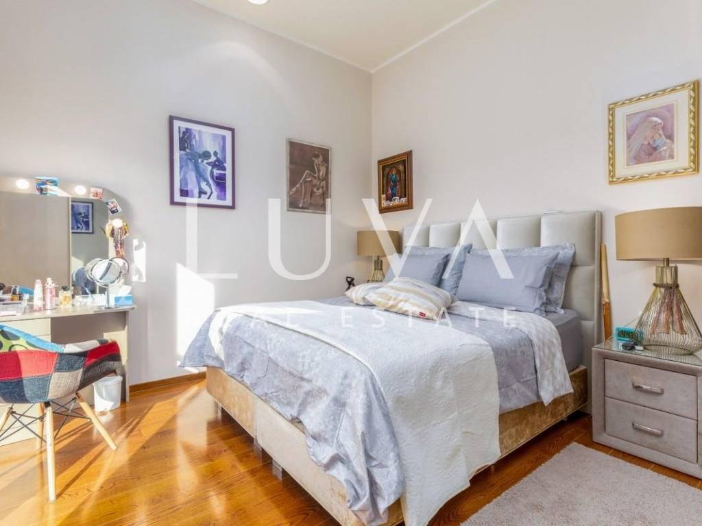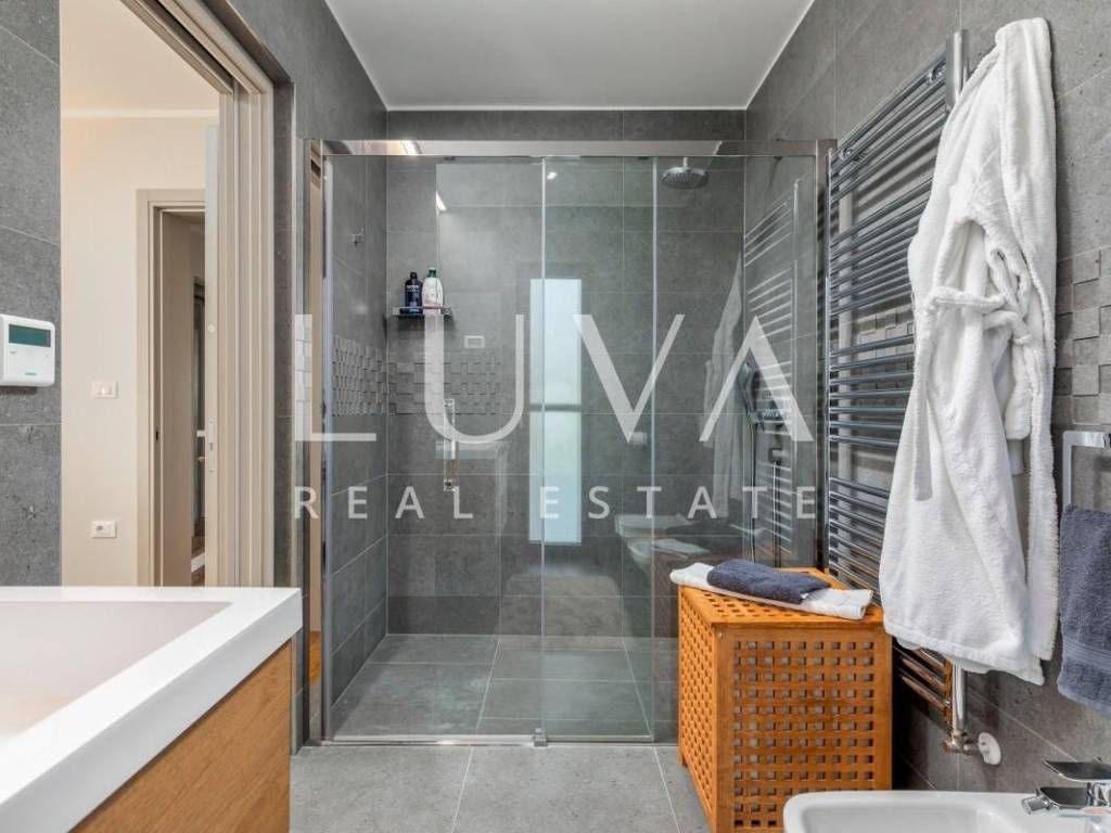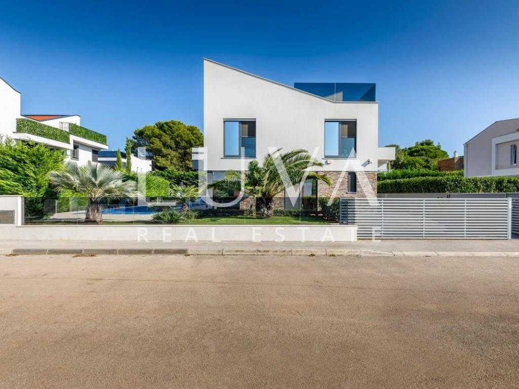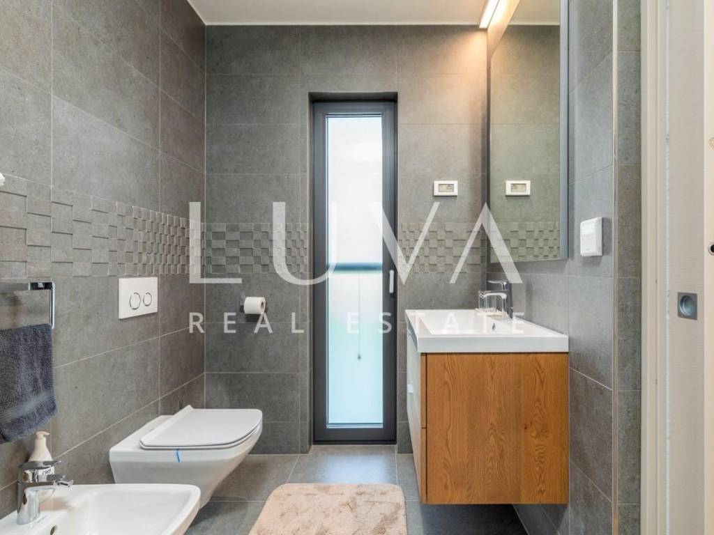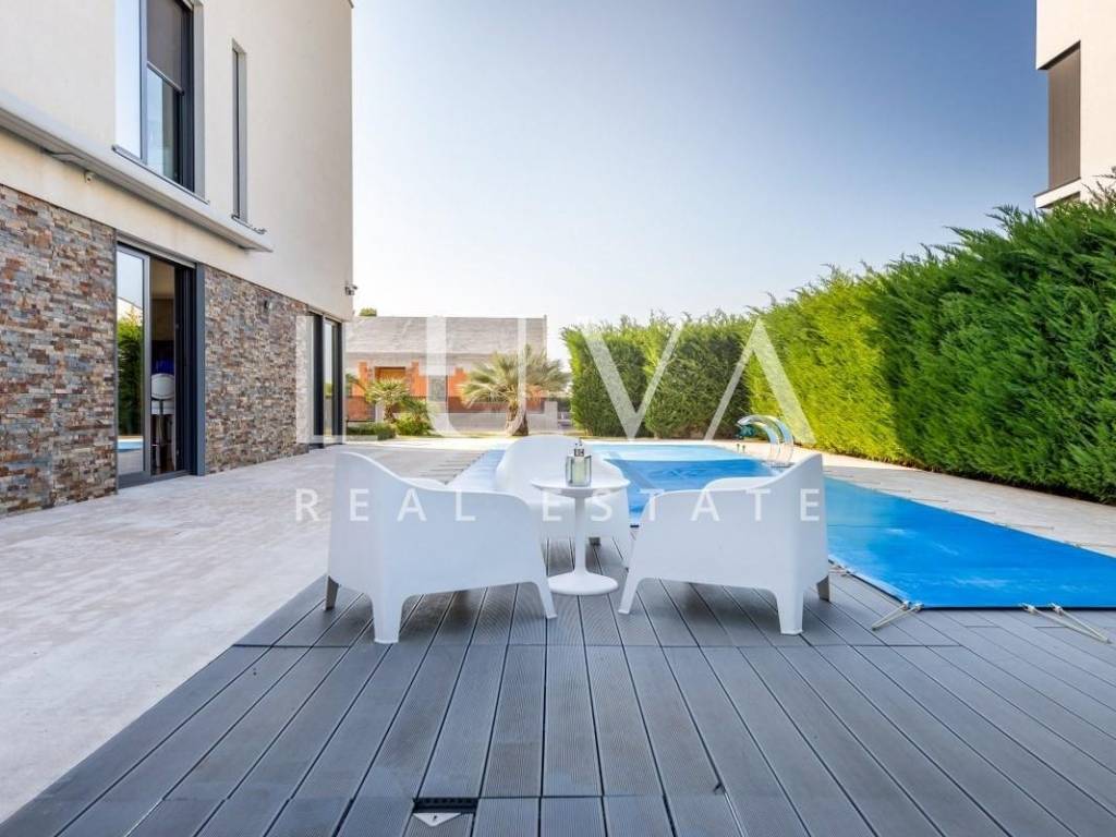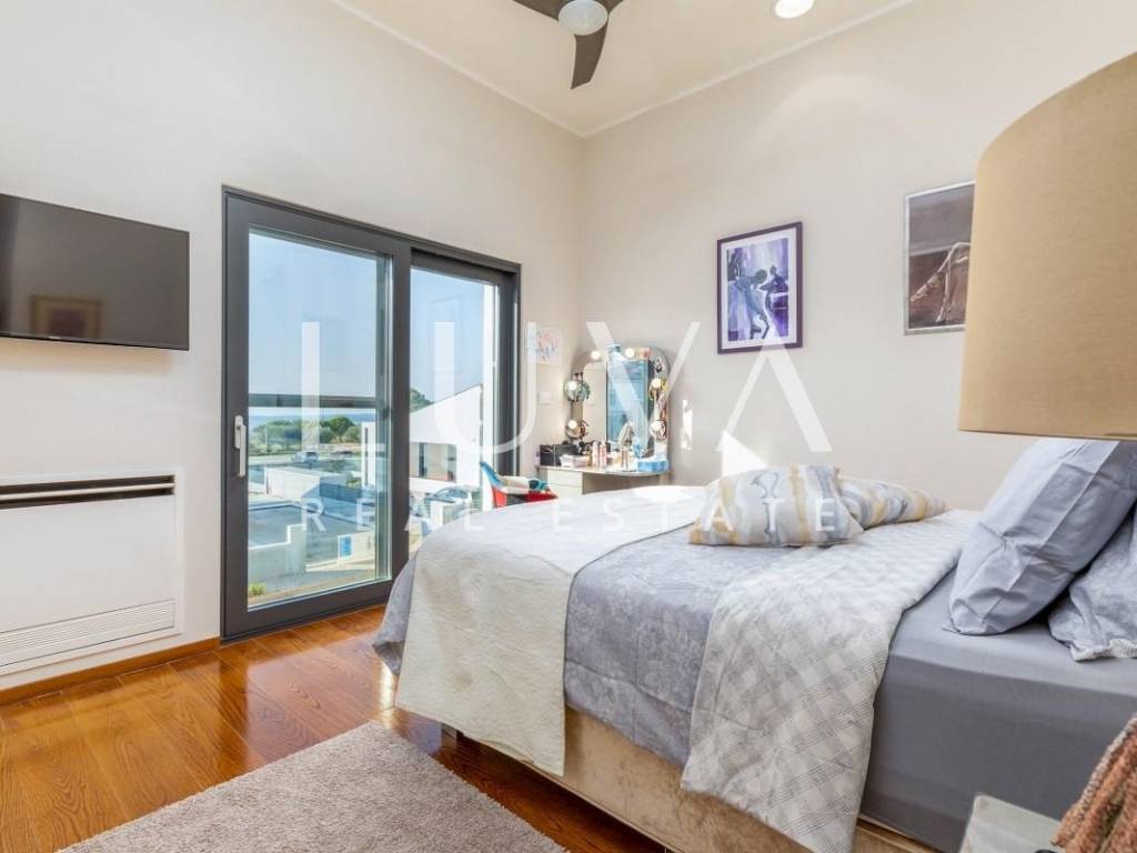 The villa stands out with a contemporary design featuring large glass walls, plenty of natural light and a highly functional layout. It is equipped with top-quality materials and technologies: high-end wooden and ceramic finishes, underfloor heating, solar panels, and an elevator connecting all floors.