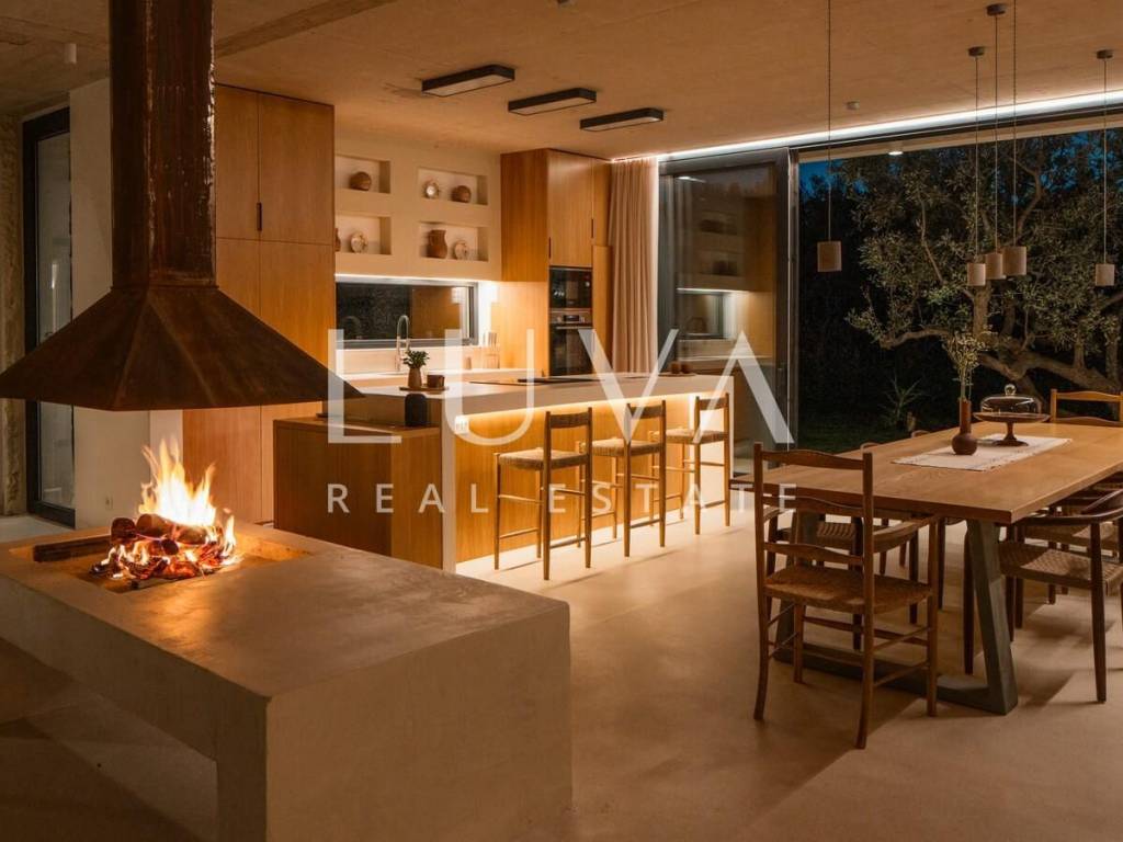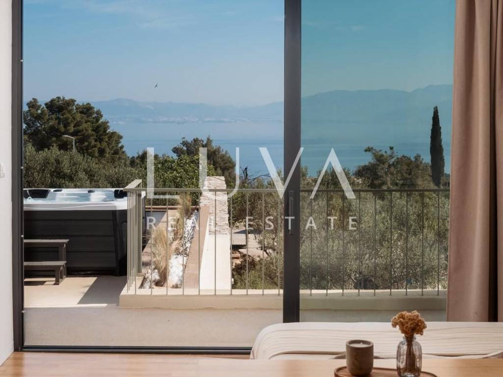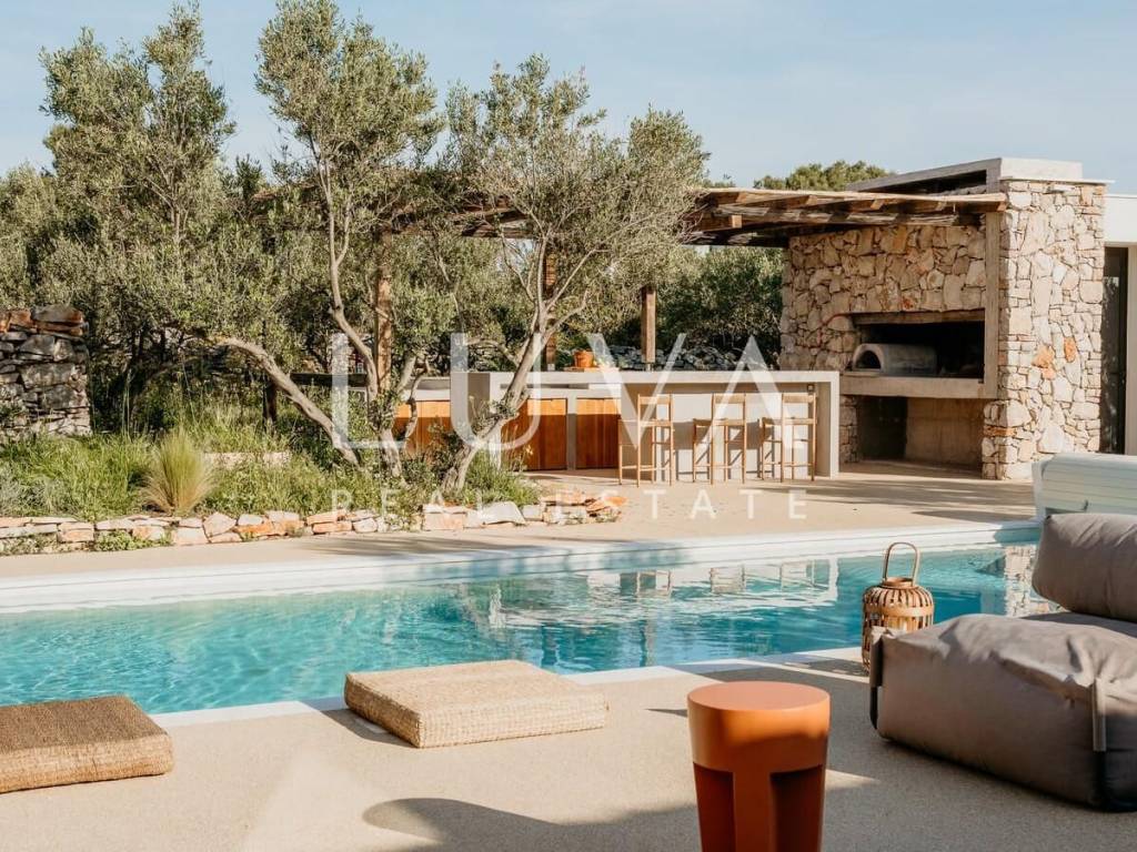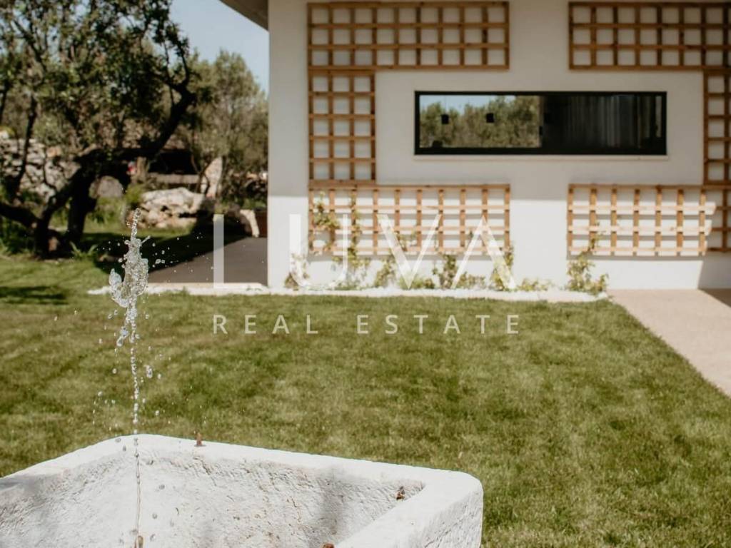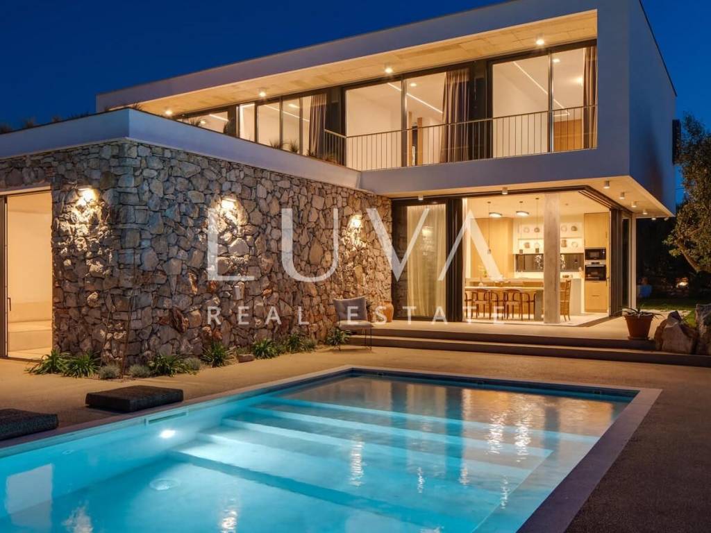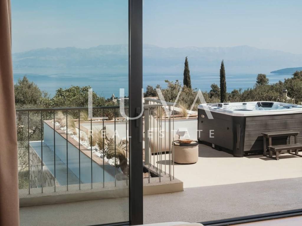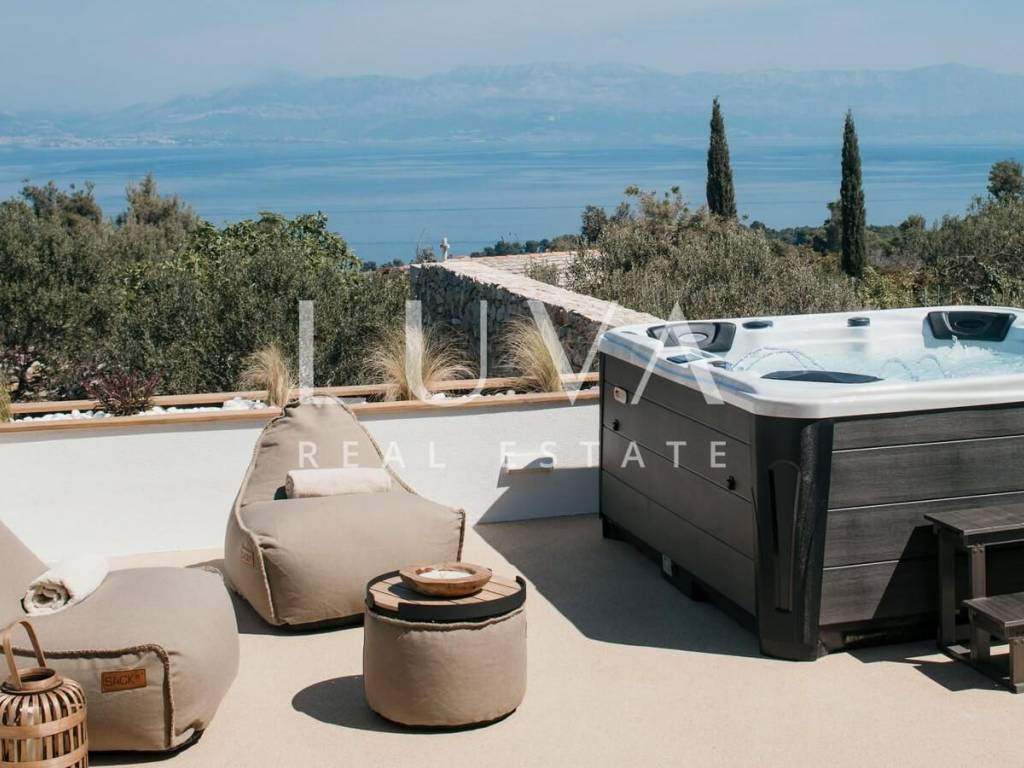 A luxury villa with stunning sea views is for sale on the island of Šolta in Dalmatia. This modern villa is located in the peaceful village of Gornje Selo, offering panoramic views of the sea towards Split. Built in 2024 on a fully fenced 1,800 m² estate, the villa beautifully blends modern and traditional materials, featuring stone and concrete walls.