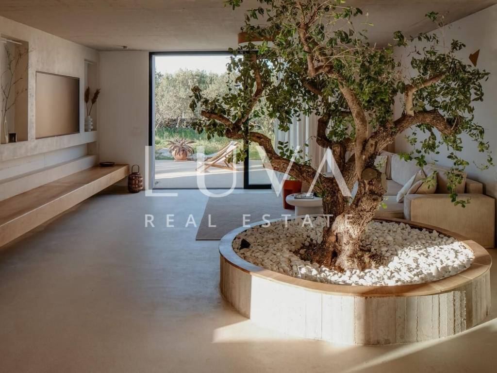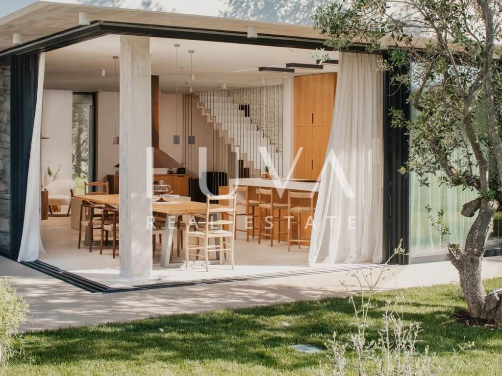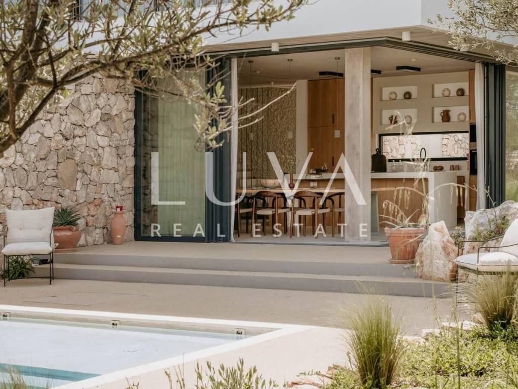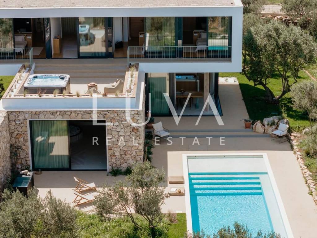 The villa has 270 m², 4 bedrooms, and 3 bathrooms. The ground floor includes a spacious, minimalist living room with an olive tree and a fully equipped kitchen leading to a terrace with an outdoor pool. By the pool, there’s a covered outdoor kitchen, sauna, and sun loungers. The upstairs bedrooms open onto a large terrace with a Jacuzzi offering panoramic sea views. The estate has ample parking, and there's a garage for two vehicles at the back of the villa.