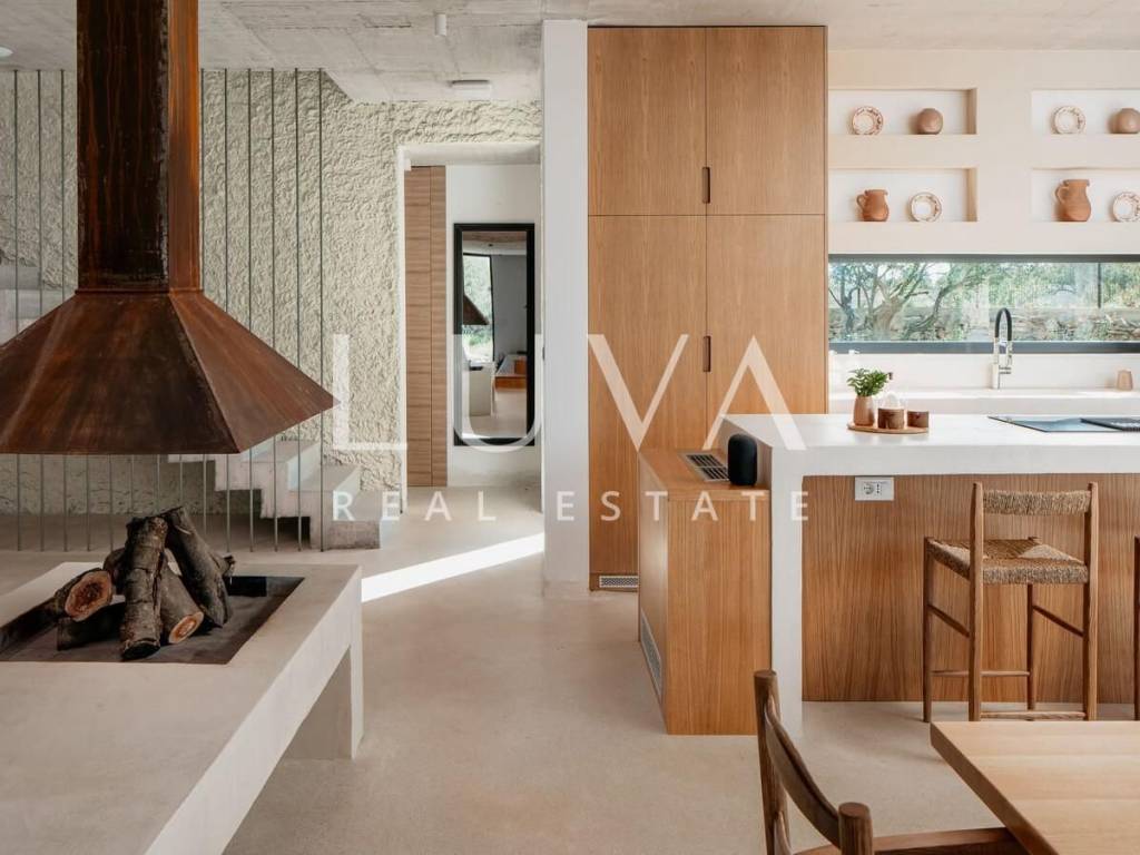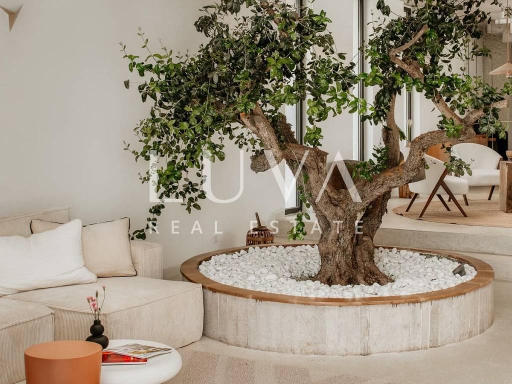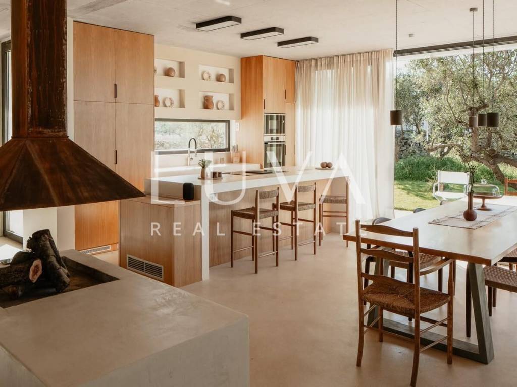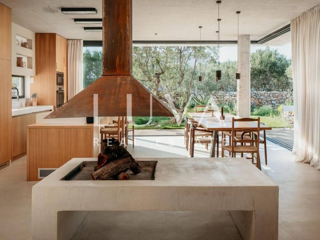 The villa has 270 m², 4 bedrooms, and 3 bathrooms. The ground floor includes a spacious, minimalist living room with an olive tree and a fully equipped kitchen leading to a terrace with an outdoor pool. By the pool, there’s a covered outdoor kitchen, sauna, and sun loungers. The upstairs bedrooms open onto a large terrace with a Jacuzzi offering panoramic sea views. The estate has ample parking, and there's a garage for two vehicles at the back of the villa.