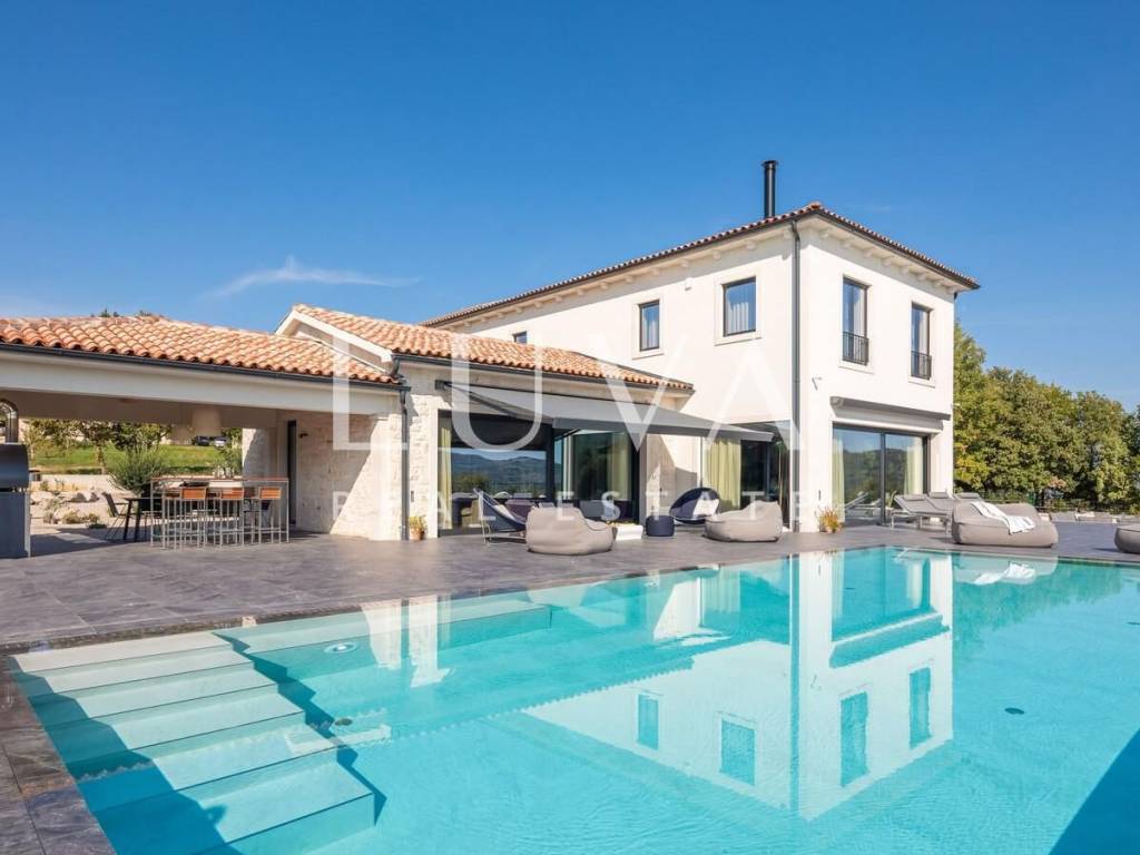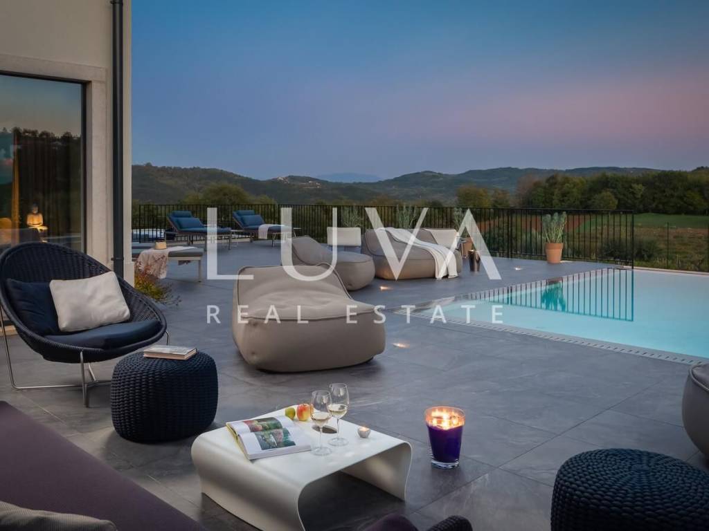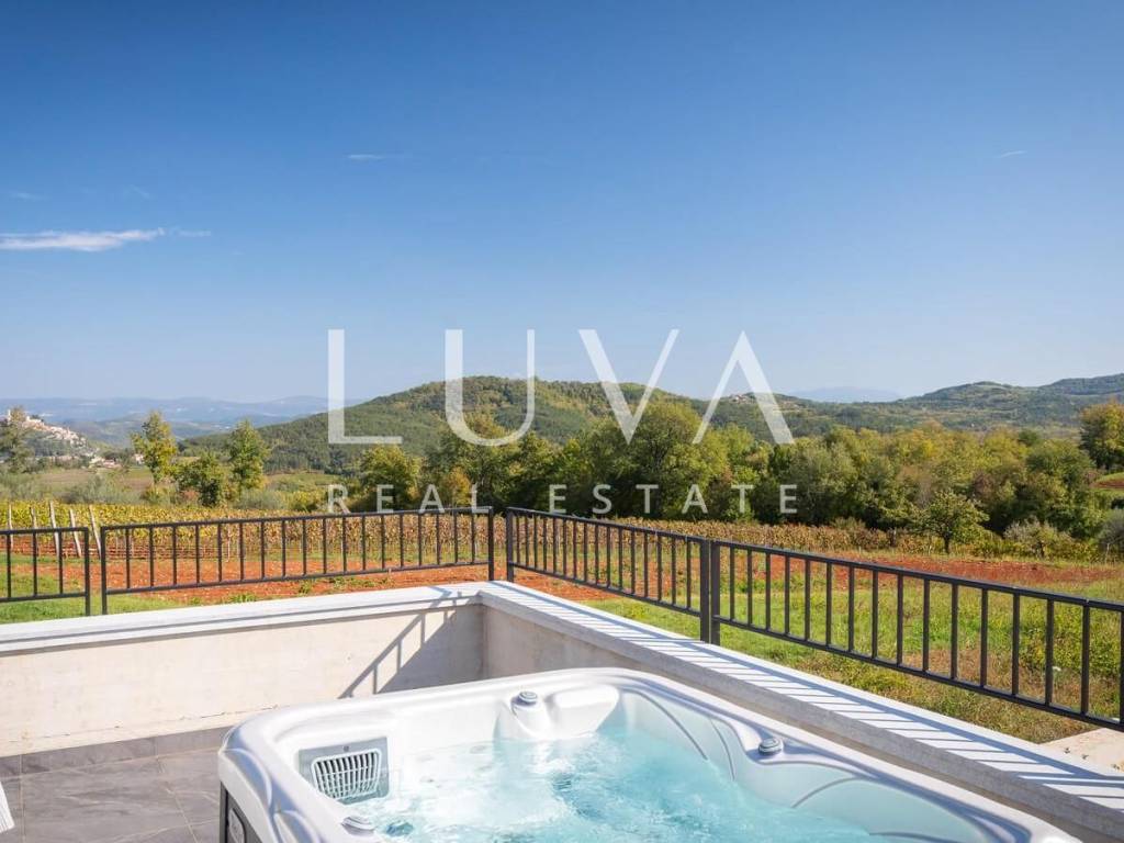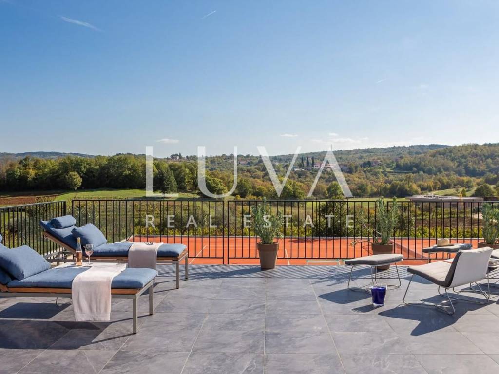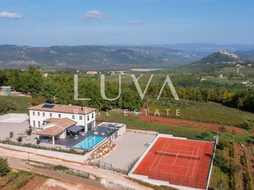 For sale: A newly built luxury villa with a pool on a small hill near the famous town of Motovun. This luxury villa is situated on a large 2000 m² property, offering a stunning view of Motovun due to its elevated position. The entire estate is fully enclosed for privacy, and there is a tennis court in front of the villa.