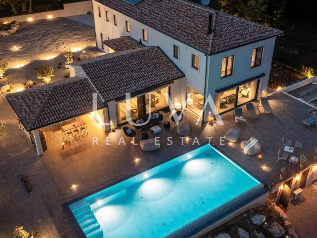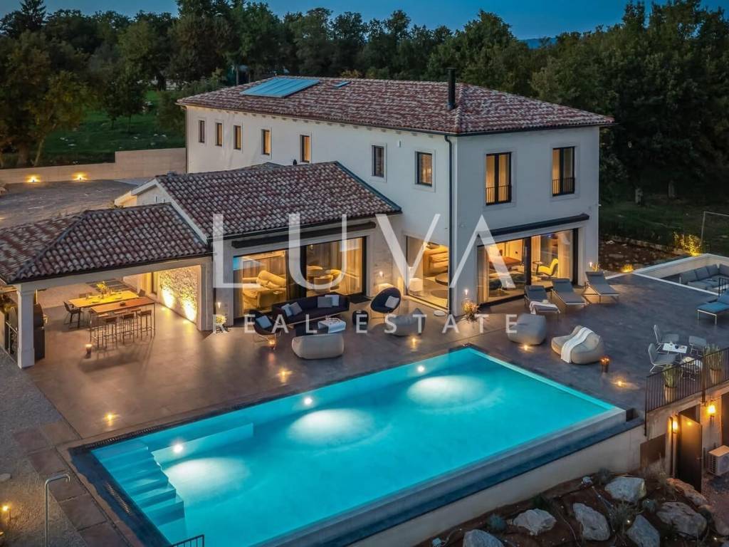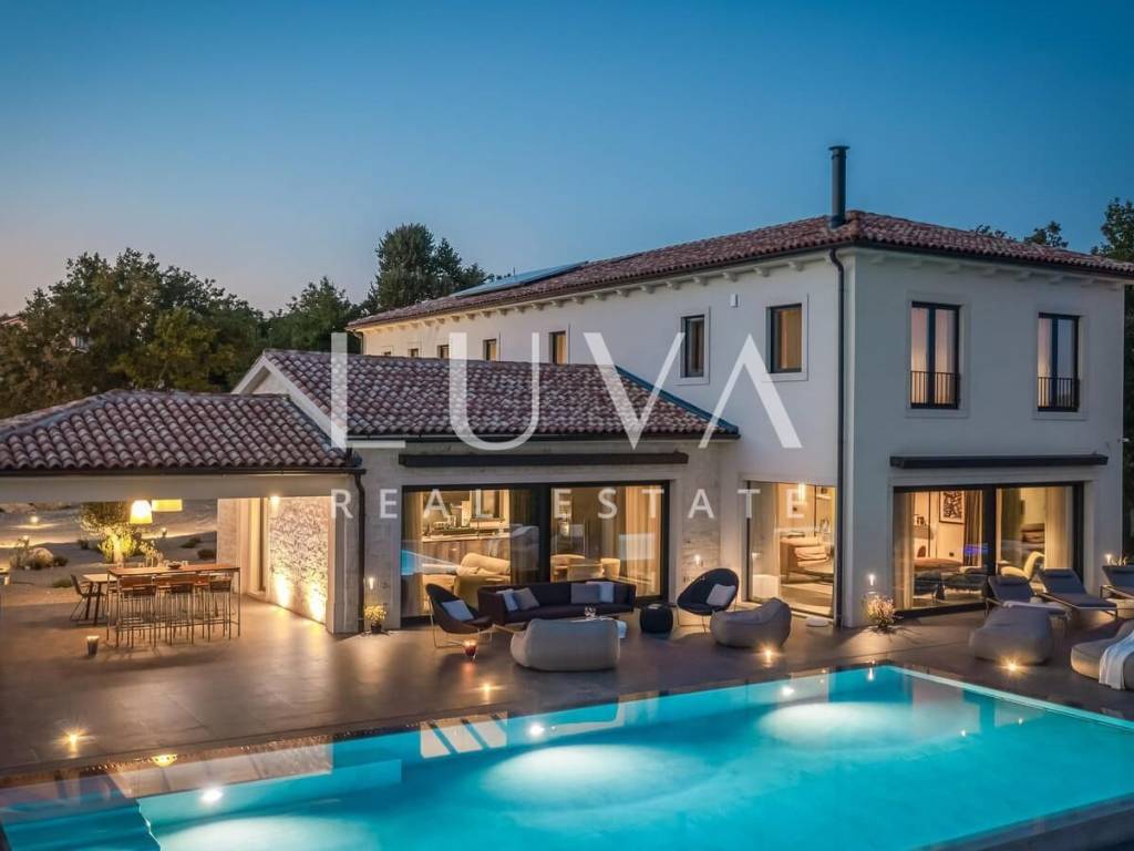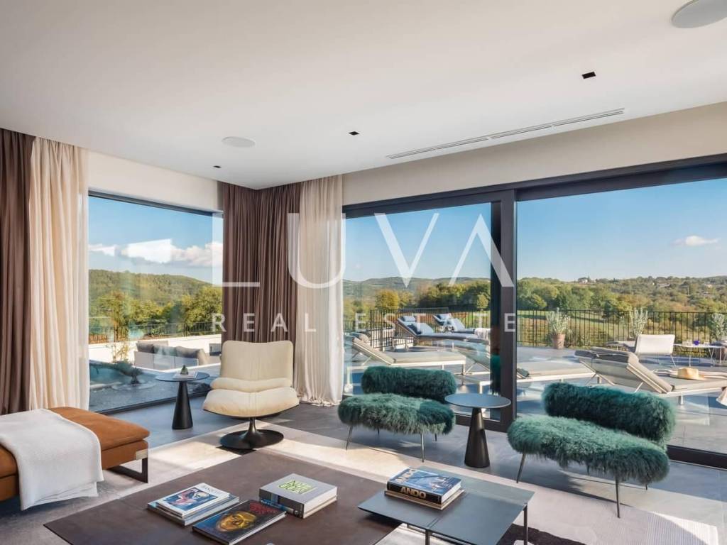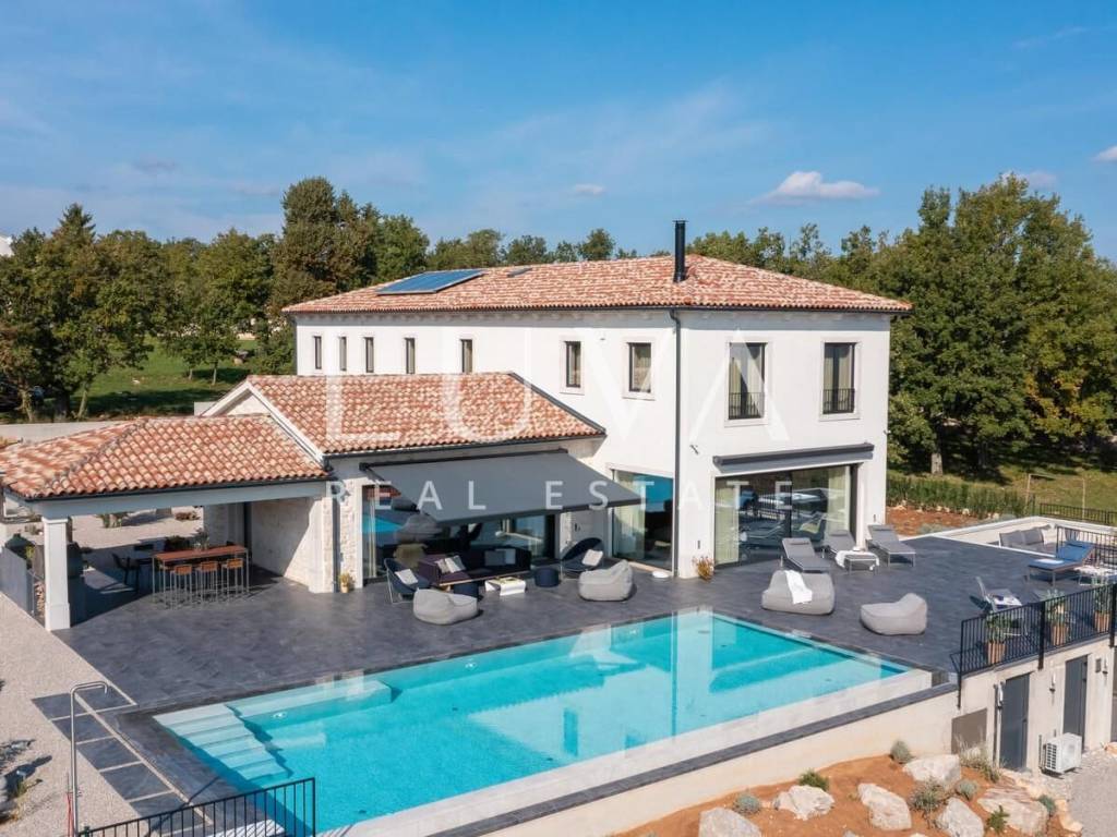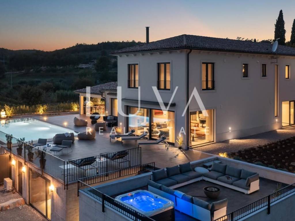 For sale: A newly built luxury villa with a pool on a small hill near the famous town of Motovun. This luxury villa is situated on a large 2000 m² property, offering a stunning view of Motovun due to its elevated position. The entire estate is fully enclosed for privacy, and there is a tennis court in front of the villa.