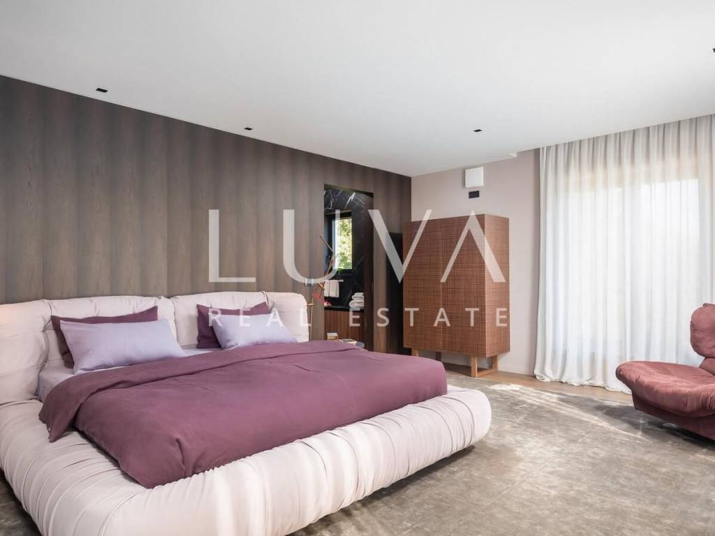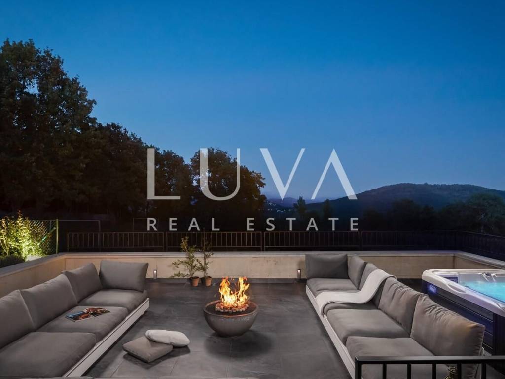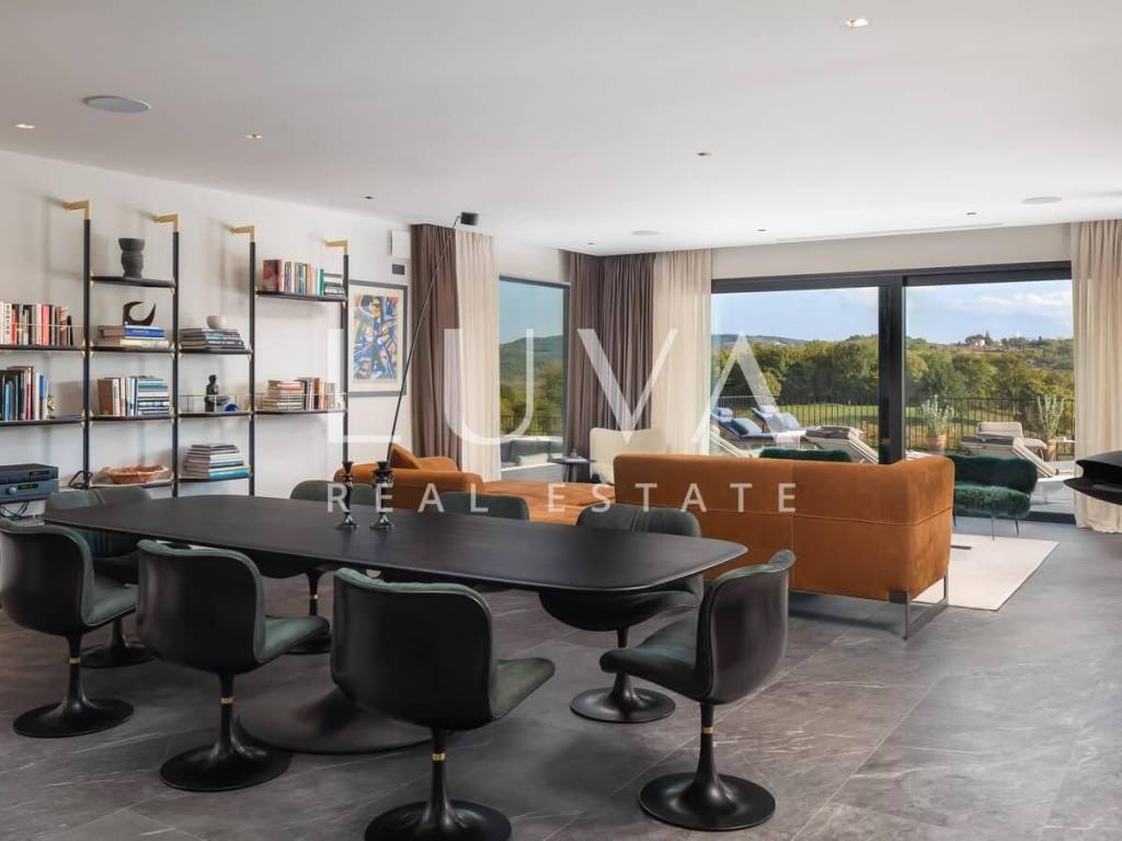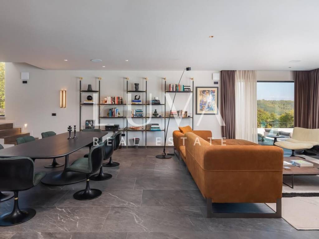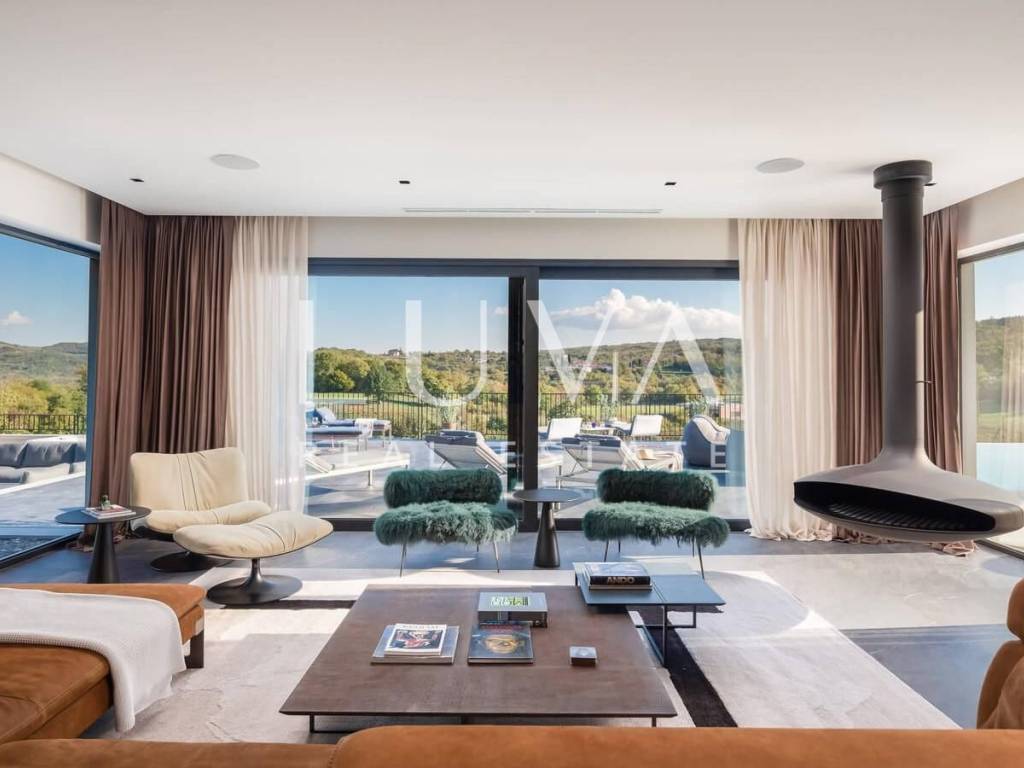 For sale: A newly built luxury villa with a pool on a small hill near the famous town of Motovun. This luxury villa is situated on a large 2000 m² property, offering a stunning view of Motovun due to its elevated position. The entire estate is fully enclosed for privacy, and there is a tennis court in front of the villa.