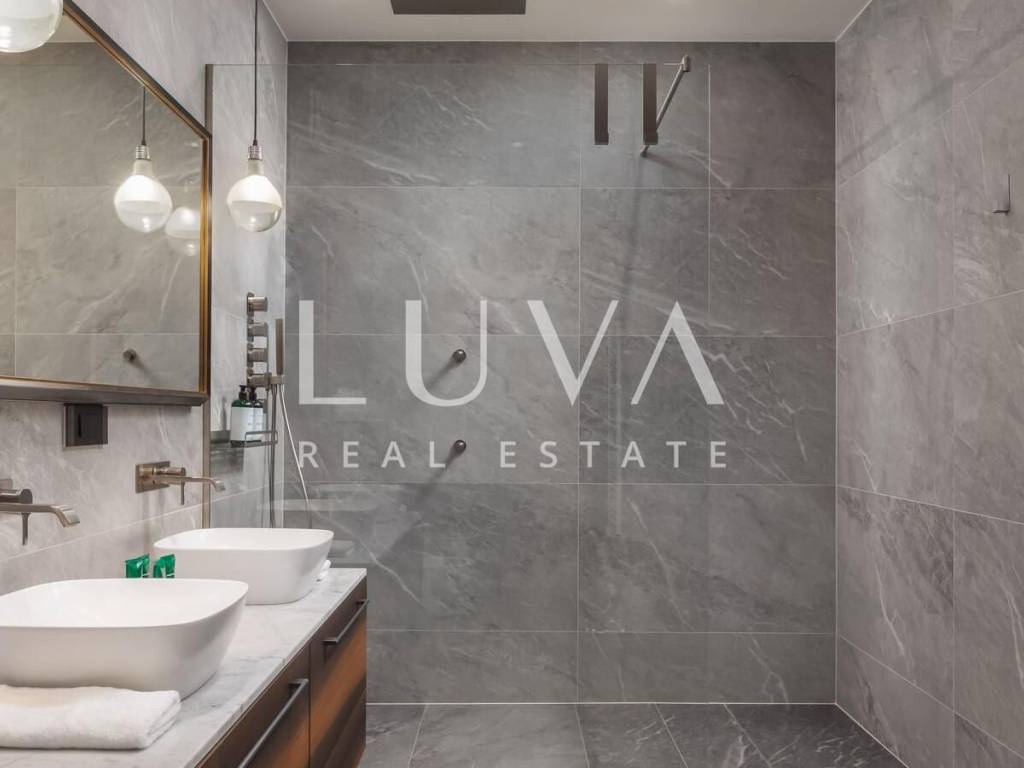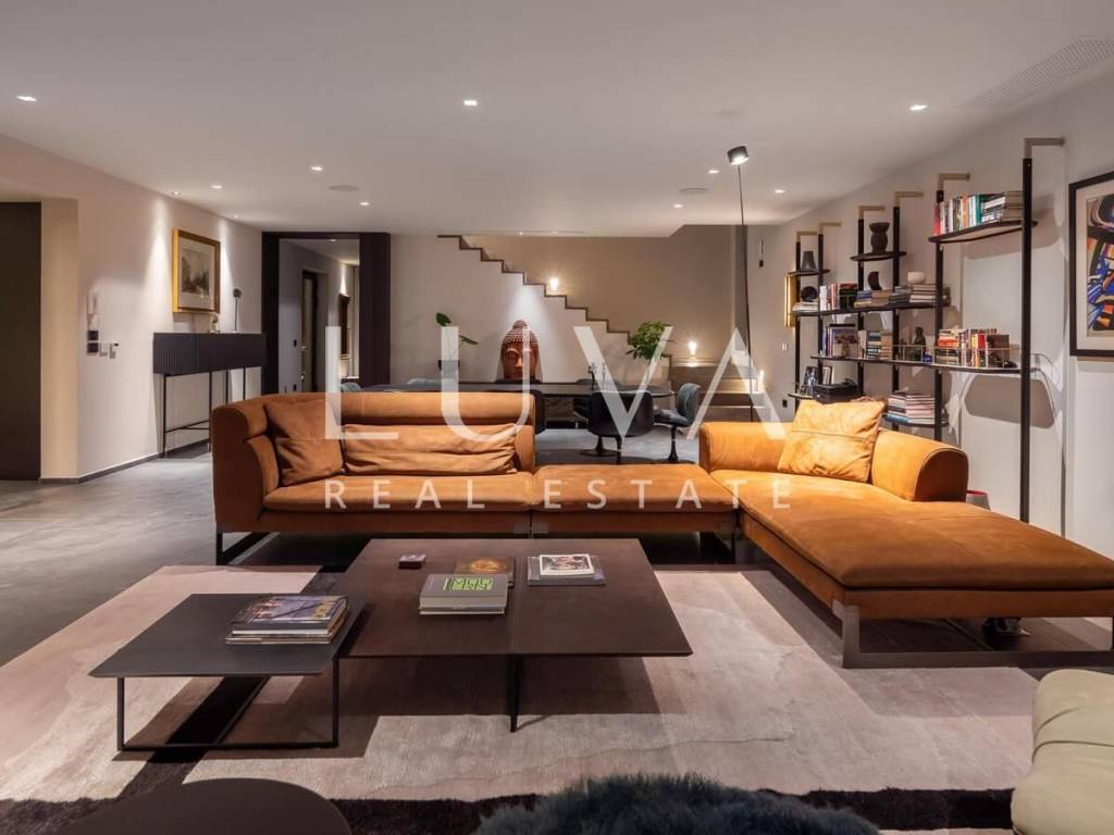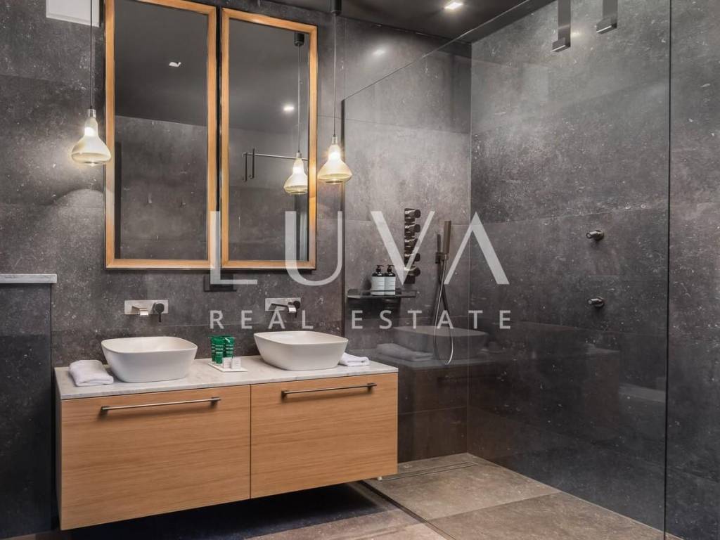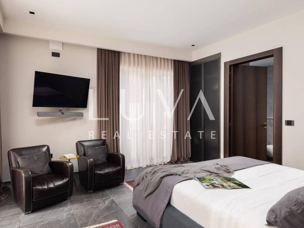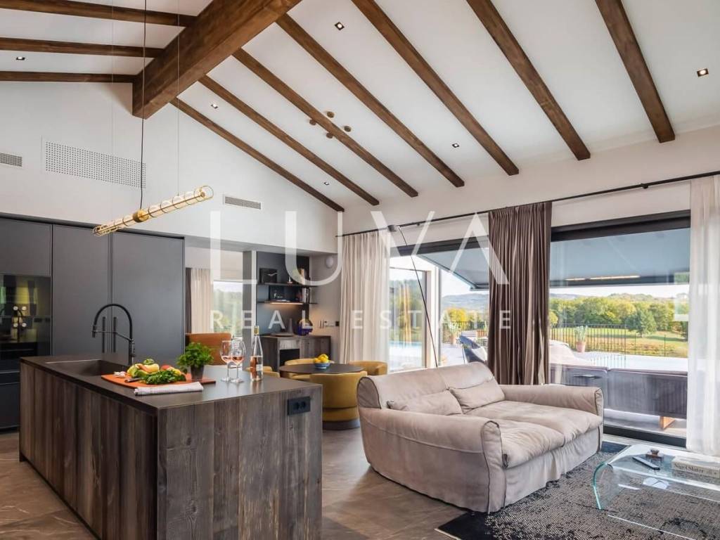 The villa was built in 2023, with a traditional exterior design, while the interior features a modern style. The villa is spread over two floors, with a sloped tiled roof and a large covered terrace extending from the villa. The ground floor includes a spacious, fully equipped modern kitchen and a large living room, both with large glass walls that provide ample natural light and direct access to the terrace with the pool. The mentioned covered terrace also features an outdoor kitchen and a large dining table.