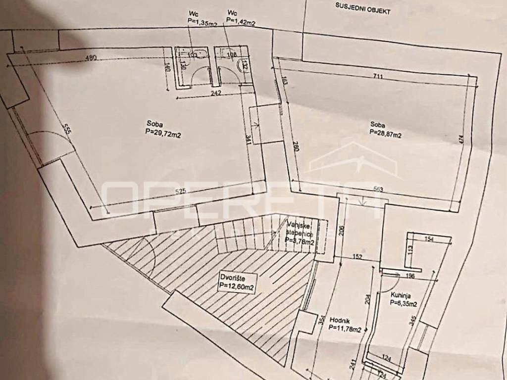 Ukupne površine 80,94 m2, prostor je etažiran kao poslovna jedinica koja se sastoji od hodnika, tri sanitarna čvora, dvije prostorije i čajne kuhinje. Trenutnim rasporedom funkcionalno je organiziran u tri odvojene smještajne jedinice, svaka s vlastitom kupaonicom s toaletom, uz dodatni pomoćni prostor koji služi kao kuhinja, soba, vešeraj i kupaonica s toaletom. Takva organizacija omogućuje višestruki prihod i maksimalnu iskoristivost kvadrature.