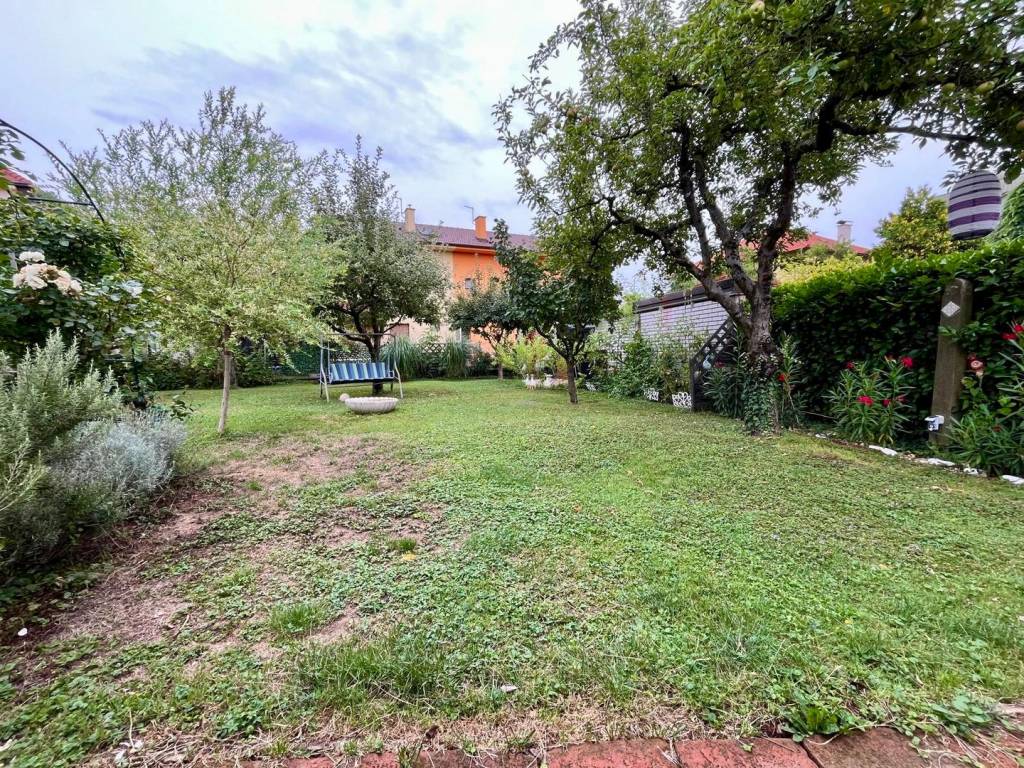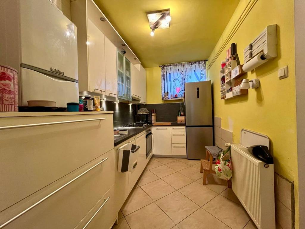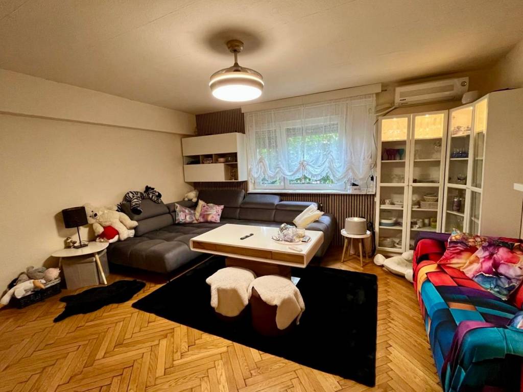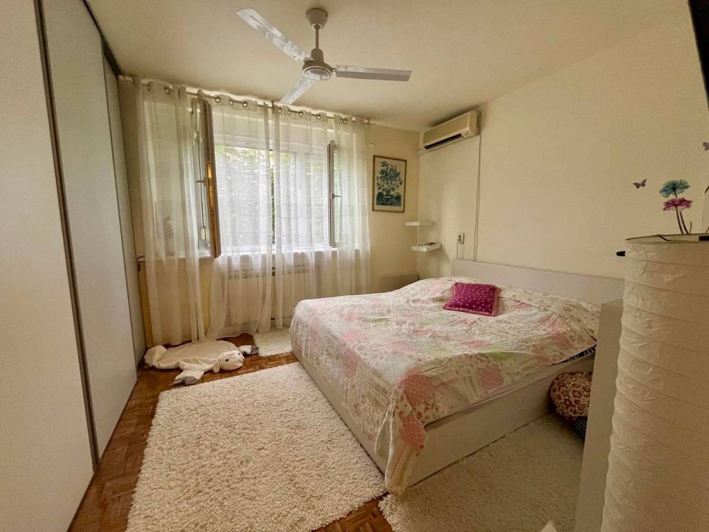 Vendemos un apartamento en la planta baja de una casa familiar con dos unidades habitacionales. El apartamento tiene una superficie aproximada de 80 m2 y consta de un dormitorio, sala de estar, cocina independiente, baño con WC y un comedor que, si es necesario, se puede dividir para crear un segundo dormitorio. El apartamento incluye también un garaje y la mitad del jardín, que es un verdadero oasis natural en medio de la ciudad.