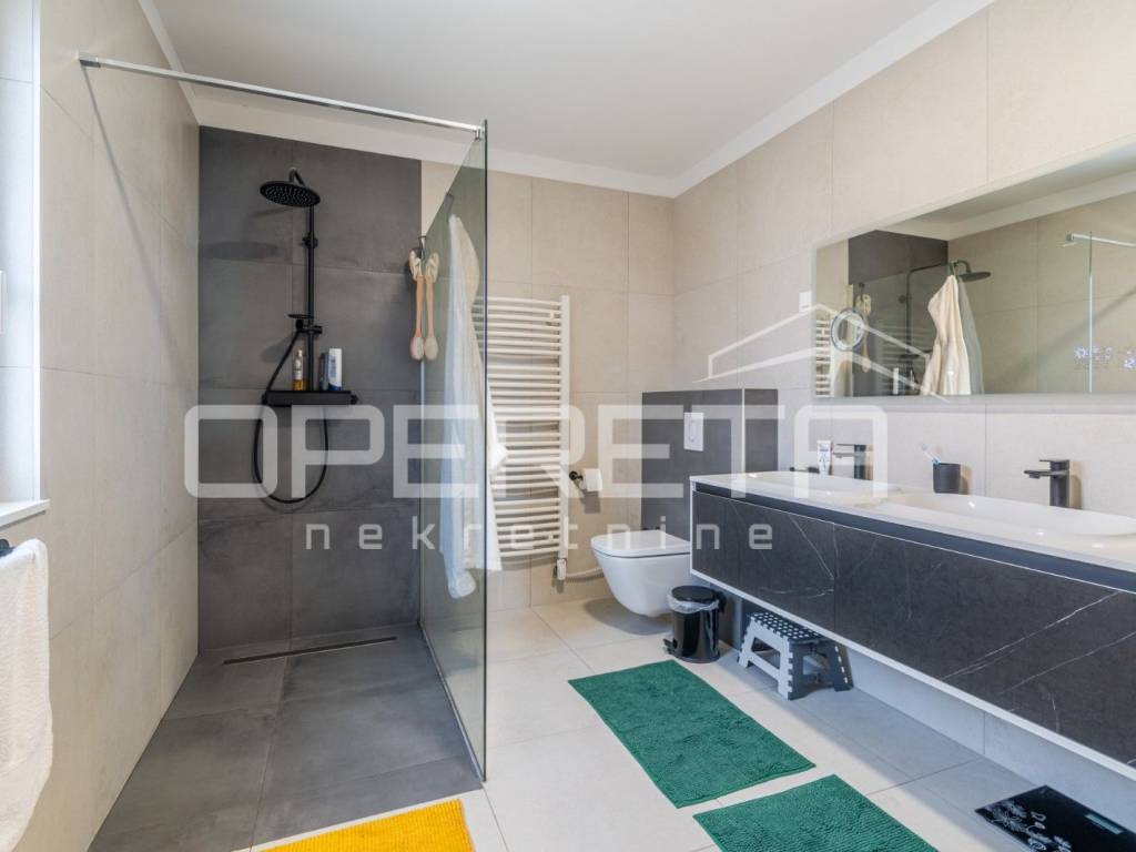 Grijanje i hlađenje osigurani su putem dizalice topline (podno grijanje i fan-coil sustav), uz mogućnost daljinskog upravljanja. Nekretnina je opremljena pametnom bravom, video nadzorom te sustavom filtracije i omekšavanja vode. Energetski razred A i kvalitetna stolarija s troslojnim staklima jamče visoku energetsku učinkovitost i ugodnu mikroklimu tijekom cijele godine.