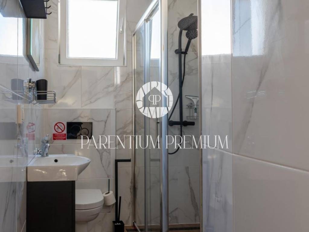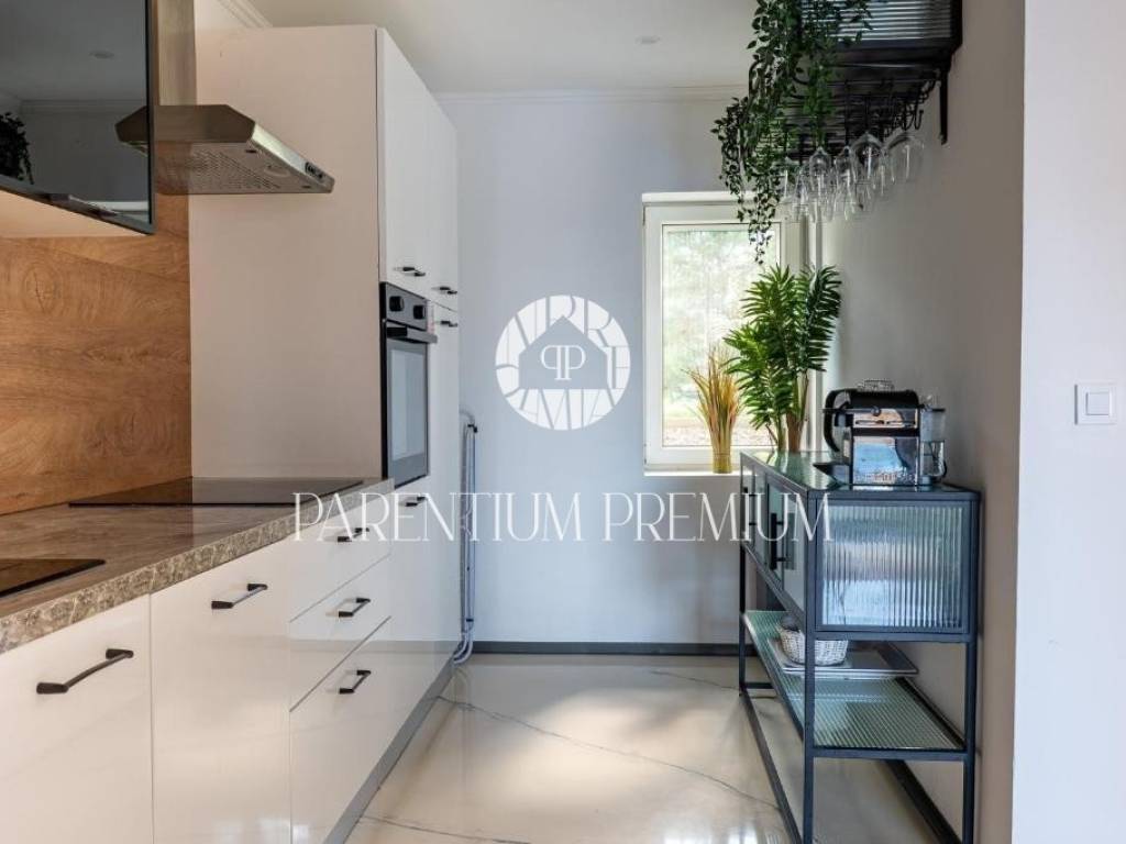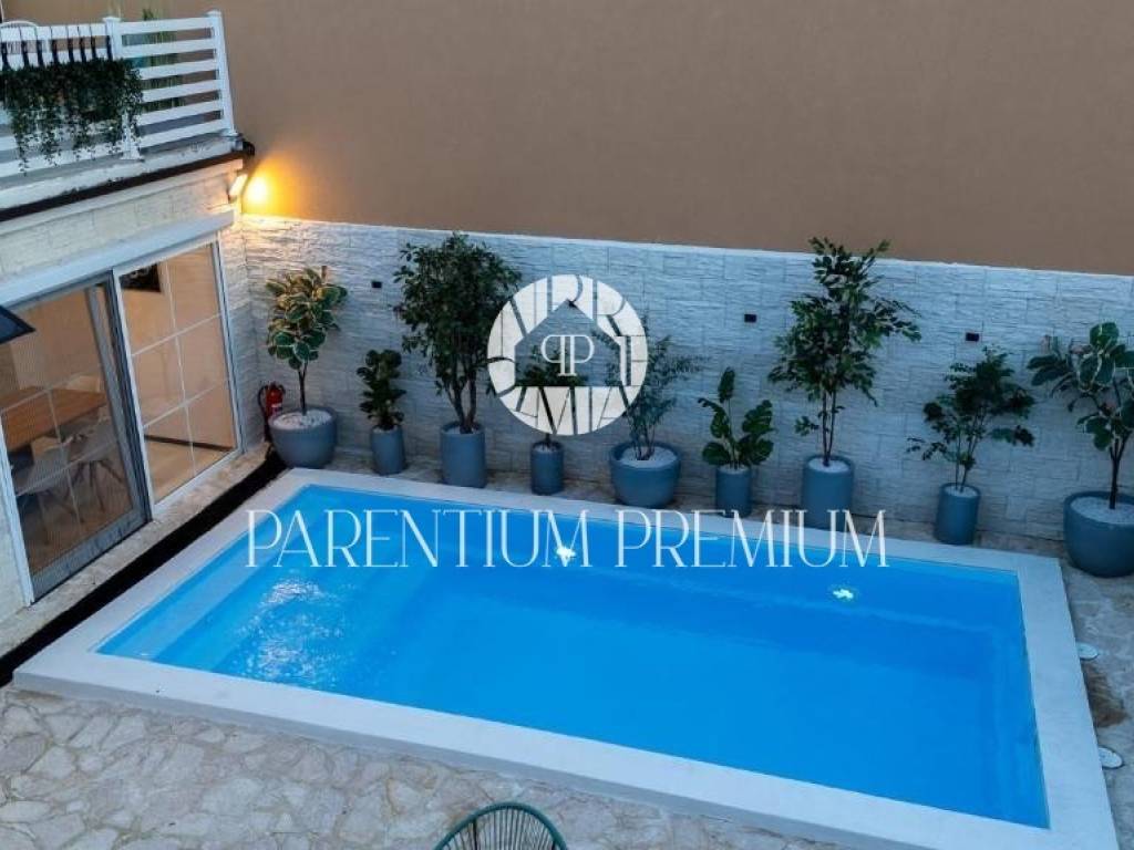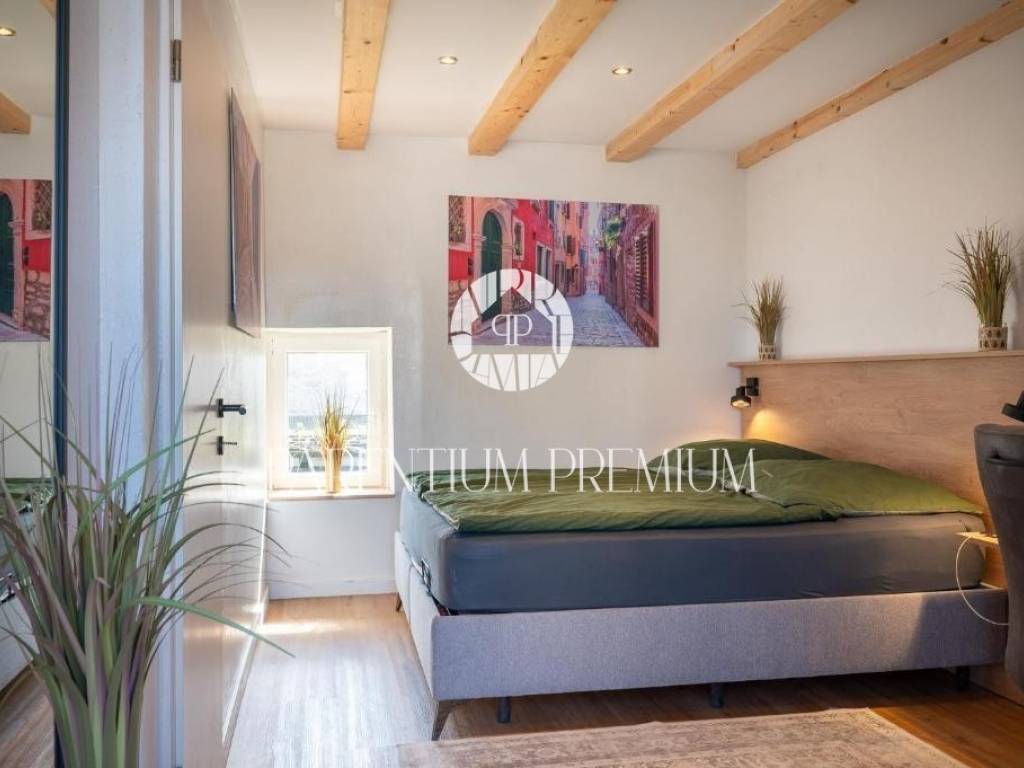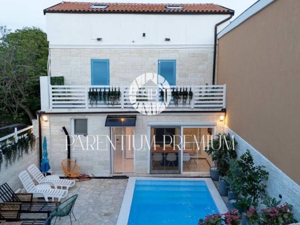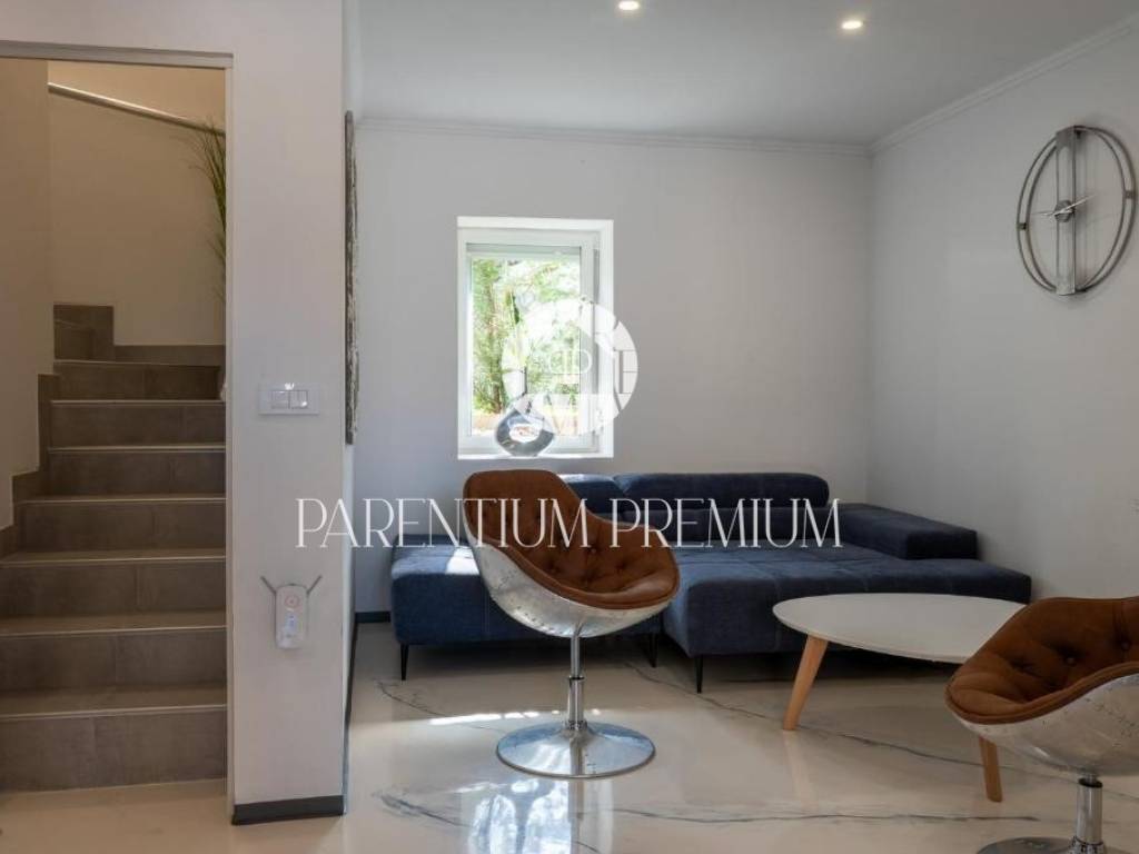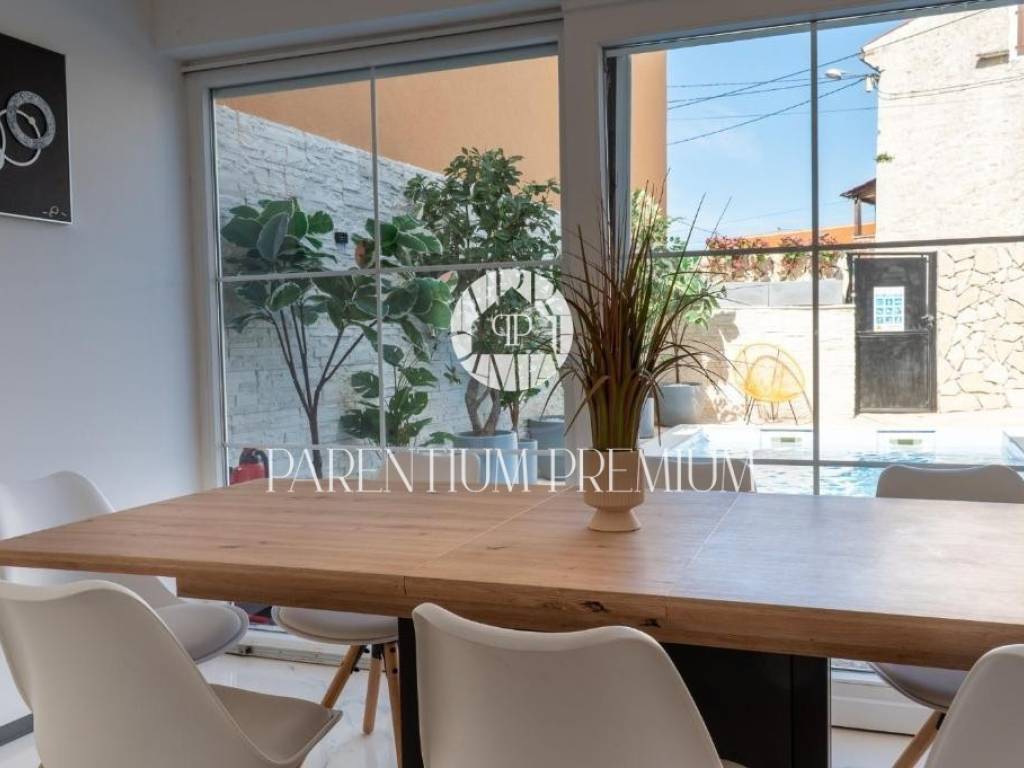 With a total living area of 140 m spread over three floors, this property represents a harmonious blend of authentic Istrian architecture and modern comfort. On the ground floor, the living room, kitchen and dining area are functionally separated yet visually connected, maintaining a sense of openness and flow. Stone walls and carefully selected details create a warm and elegant atmosphere. From the dining area, large glass walls lead to a terrace and an intimate courtyard of approx. 70 m with a private 18 m swimming pool (electrolysis system) and sunbathing area, enclosed by a stone wall and greenery ensuring full privacy.