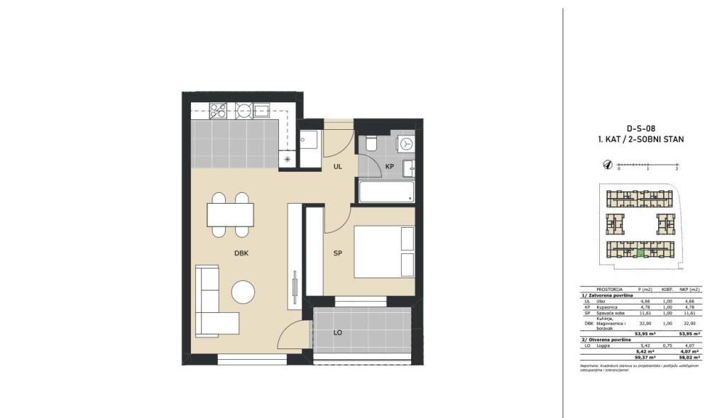Dvosoban stan na 1. katu stambene zgrade zatvorene površine 53,95 m2 s loggiom 5,42 m2 (4,07 m2), ukupne neto površine 58,02 m2.Stan D-8 sastoji se od ulaznog hodnika, kuhinje s blagovaonicom i dnevnim boravkom, spavaće sobe, kupaonice i loggie.Obvezna kupnja spremišta, vanjskog ili garažnog parkirnog mjesta.Stan se nalazi u višestambenoj zgradi unutar kompleksa koji će se sastojati od 165 stambenih jedinica.Green Side Residence nalazi se u Velikoj Gorici, samo 10 kilometara od Zagreba i tek 3 kilometra od Međunarodne zračne luke Zagreb, lokacija nudi izvrsnu prometnu povezanost s glavnim gradom i cijelom Hrvatskom, zahvaljujući neposrednom pristupu dvjema autocestama.Okružen zelenilom, a opet u blizini svih gradskih sadržaja, ovaj projekt predstavlja idealan izbor za miran, ali povezan život.Useljenje 11/2027. godine.Za sve ostale informacije stojimo na raspolaganju.... Više na eurovilla.hr, ID: 335391