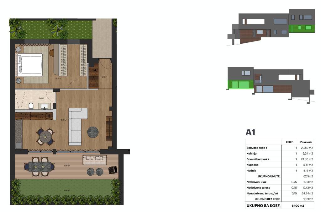 Maksimir, Barutanski jarak, NOVOGRADNJA, vrhunska lokacija okružena zelenilom i prirodom, a opet u neposrednoj blizini centra grada i parka Maksimir. Projekt luksuzne zgrade građene prema najvišim standardima s ukupno 4 stana. Useljenje ljeto 2026. godine.Stan A1 - dvosoban stan u prizemlju zatvorene površine 62,50 m2, natkriveni ulaz 2,33 m2, natkrivena terasa 17,43 m2, vrt 24,84 m2. Stan se sastoji od ulaznog prostora, dnevnog boravka, blagovaonice i kuhinje otvorenog tlocrta s izlazom na terasu i vrt, spavaće sobe s garderobom i kupaonice. Ukupno obračunski netto korisna površina 81,00 m2.Zgradu i stanove odlikuje najviši stupanj opreme i suvremena tehnologije u pogledu instalacija i upravljanja istima, dok energetska učinkovitost zadovoljava najviše standarde.Vrhunska keramika - Vives Ceramica (zid), Iris Ceramica 120 x 60 cm (pod), Mirage 80 x 80 cm (pod outdoor).Ulazna vrata- Aluminijska protuprovalna vrata Antracit s obje strane + Rukohvat 1800 mm (HLM). Sobna vrata- Filomuro vrata po mjeri RAL 9016. Vanjska stolarija - PVC + Aluminij s roletama na električno upravljanje (troslojno staklo).Sanitarije više klase - miješalica wc zidna podžbukna Zuchetti Pan Brushed Nickel, tuš zidni podžbukni set s kišnim tušem 250fi Zucchetti Pan Brushed Nickel, wc školjka globo ceramica (no rim , sporo spuštajuća daska , konzolna), tipkalo soft touch TECE, vodokotlić ugradbeni TECE profil.Parket Galeković četkani hrast 600 x 1800 x 15 mm višeslojni. Grijanje - podno plinsko. Hlađenje - Klima jedinice Mitsubishi (spavaća soba, dnevni boravak). Ulaz - kamera na prepoznavanje tablica i električno upravljanje vratima.Obavezna kupnja garažnog i vanjskog parkirnog mjesta.Prekrasna lokacija s puno privatnosti idealna za uživanje, mirno i kvalitetno življenje. Dobra prometna povezanost, blizina svih potrebnih sadržaja.Za sve ostale informacije stojimo na raspolaganju.... Više na eurovilla.hr, ID: 341851