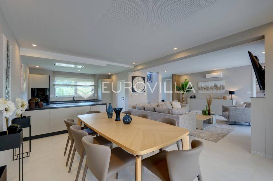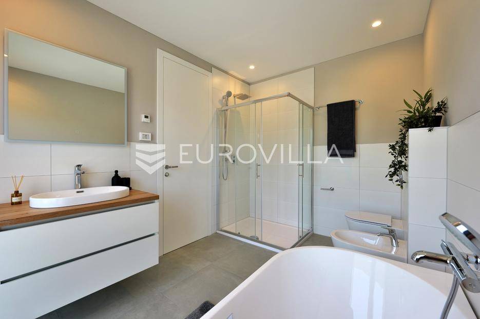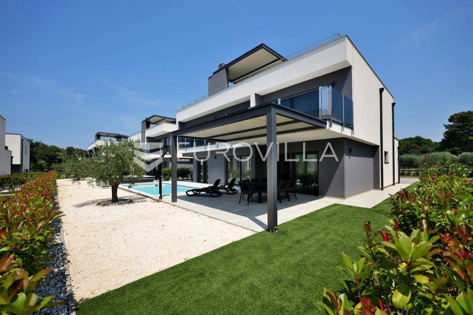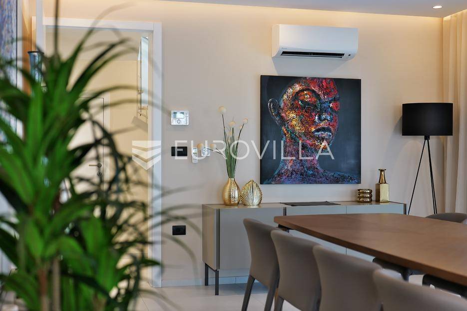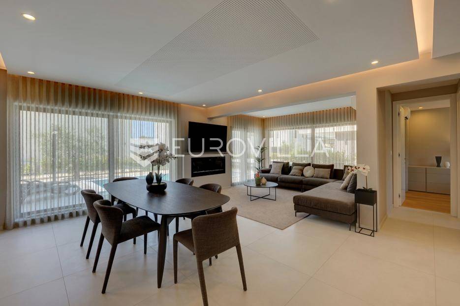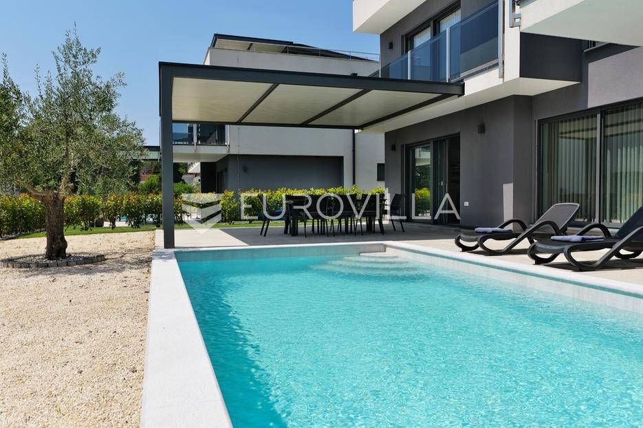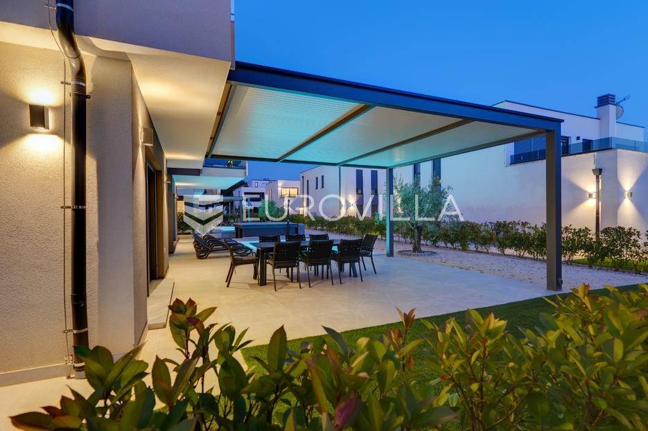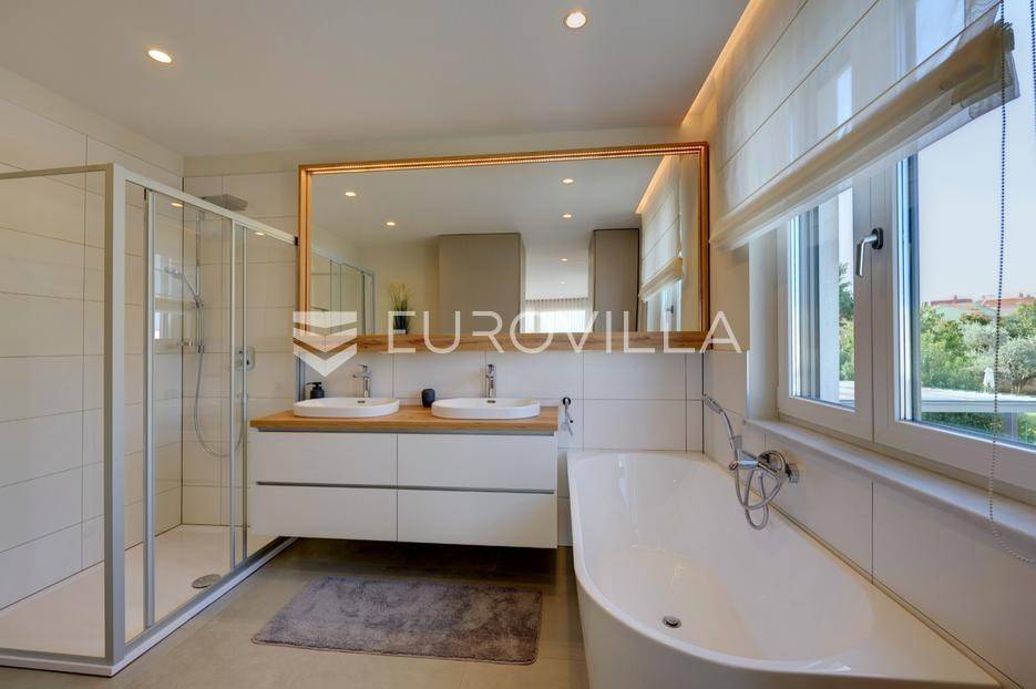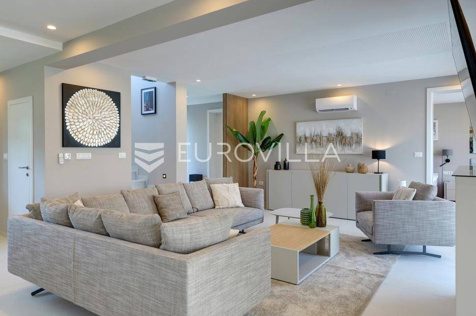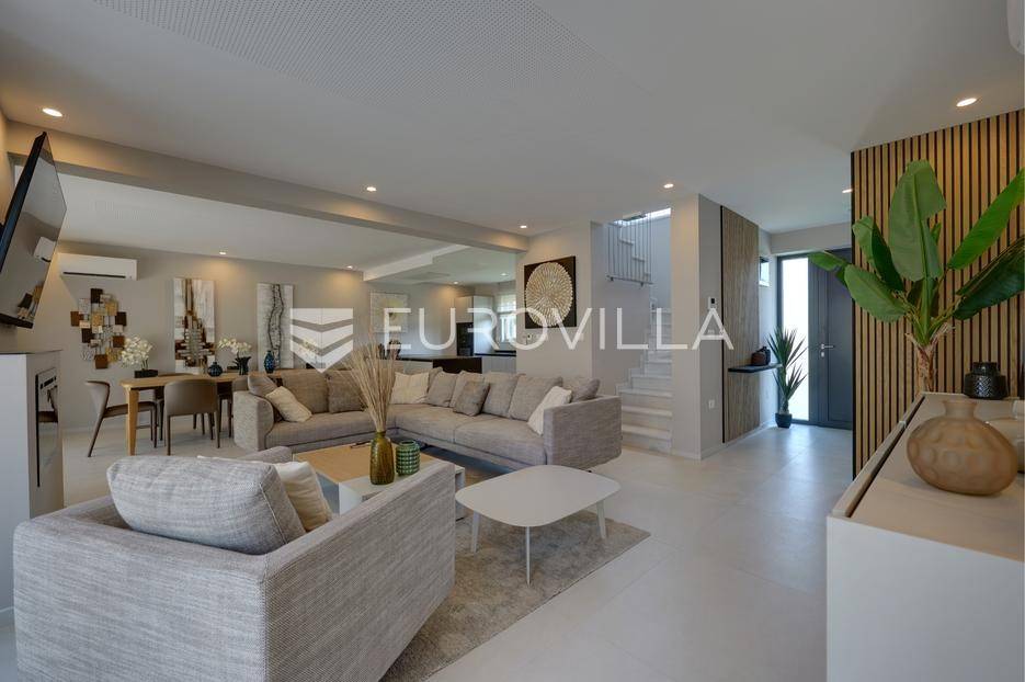 Smještena u pitoresknom i mirnom dijelu Pomera, u srcu Općine Medulin, ova izvanredna samostojeća vila predstavlja oličenje suvremenog luksuza i udobnosti. Izgrađena 2024. godine kao novogradnja, vila se prostire na impresivnih 286 m2 neto korisne površine, unutar prostrane i brižno uređene okućnice od 500 m2. Njezina lokacija je idealna: samo 400 metara udaljenosti od kristalno čistog mora i predivnih plaža, s orijentacijom jug-zapad koja osigurava obilje sunca i fantastičan pogled na more i obližnju marinu. Ova nekretnina nudi savršen spoj privatnosti, elegancije i praktičnosti, idealna za obiteljski život, opuštajući odmor ili kao izvrsna investicija u turističkom najmu.Po ulasku u posjed, dočekuje vas prostrana garaža namijenjena za dva vozila, iz koje je omogućen direktan pristup u unutrašnjost vile, pružajući dodatnu razinu komfora i sigurnosti. Prizemna etaža dominira otvorenim konceptom prostranog dnevnog boravka, raskošne kuhinje i elegantne blagovaonice, stvarajući fluidan i prozračan prostor idealan za obiteljska okupljanja i zabavu. Kuhinja je opremljena najmodernijim aparatima i vrhunskim materijalima, dok toplinu dnevnom boravku daje elegantni kamin. Velike staklene klizne stijene s troslojnim staklom ne samo da osiguravaju iznimnu prirodnu svjetlost, već i nude nesmetan izlaz na natkrivenu terasu i impresivan bazen, stvarajući savršenu simbiozu unutarnjeg i vanjskog prostora. Ova vanjska zona je idealno mjesto za opuštanje, blagovanje na otvorenom i uživanje u mediteranskom suncu. U prizemlju se nalazi i jedna prostrana spavaća soba s vlastitom kupaonicom, pružajući privatnost i udobnost gostima ili starijim članovima obitelji.Unutarnje stubište, elegantnog dizajna, vodi na prvu etažu gdje se u centralnom dijelu nalazi dodatan dnevni prostor, savršen kao kutak za opuštanje, čitanje ili druženje. Na ovoj etaži smještene su još tri luksuzno opremljene spavaće sobe, svaka s vlastitom modernom kupaonicom, osiguravajući maksimalnu privatnost i komfor za svakog ukućana. Svaka je soba pažljivo dizajnirana s naglaskom na udobnost i funkcionalnost, s ugradbenim ormarima i pogledima koji obogaćuju prostor. Prevladavaju neutralne boje koje prostor čine elegantnijim i suvremenijim, ostavljajući dojam sofisticiranosti i smirenosti.Posebnost ove vile je njezina prostrana krovna terasa, dostupna također unutarnjim stubištem. Djelomično natkrivena, ova terasa nudi spektakularan panoramski pogled na more, živopisnu marinu i okolni slikoviti krajolik. Predviđena je kao ultimativna zona za zabavu i opuštanje, s prostorom za sunčanje, pripremu roštilja i lounge zonu, čineći je idealnim mjestom za večernja druženja pod zvijezdama i uživanje u nezaboravnim zalascima sunca. Zamislite samo ljetne večeri provedene ovdje, uz povjetarac s mora i miris borova, stvarajući uspomene za cijeli život.Vila je opremljena najsuvremenijom tehnologijom, uključujući napredan "Smart Home" sustav koji omogućava jednostavno upravljanje rasvjetom, sustavom grijanja i hlađenja, te sigurnosnim značajkama putem pametnog telefona. Grijanje je osigurano putem energetski učinkovitog sustava toplinske pumpe, s podnim grijanjem i fan-coil uređajima koji osiguravaju optimalnu temperaturu tijekom cijele godine, dok je svaka prostorija individualno klimatizirana. Kvaliteta izrade i odabir materijala su na najvišoj razini, od visokokvalitetne keramike i sanitarija do pažljivo odabranih podova, što doprinosi trajnosti i estetskoj privlačnosti nekretnine. Okućnica je pažljivo hortikulturno uređena, s automatskim sustavom navodnjavanja, stvarajući zelenu oazu mira i ljepote.Lokacija u Pomeru nudi savršenu ravnotežu između mirnog života i blizine svih potrebnih sadržaja. Medulin sa svojim raznolikim restoranima, trgovinama i marinom udaljen je tek nekoliko minuta vožnje, dok se do grada Pule s bogatom kulturnom baštinom, zračnom lukom i svim urbanim sadržajima stiže za petnaestak minuta. Blizina mora omogućuje jednostavan pristup prekrasnim plažama idealnim za plivanje, sunčanje i razne vodene sportove. Ovo je rijetka prilika za posjedovanje nekretnine koja nudi beskompromisan luksuz, udobnost i iznimnu lokaciju, savršenu za one koji traže premium životni stil na istarskoj obali. Ne propustite priliku postati vlasnikom ove izuzetne vile koja spaja eleganciju, funkcionalnost i pogled na more. Za sve dodatne informacije i organizaciju razgledavanja, stojimo Vam na raspolaganju.... Više na eurovilla.hr, ID: 371689