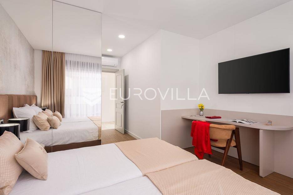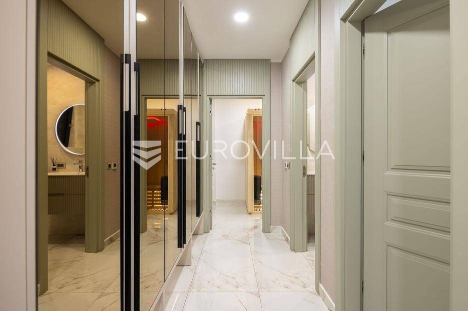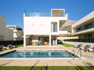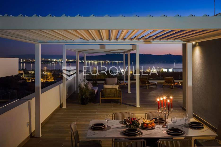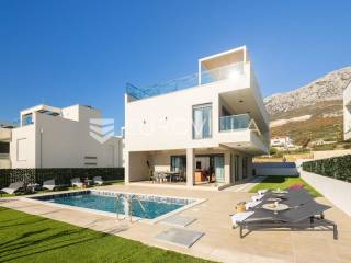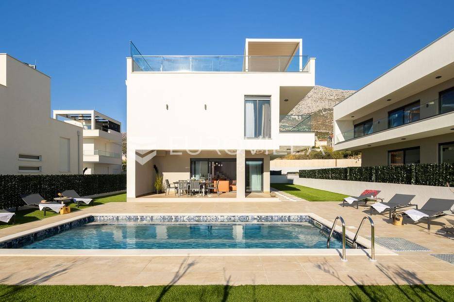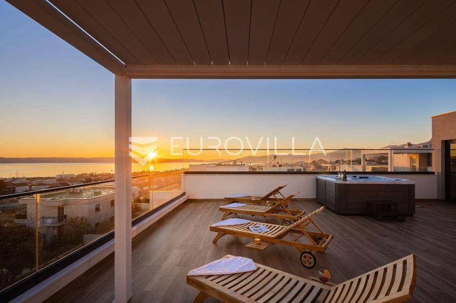 Kaštel Sućurac, luksuzno uređena samostojeća i vrhunski opremljena vila s grijanim vanjskim bazenom te otvorenim pogledom na more. Smještena je na parceli od 550 m2, u novoizgrađenom privatnom naselju ekskluzivnih vila na relaciji Split - zračna luka.Vila se prostire na tri etaže.U prizemlju se nalazi otvoreni dnevni prostor s potpuno opremljenom kuhinjom i izlazom na terasu i vrt, dok su u sjevernom dijelu smješteni zajednički WC, praonica, ostava i sauna.Na prvome katu nalaze se četiri spavaće sobe, svaka s vlastitom kupaonicom i izlazom na terasu.Druga etaža predstavlja prostranu krovnu terasu opremljenu jacuzzijem, roštiljem i natkrivenim kutkom za opuštanje.Sve prostorije imaju podno grijanje i individualne klima uređaje.Nekretnina se prodaje putem tvrtke, a kupac je oslobođen plaćanja 3 % poreza.Za sve dodatne informacije, stojimo vam na raspolaganju.... Više na eurovilla.hr, ID: 372337