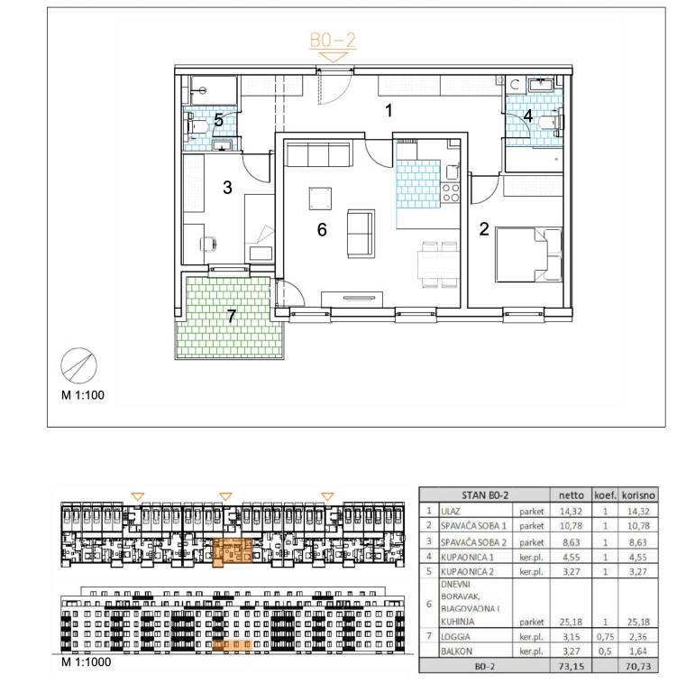 Trosoban stan površine 70,73 m2 smješten u prizemlju.Stan B0-2 sastoji se od ulaza, 2 spavaće sobe, 2 kupaonice, dnevnog boravka, kuhinje s blagovaonicom, loggije te balkona.Velika Gorica, projekt stambene novogradnje namijenjen stalnom stanovanju, koji obuhvaća 91 stambenu jedinicu. U sklopu zgrade osigurano je ukupno 182 garažnih i parkirnih mjesta, od čega je 28 garažnih mjesta smješteno u prizemlju, 97 garažnih i parkirnih mjesta u podzemnoj etaži te dodatnih 57 parkirnih mjesta na razini terena.Uz kupnju stana obavezna je kupnja garažnog mjesta na -1 etaži po cijeni od 25.000,00 EUR ili garažnog mjesta na 0 etaži po cijeni od 30.000,00 EUR zajedno s parkirnim garažnim mjestom po cijeni od 18.000,00 EUR ili vanjskim parkirnim mjestom po cijeni od 10.000,00 EUR. Dakle, garažno mjesto na -1 etaži ili garažno mjesto na 0 etaži + garažno parkirno mjesto ili vanjsko parkirno mjesto.Građevina je projektirana kao armiranobetonska konstrukcija, međusobno povezana zidovima i gredama, s punim armiranobetonskim stropnim pločama i ravnim krovom. Vertikalni konstruktivni sustav čine armiranobetonski zidovi debljine 20 cm izvedeni kroz sve etaže, dok horizontalni sustav čine armiranobetonske ploče debljine 20 cm.Pročelje je predviđeno s toplinskom izolacijom debljine 15 cm u ETICS sustavu, izvedenom od EPS-a, a u zonama požarnih prekida, u kontaktu sa stubištem i na podgledu prizemlja od mineralne vune iste debljine. Završna obrada izvodi se armiranom mrežicom, gletanjem i završnim slojem u boji i teksturi prema projektu. Vanjska stolarija predviđena je kao PVC, u tonu definiranom projektom.Krov je projektiran kao ravni neprohodni krov, a svi slojevi izvedeni su u skladu s projektom fizike zgrade. Unutarnji pregradni zidovi izvode se kao gipskartonski, debljine 10 do 20 cm, ovisno o namjeni prostora, uz primjenu potrebne zvučne izolacije gdje je to predviđeno. Zidne površine su završno obrađene soboslikarskim radovima u boji prema projektu.Podovi u stanovima izvode se kao plivajući sustav s toplinskom izolacijom od polistirena i cementnim estrihom. Završne podne obloge predviđene su prema namjeni prostora: keramika u sanitarijama, kuhinjama i na vanjskim površinama, a troslojni hrastov parket u dnevnim boravcima, blagovaonicama, ulaznim prostorima i spavaćim sobama. U ponudi su tri varijante keramičkih pločica.Grijanje je riješeno plinskim etažnim podnim sustavom. Stanovi su opremljeni klima uređajima marke Bosch, PVC stolarijom s električnim roletama, troslojnim hrastovim parketom te sobnim vratima proizvođača RV Križevci. Ulazna vrata u stanove su protuprovalna, proizvođača Kolnoa sa sustavom zaključavanja Multilock.Useljenje 05/27Za sva pitanja Vam stojimo na raspolaganju.... Više na eurovilla.hr, ID: 377680