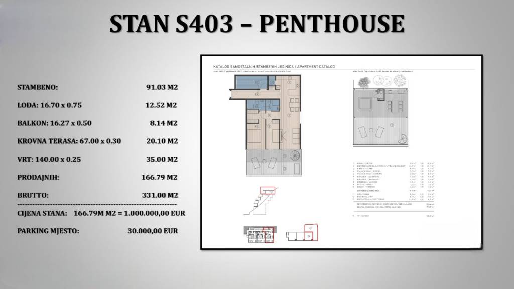 Jesenice, S403- penthouse položen na četvrtom katu zgrade u izgradnji neto površine 166,79 m2. Sastoji se od dvije spavaće sobe, kuhinje, blagovaonice i dnevnog boravka otvorenog tlocrta, garderobe, dvije kupaonice, toaleta, lođe od 16,70 m2, balkona 16,27 m2 te krovne terase (67m2) s vrtom (140m2). Pripada mu spremište. Orijentacija jug-istok.Mogućnost kupnje garažnog parkirnog mjesta po cijeni od 30.000,00 Eura. (garaža s rampom, 2 mjesta jedno ispod drugog).Kupac ne plaća porez na promet nekretnina.Početak gradnje jesen 2024.Planirani završetak gradnje jesen 2026.Ovu nekretninu je moguće kupiti putem kredita banke.Glavna prednost ove nekretnine je otvoren pogled na more sa svih etaža, smještena je iznad ceste, 1. red uz more i lijepu plažu, između tursitičkih središta Splita i Omiša.Ostale informacije na upit.... Više na eurovilla.hr, ID: 740108