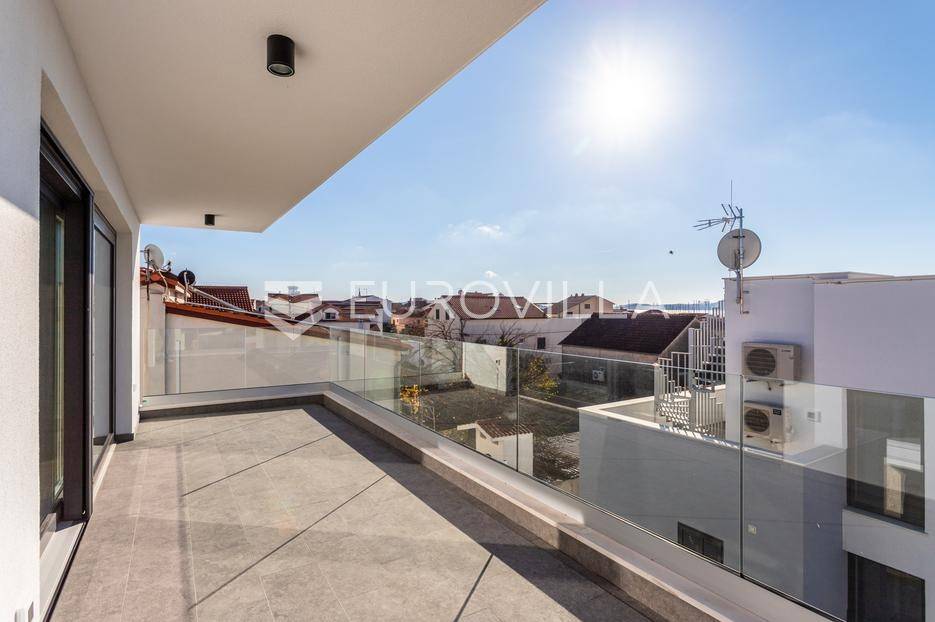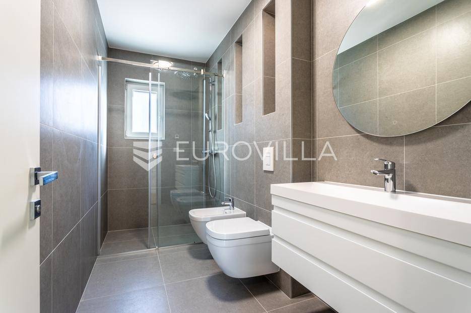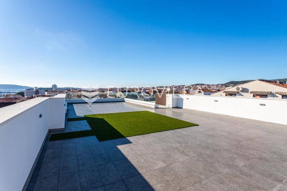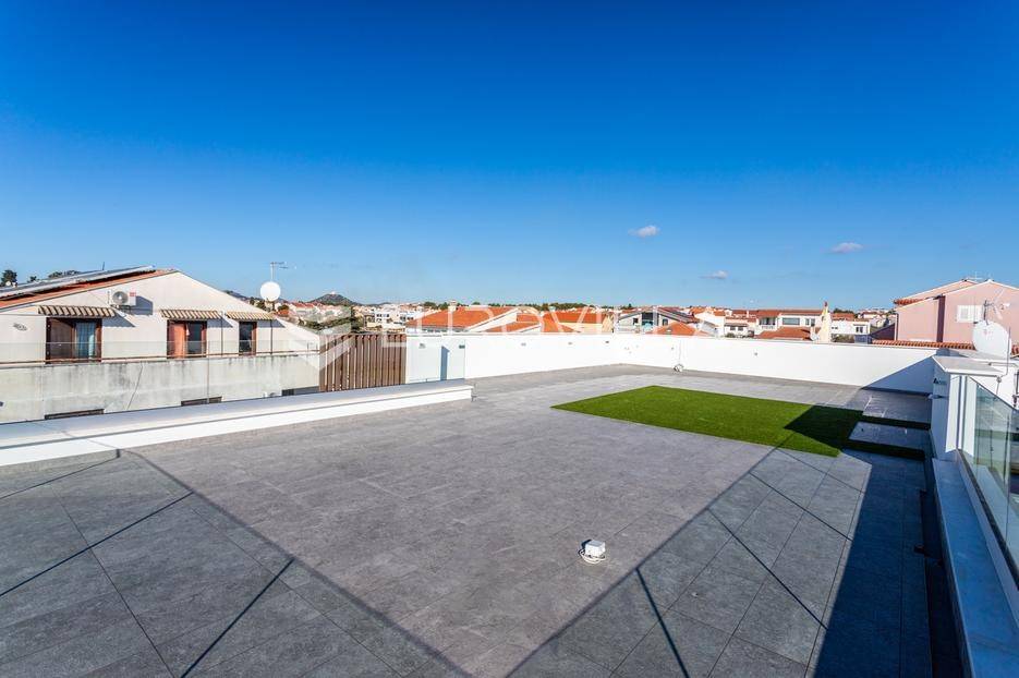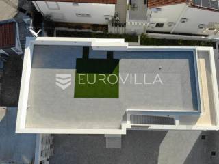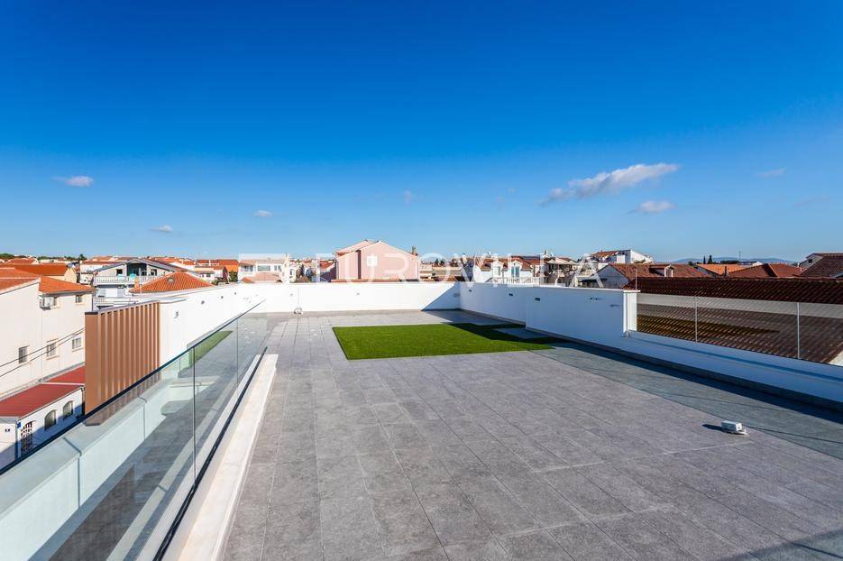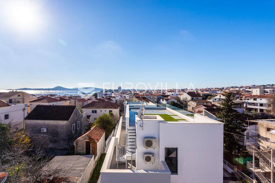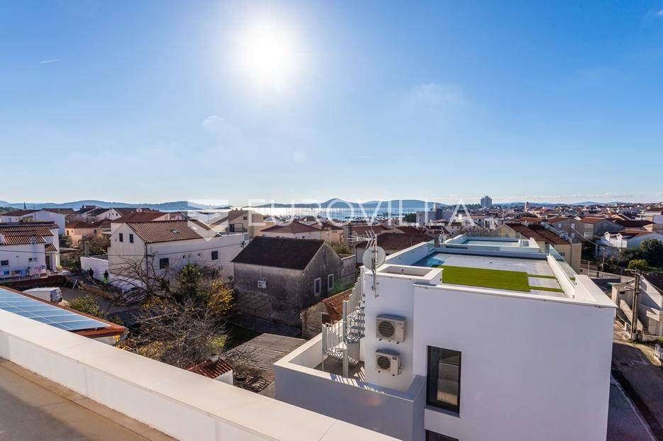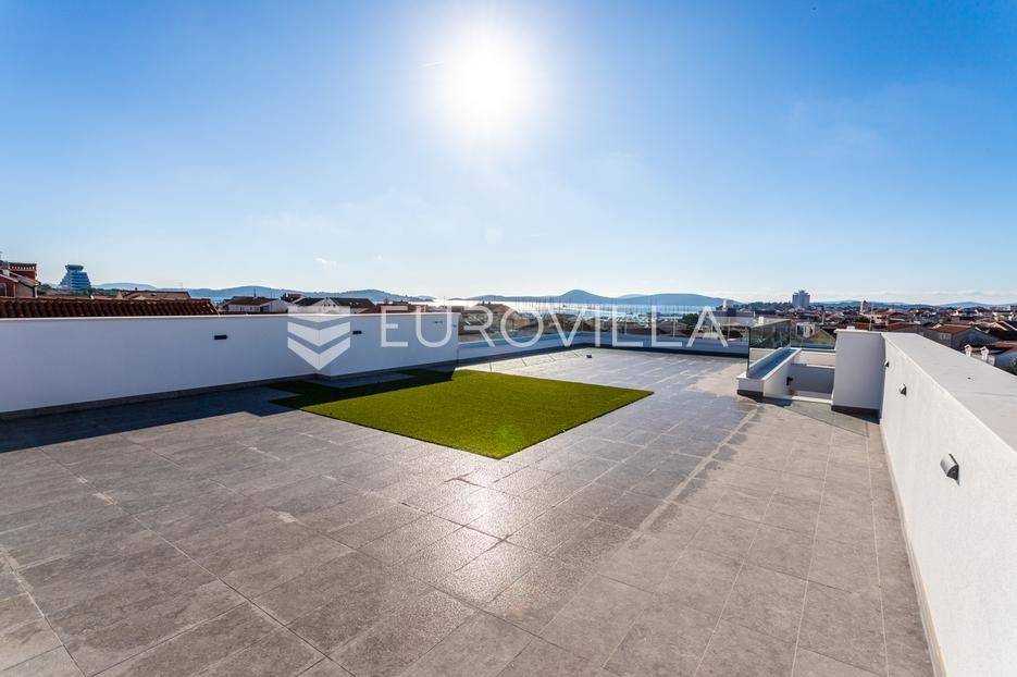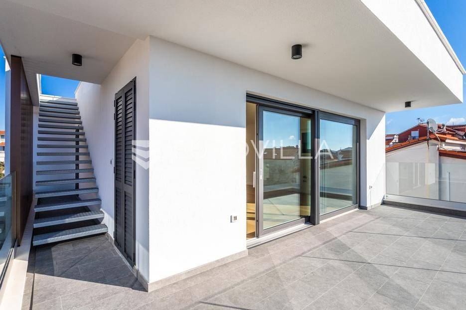 Na iznimnoj lokaciji u centru Vodica, svega 200 metara od mora, nalazi se ovaj prostrani penthouse na drugom katu novogradnje visoke kvalitete, neto korisne površine 141,80 m². Stanu pripadaju dva privatna parkirna u dvorištu zgrade, te krovna terasa koja se prostire cijelom površinom krova. Ukupna zatvorena površina stana iznosi 89,58 m².Stan je funkcionalno i moderno osmišljen, a sastoji se od prostranog dnevnog boravka s kuhinjom i blagovaonicom, tri spavaće sobe, kupaonice te zasebnog toaleta. Iz dnevnog boravka izlazi se na veliku terasu površine 41,63 m², te dalje stepenicama na krovnu terasu površine 115,05 m², opremljenu jacuzziem, vanjskim tušem i pergolom ispod koje je predviđena ljetna kuhinja.Zgrada je građena prema najvišim standardima gradnje i opreme. Izdvajamo:podno grijanje na toplinsku pumpuMitsubishi klima uređaje u svim prostorijamavrhunsku stolariju s troslojnim staklomvideo parlafonpripremu za punionicu električnih vozila na parkirnom mjestupametnu parking rampu s očitavanjem registarskih oznakaLokacija zgrade dodatno povećava vrijednost nekretnine - mirna, a istovremeno centralna pozicija, na nekoliko minuta hoda od mora, plaže i svih sadržaja, čini ovu novogradnju jednom od rijetkih i najpoželjnijih u ovom dijelu Vodica.Za sve dodatne informacije i razgledavanje, slobodno nas kontaktirajte.... Više na eurovilla.hr, ID: 842874