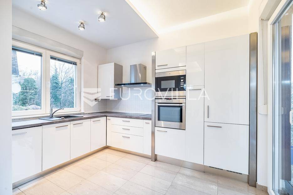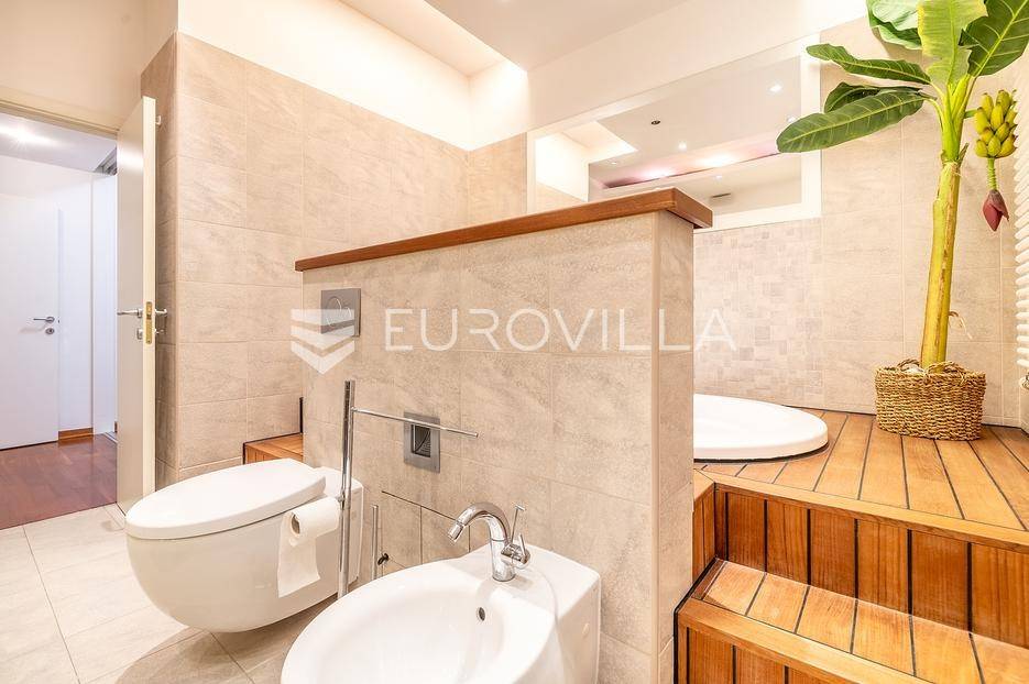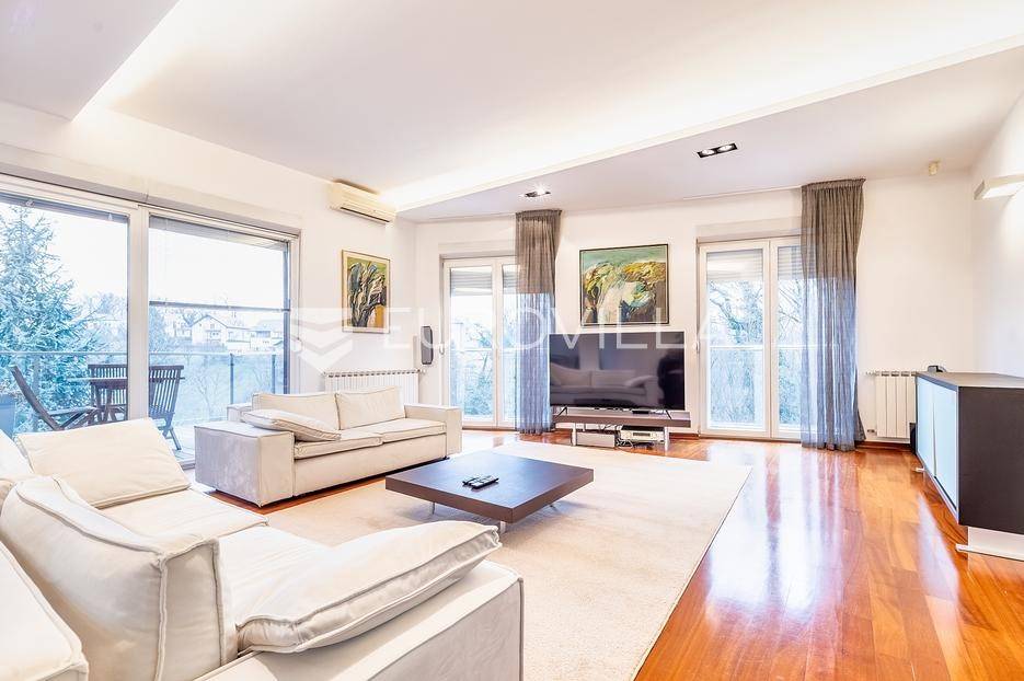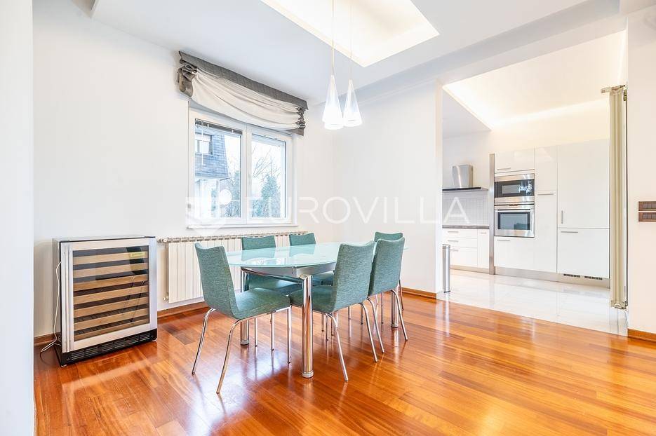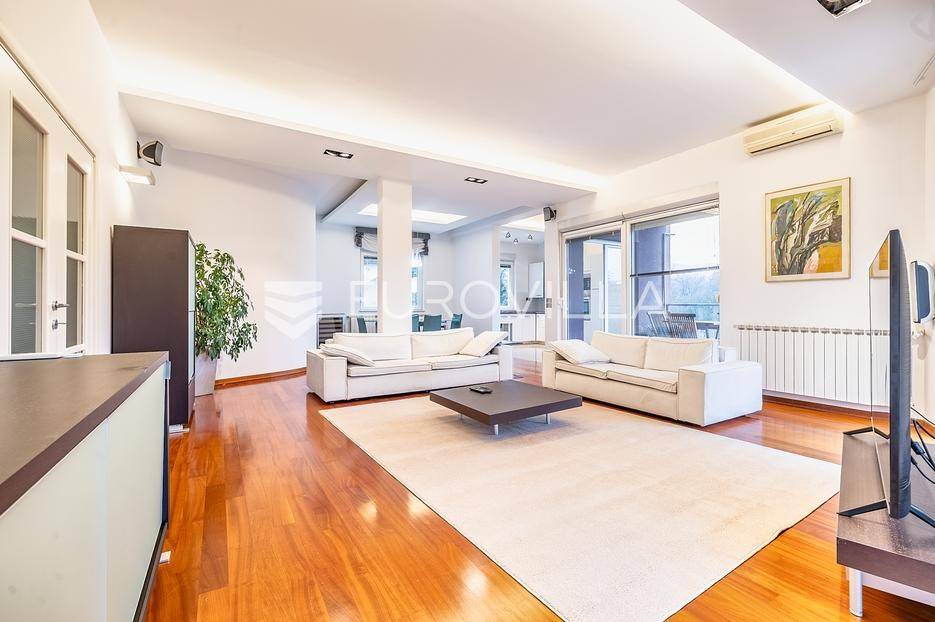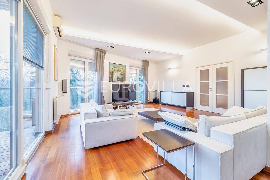 Pantovčak, prekrasno uređen četverosoban stan 163 m2 sa jugoistočnom natkrivenom terasom i garažom. Ukupno obračunski 170m2. Novije građena zgrada (2005 god.), nije niti malo stradala u potresu.Sastoji se od prostranog dnevnog boravka sa kuhinjom, blagovaonicom i terasom, toaleta, 3 komforne spavaće sobe, ogromne kupaonice sa Jacuzzi kadom i tušem te garderobe. Visina stropa 3m. Protuprovalna vrata, alarm, klimatizirane sve prostorije, etažno plinsko grijanje. Kompletno namješten i opremljen. Kuhinja sa svim aparatima, Molteni namještaj, vinski frižider, nove televizije. Izuzetno mirna lokacija, prekrasan pogled u šumu, orjentacija istok jug. Odlično susjedstvo. Ostale informacije na upit.... Više na eurovilla.hr, ID: 848350
