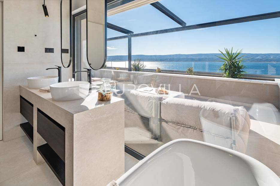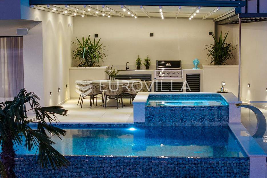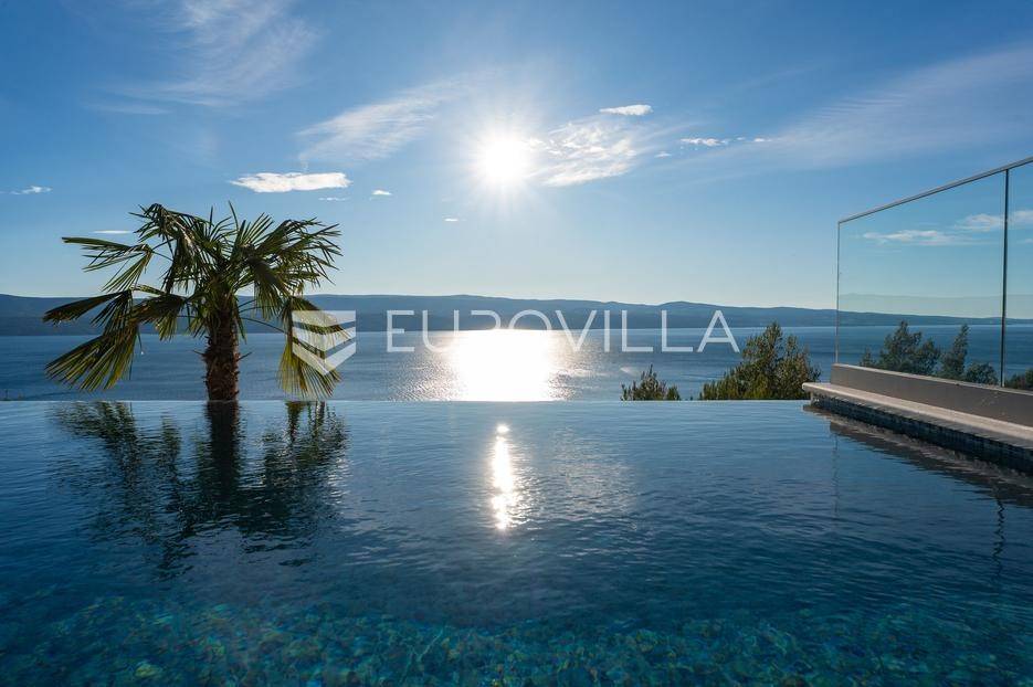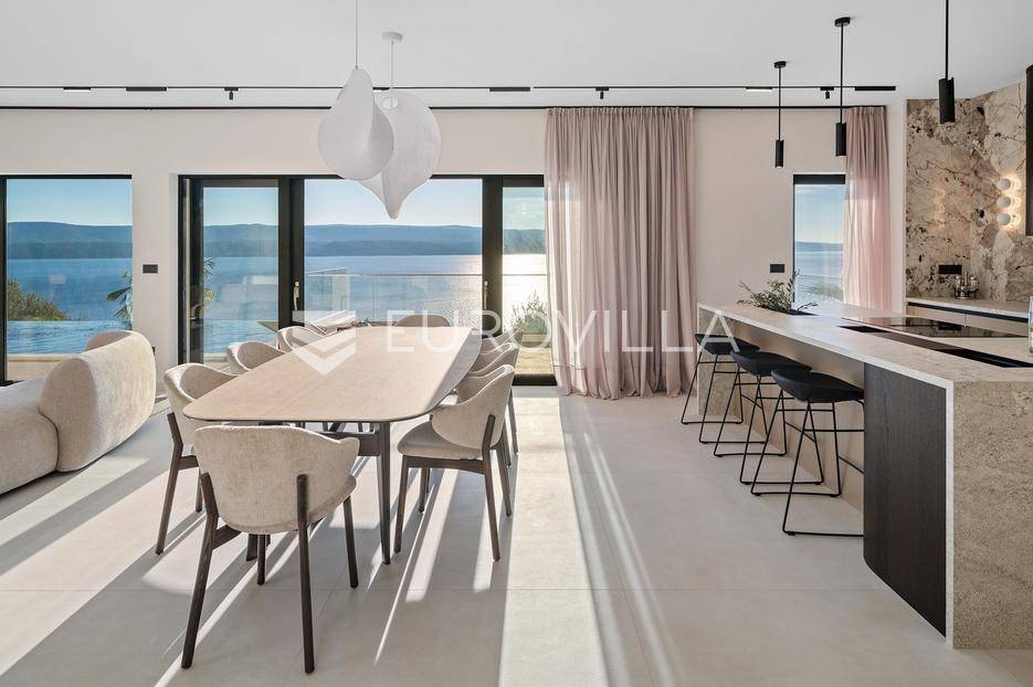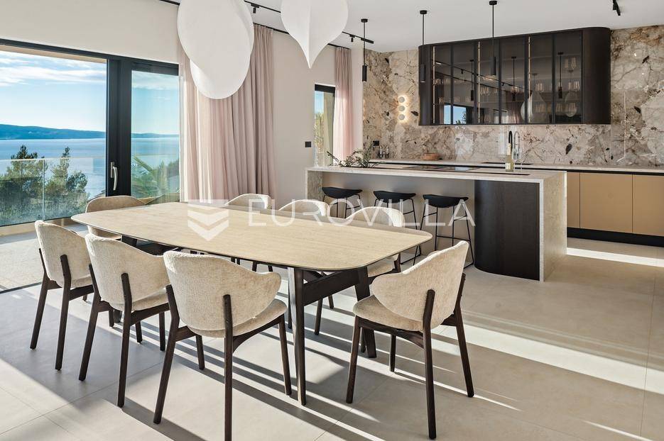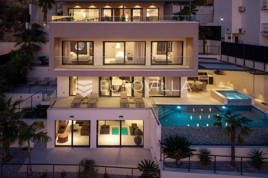 Elegantna luksuzna vila na četiri etaže, raspolaže s pet komfornih soba, svaka s vlastitom kupaonicom, master soba s walk-in garderobom. Veliki dnevni boravak s kuhinjom i blagovaonicom, prostorija za zabavu s teretanom i saunom, vanjski infiniti bazen s jacuzzijem.Vila modernog dizajna, visokog standarda kvalitete gradnje i stupnja opremljenosti, smještena na uzvisini s prekrasnim panoramskim pogledom na more s svake etaže.Bruto površina kuće od 416 m2, neto 397 m2, smještena je na parceli veličine 605 m2 koja se nalazi na 300 m od mora.Proteže se na četiri etaže, bazen na donjoj etaži suterena kao iz cijelog objekta s prekrasnim pogledom na more. Pozicija je takva da osigurava potpunu privatnost vlasnika, a sastoji se od: suterena, prizemlja, te prvog i drugog kata, a svake etaže prekrasan pogledom na more.Na vrhu objekta gornja etaža drugog kata nalazi se garaža za dva automobila, te parking za četiri automobila.Suteren se sastoji od: velike prostorije od 66 m2 s pogledom na more namijenjene za zabavu s mini teretanom, saunom, kupaonicom tehničke sobe, wc-a i praonice.Prizemlje se sastoji od: kuhinje s blagovaonice i prostranog dnevnog boravka otvorenog tipa (62 m2), zajednički WC, djelomično natkrivene terasom na kojoj je infiniti bazen s jacuzzijem i sunčalištem sve s prekrasnim pogledom, vrt sa zasađenim biljem i ugrađenim sistemom za samo zalijevanje.Na prvom katu nalaze se tri prostrane komforne spavaće sobe s vlastitom kupaonicom i izlazom na prostranu lođu, manja soba s WC-om, hodnik, tri sobe su na jugu i iz svake se pruža prekrasan panoramski pogled na more kao i s terase.Na vrhu jedna spavaća soba s kupaonicom te velika prostrana terasa natkrivena pokretnom pergolom na koju je postavljen jacuzzi a sve ima očaravajući panoramski pogled na more.Sve sobe i prostorije su klimatizirane inverter klimama, u cijelom objektu je instalirano podno grijanje. Visoka energetska učinkovitost osigurana je stiropor fasadom debljine 10 cm izvana te iznutra kamenom vunom 6 cm, pregradni zidovi unutar objekta su knauf ploče i akustična vuna što osigurava vrhunsku zvučnu izolaciju. Na krovu su smješteni solarni sistem za toplu vodu, stepenište unutar objekta je kamen uz integriranu led rasvjetu uz ogradu os stakla koja naglašava eleganciju i luksuz.Svi zavori su zatvori antracit aluminijski, troslojna stakla, automatizirane rolete, visokokvalitetni kamen u objektu i izvan njega, ograda oko objekta, oluci u fasadi,....Sama vila se nalazi na mirnoj lokaciji, idealna za sve koji žele mir i privatnost u lijepom i prirodnom okružju. Odlična atmosfera i luksuzno opremljena kuća za odmor idealna su kombinacija za ugodan odmor. Bazen, zajednički salon za druženja mini teretana s saunom izvrsni su za opuštanje i sve to u privatnom ozračju ograđene parcele - jednostavno savršeno.Pored Omiša u mirnom manjem turističko mjestu od Splita glavnog grada Dalmacije, udaljeno 15-tak km, a od zračne luke Split 30 km. Svi sadržaji potrebni za ugodan odmor te za svakodnevni život: trgovine, restorani,... Pješčane i šljunčane uređene plaže povezan šetnicom uz more protežu se kilometrima.Novoizgrađena vila, potpuno namještena i opremljen spreman za prvo useljenje.Za sve dodatne informacije stojimo Vam na raspolaganju.... Više na eurovilla.hr, ID: 941171