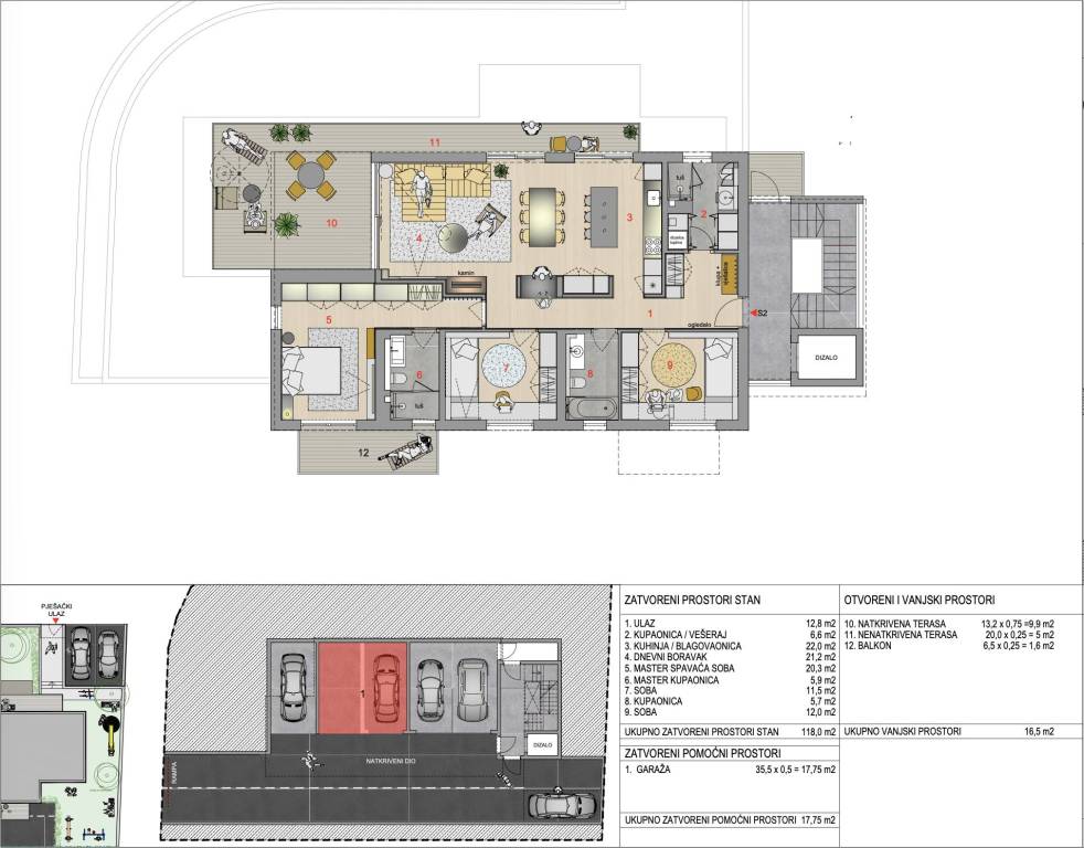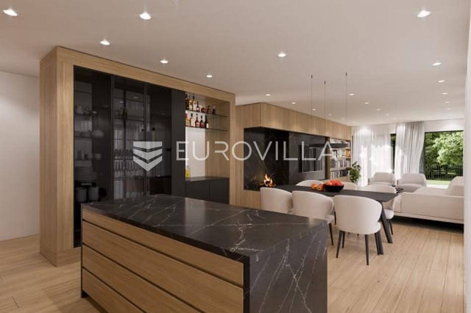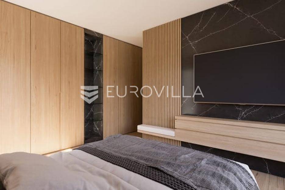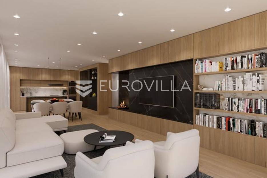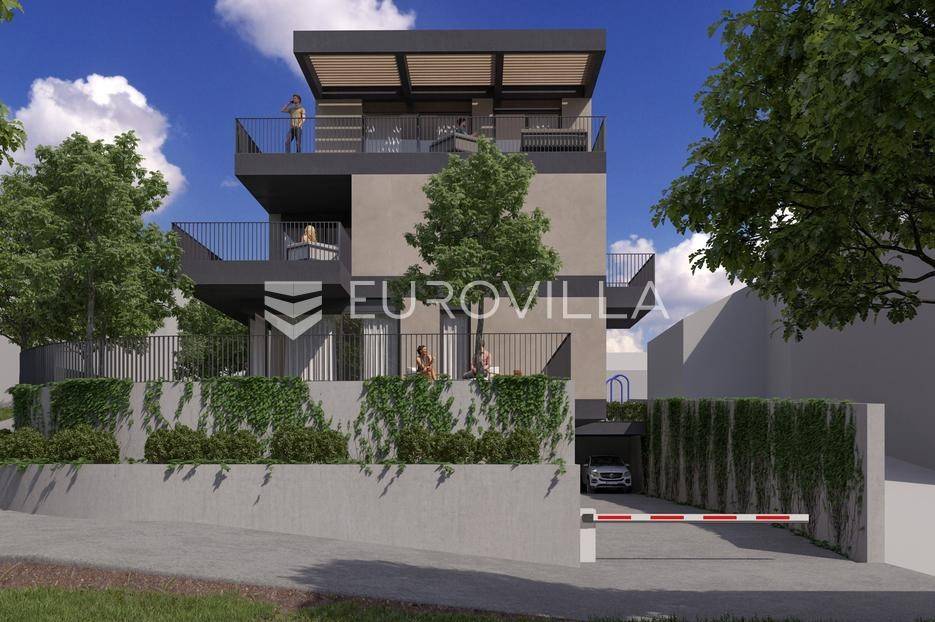 Srebrnjak, NOVOGRADNJA, luksuzan četverosoban stan na 1. katu stambene zgrade zatvorene površine 118 m2 s natkrivenom terasom 13,20 m2 (9,90 m2), nenatkrivenom terasom 20 m2 (5 m2), balkonom 6,50 m2 (1,60) i garažom 35,50 m2 (17,75 m2), ukupne neto korisne površine 152,25 m2.Sastoji se od ulaznog hodnika s garderobom, dnevnog boravka s kuhinjom i blagovaonicom, master sobe s kupaonicom, dvije spavaće sobe, dvije kupaonice, natkrivene i nenatkrivene terase i balkona. Jedan stan na etaži, trostrano orijentiran - sjever, zapad i jug.KNX sustav, CORTIZO aluminijska vanjska stolarija. Grijanje i hlađenje stropnim sistemom preko dizalice topline Daikin, odvlaživanje preko klima jedinice Daikin.Stanu pripada garaža za dva vozila.KONSTRUKTIVNI ELEMENTI ZGRADENosiva konstrukcija je izvedena kompletno kao armiranobetonska. Zgrada se temelji na temeljnoj ploči debljine 50 cm. Vertikalnu nosivu konstrukciju čine armiranobetonski zidovi i stupovi debljine 20 i 25 cm. Međukatna konstrukcija se izvodi kao ravna monolitna armiranobetonska ploča debljine 18 i 20 cm, oslonjena na grede i zidove. Stubišni krakovi, podesti i međupodesti su armiranobetonski.PROČELJENa vidljivim zidovima pročelja se izvodi ventilirana fasada sa završnom oblogom visokoformatnih keramičkih pločica LAMINAM s toplinskom izolacijom od ploča mineralne vune minimalne debljine 15 cm. Zidovi unutar tla i podnožje fasade se hidroizoliraju TPO membranom i toplinski izoliraju XPS-om.VANJSKA ALUMINIJSKA BRAVARIJAProzori i stijene izvode se od aluminijskih profila s prekidom toplinskog mosta u sustavu proizvođača CORTIZO. Zaštita od sunca se izvodi vanjskim aluminijskim žaluzinama na elektromotor. Na ulazima u stanove se ugrađuju puna protuprovalna aluminijska vrata u sustavu proizvođača INOTHERM.UNUTARNJA BRAVARIJA I STOLARIJAU stanovima se ugrađuju puna drvena vrata sa skrivenim aluminijskim dovratnicima.Planirano useljenje 09/2026. godine.Ostale informacije na upit.... Više na eurovilla.hr, ID: 957487
