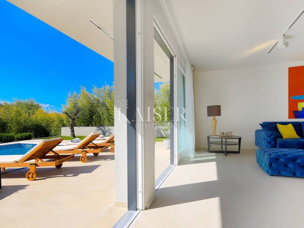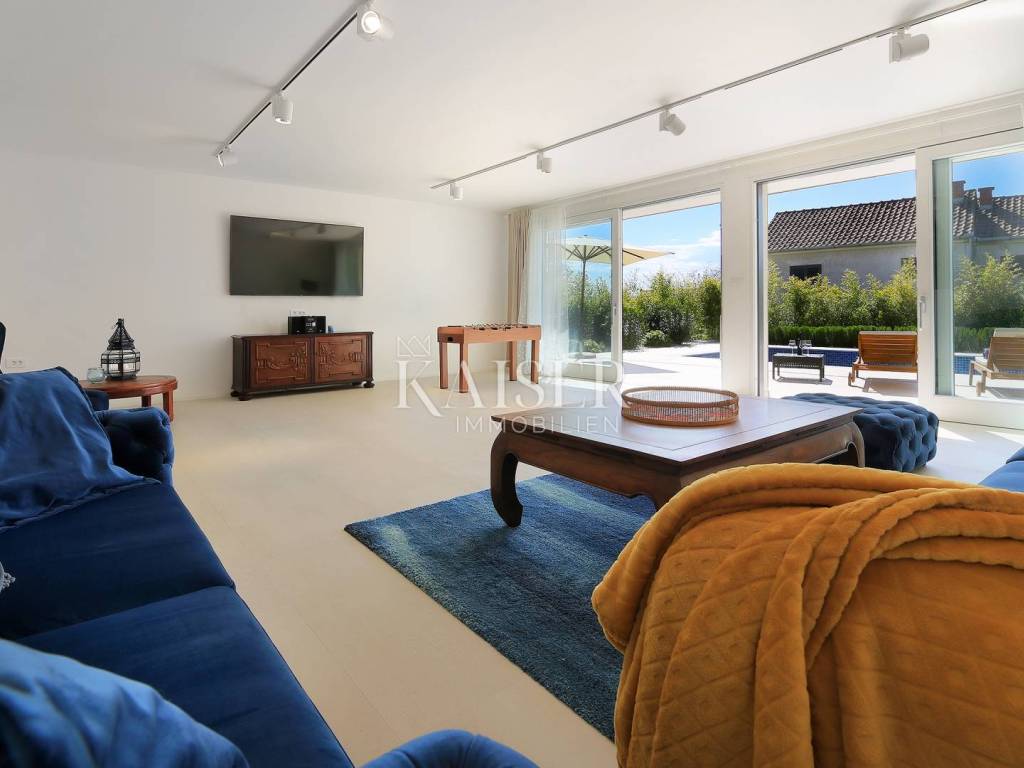 The ground floor, measuring 103.89 m², is entered via a covered terrace through a modern entrance door with a digital code, which ensures additional security and comfort. The entrance hall with a cloakroom creates a pleasant first impression, while on the right there is a guest toilet, and on the left a boiler room that also serves as a laundry room. The spacious, bright living area of the home opens up, which includes a kitchen and dining room with a total area of 25.66 m². The kitchen, by the renowned manufacturer Scavolini, is custom-made and is fully equipped with Bosch appliances and an Electrolux refrigerator, integrated into a modern and sophisticated design. The dining room leads directly to the summer kitchen, which harmoniously connects the indoor and outdoor spaces. A few steps down is an impressive living room measuring 54.60 m² with large glass walls that provide the space with plenty of natural light and provide direct access to the covered terrace of 10.62 m² and further to the pool.