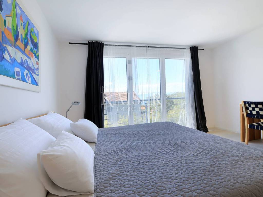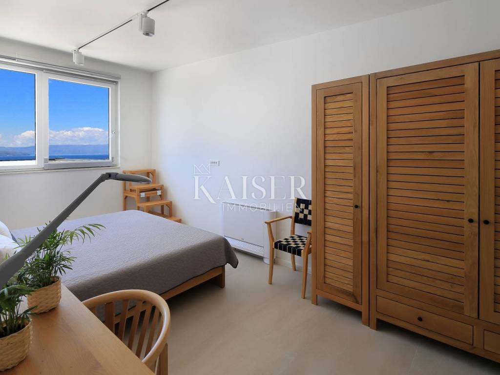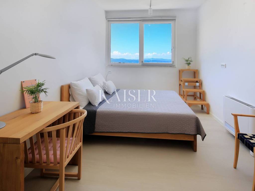 On the 108m² floor, including the mezzanine, there are four spacious bedrooms ranging in size from 16.04 m² to 20.25 m², each with its own elegant bathroom. Two of the bedrooms have access to a spacious roof terrace of approximately 50 m² with panoramic views of the Kvarner Bay, providing the perfect place to relax at sunset. There are additional storage rooms on both floors that provide practical storage space.