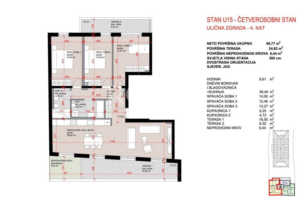 STAN U-15, četverosoban na 4. katu, ukupno 103 m2 neto prodajne površine.