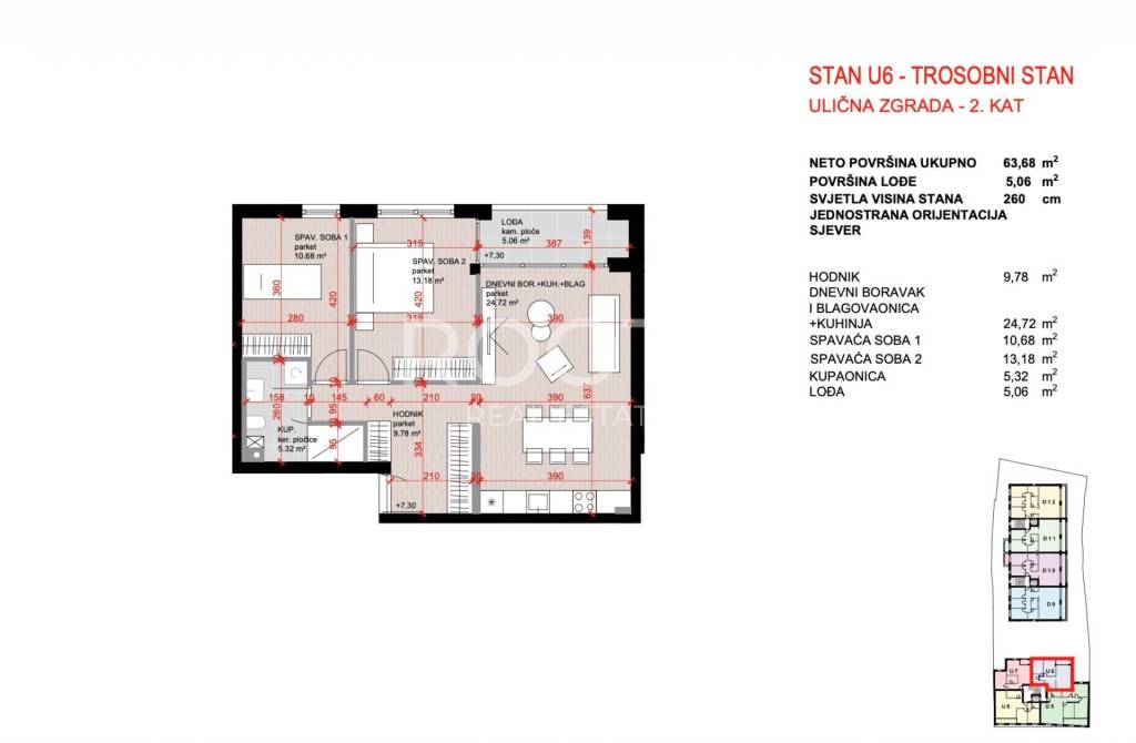 STAN U-6, trosoban na 2. katu, ukupno 72,5 m2 neto prodajne površine.