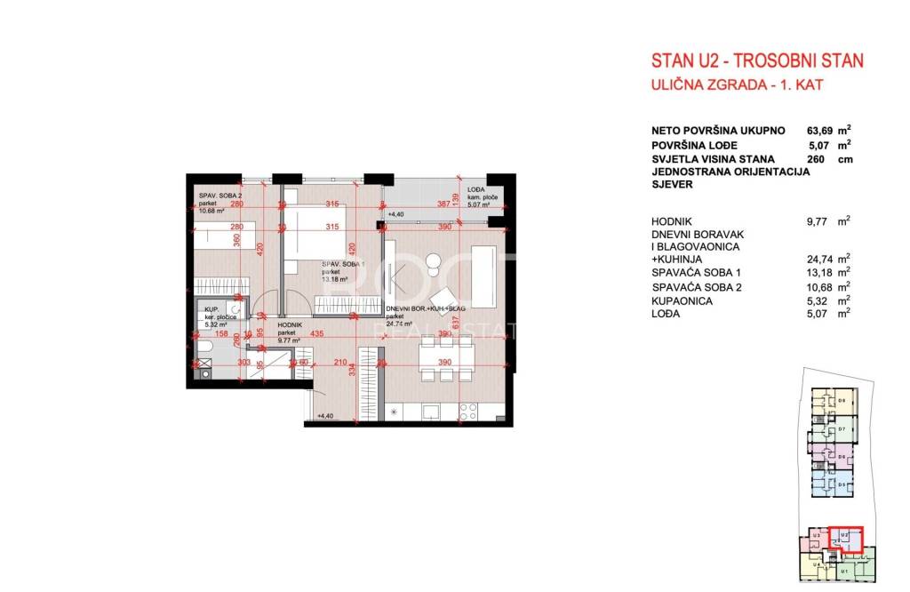 STAN U-2, trosoban na 1. katu, ukupno 68 m2 neto prodajne površine.