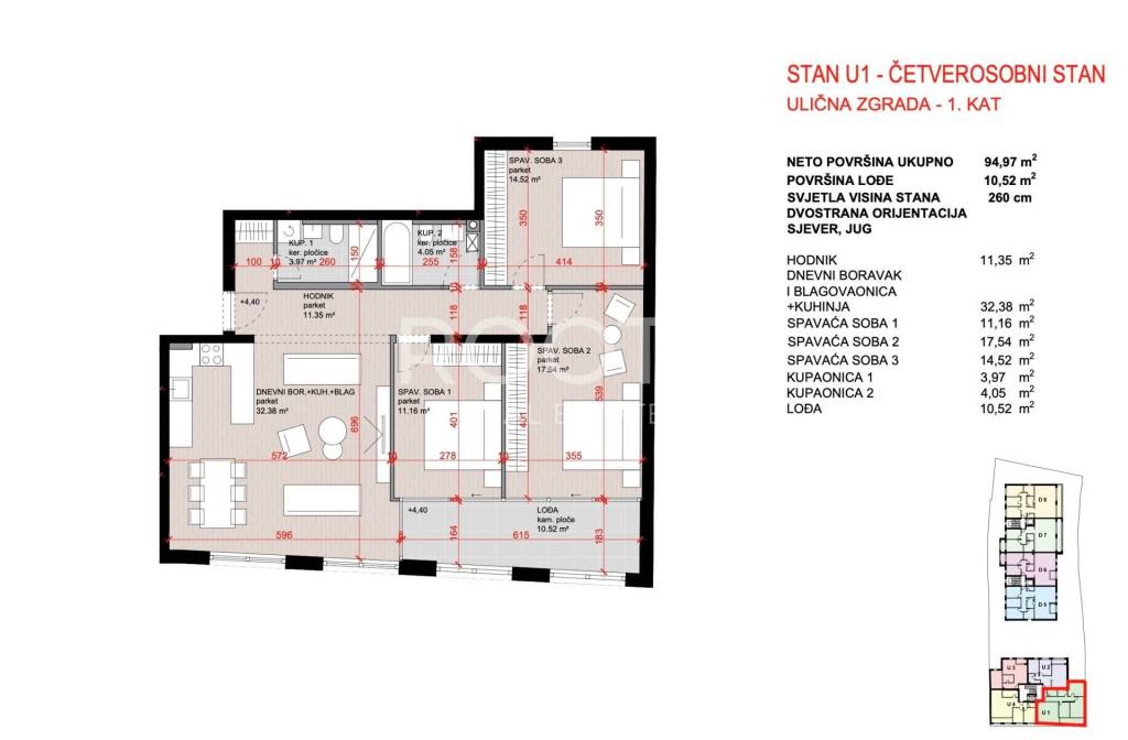 STAN U-1, četverosoban na 1. katu, ukupno 103 m2 neto prodajne površine.