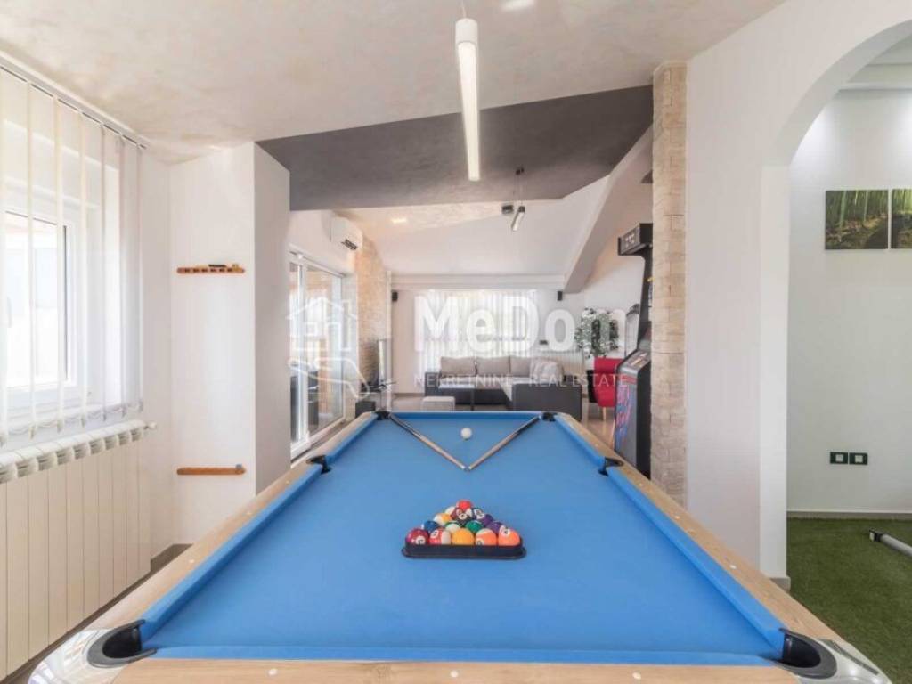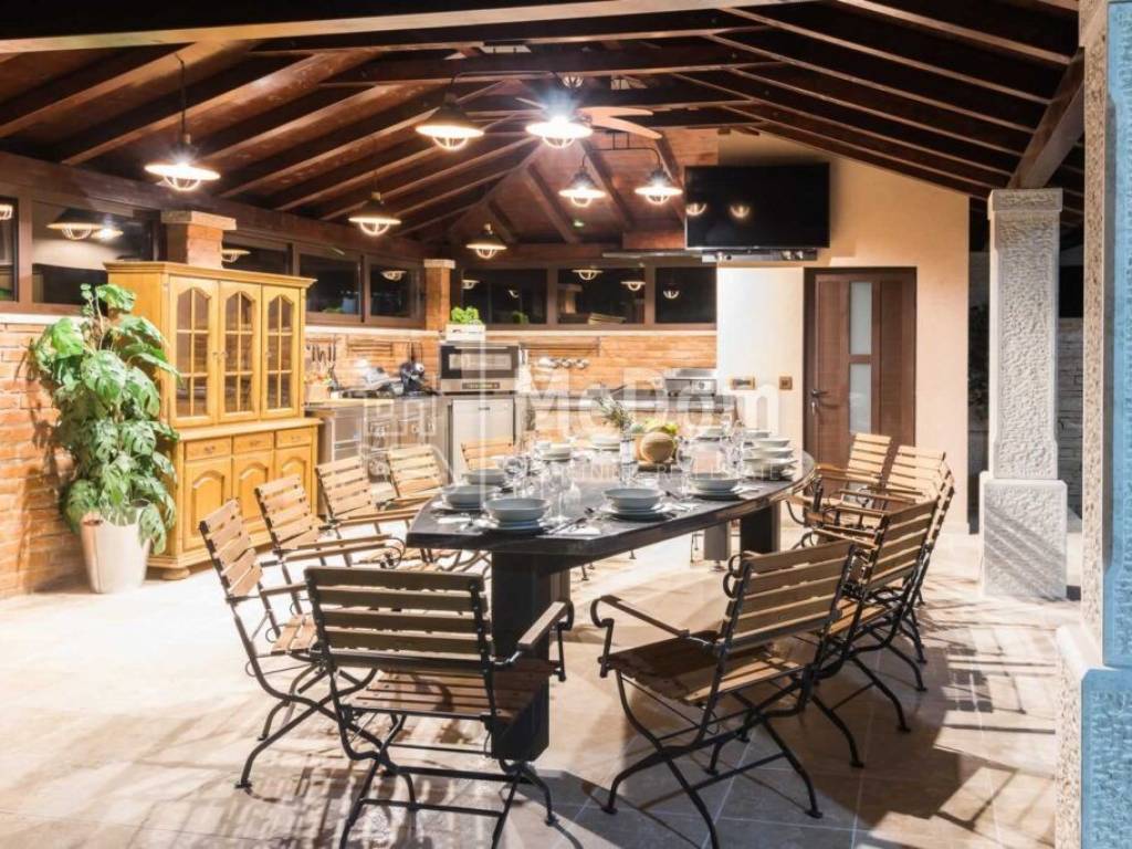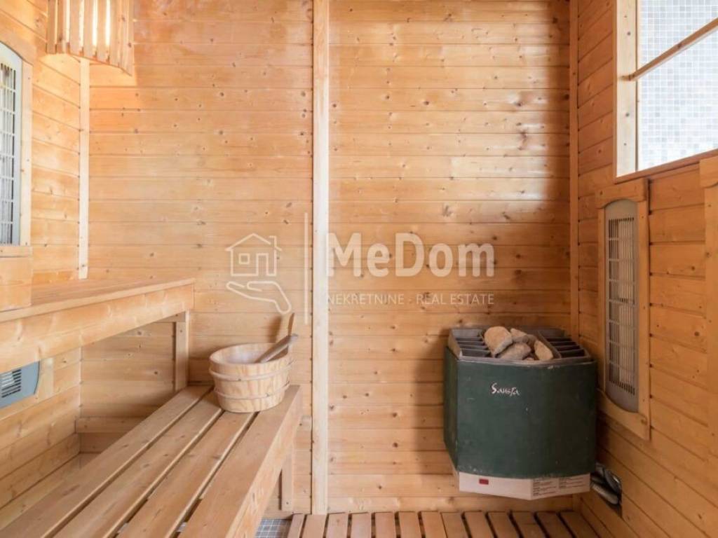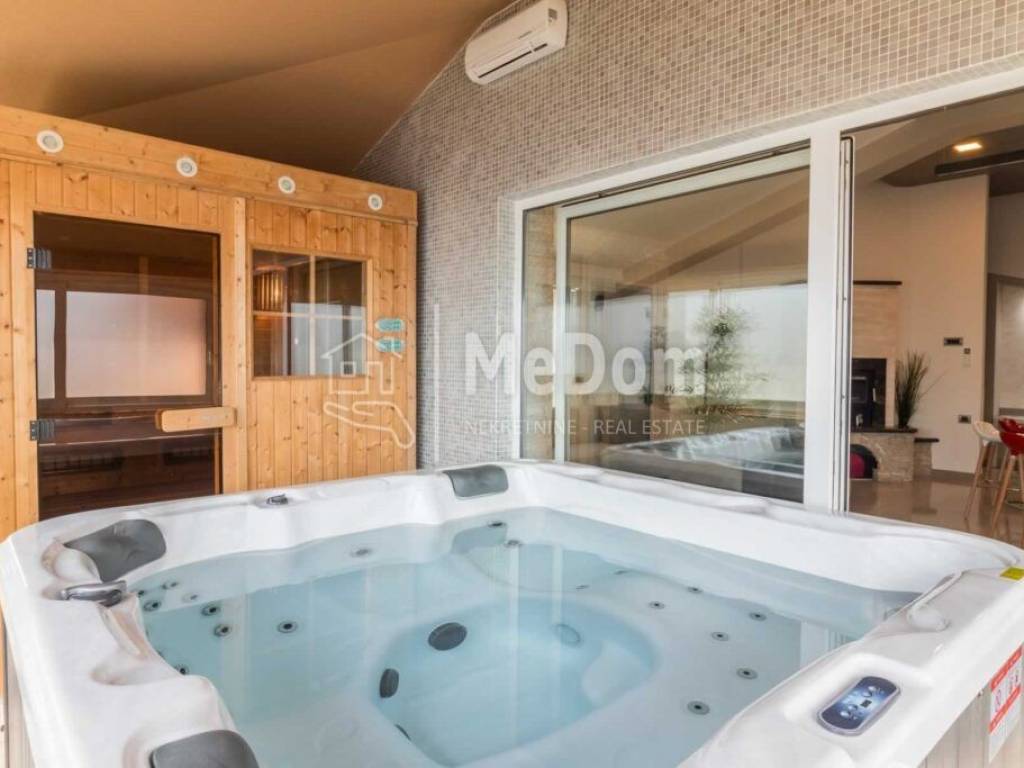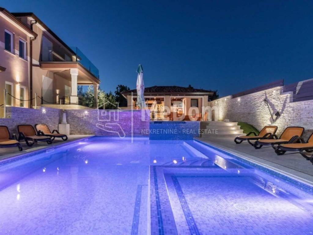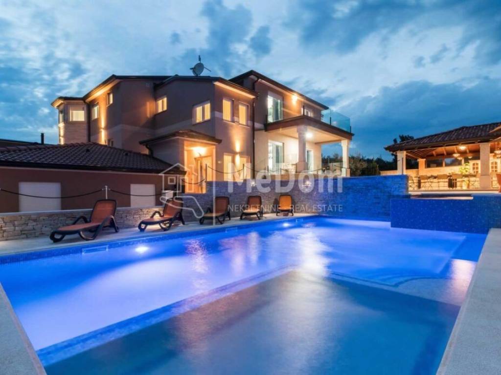 Istria, Valtura, a larger detached exclusive villa of 600m2 living space, is for sale. It is built with top-quality materials, a landscaped environment, and a garden for growing organic vegetables and olives with its well. The villa has all the necessary equipment for luxurious living, active vacation, or tourism on a plot of 1780m2.