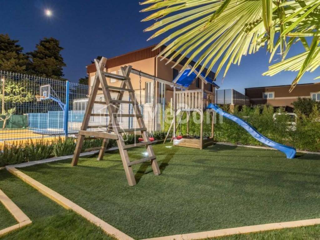 6. Children's playground with trampoline, swing, and slide.