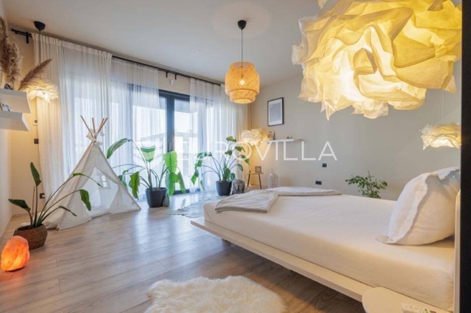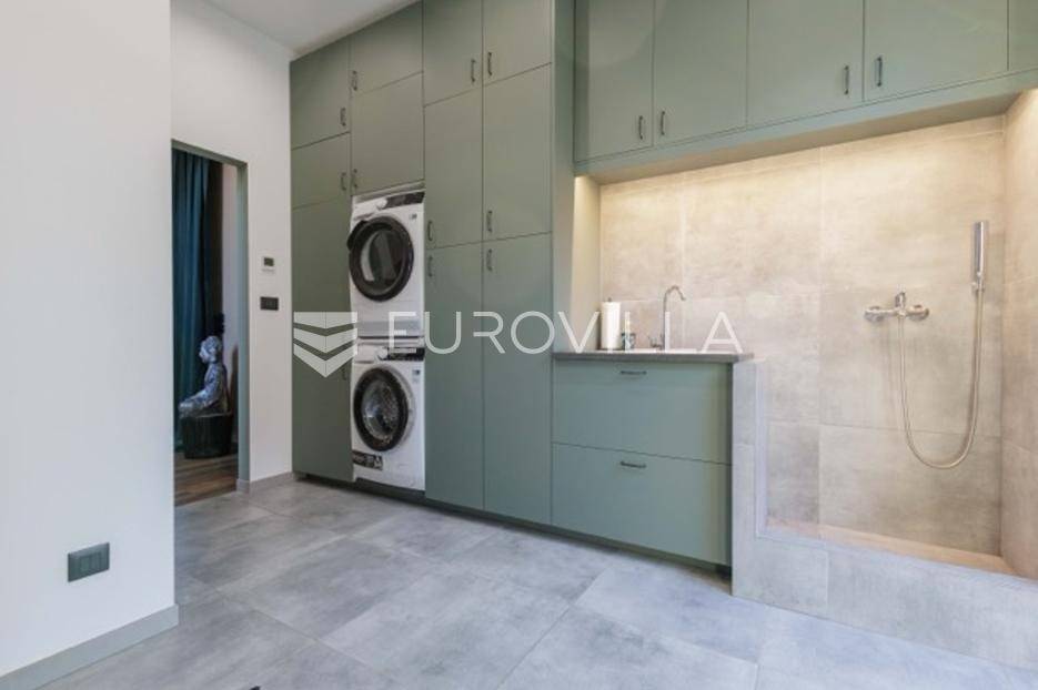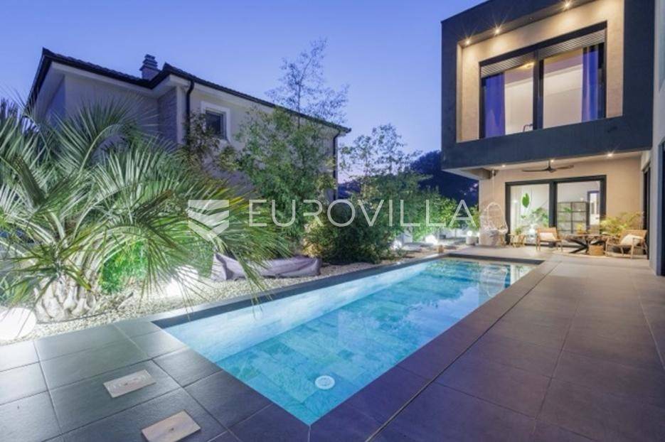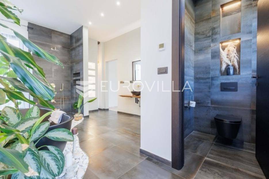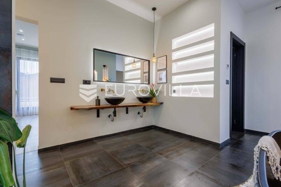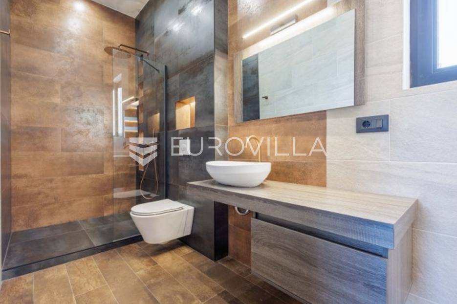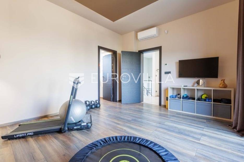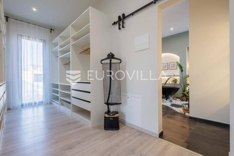 U Premanturi na samom jugu Istarskog poluotoka smjestila se ova prekrasna jedinstvena vila na uređenoj okućnici od 710 m2.Proteže se na dvije etaže. U prizemlju vile dominira veliki dnevni boravak pomno dizajniran. Tople boje, unikatni dijelovi namještaja, rasvjeta, kamin u centralnom dijelu prostora, velike staklene stijenke s pogledom i izlazom na bazen pružaju osjećaj topline i doma. U prizemlju se još nalazi komforna kuhinja, spavaća soba, toalet, ostava, tehnička soba, izlaz na veliki stražnji dvorišni dio.Unutrašnjim elegantnim stubištem penje se na kat gdje se nalaze dvije spavaće sobe. Velika spavaća soba je pravi spoj elegancije i komfora, svjetla i prozračna s velikom natkrivenom terasom i pogledom u prirodu. Velika kupaona je stopljena s interijerom sobe te predstavlja pravu zelenu oazu. Druga spavaća soba modernog dizajna također ima svoju vlastitu kupaonu.Sav namještaj i opremljenost vile je mahom iz Njemačke, Italije i Češke.U cijeloj je vili podno grijanje - sistem toplinskih pumpi, dok svaka soba ima svoj klima uređaj.U dvorišnom dijelu nalazi se veliki roštilj, komforna terasa za druženje i odmor. Zeleno raslinje pruža privatnost, dok moderna rasvjeta u večernjim satima daje čarobnu notu samoj vili. Vila ima video nadzor.Ulazni dvorišni dio pruža mogućnost parkinga za četiri vozila.Ova jedinstvena vila u Premanturi prava je rijetkost na tržištu te nam se slobodno s povjerenjem obratite za više informacija.... Više na eurovilla.hr, ID: 518603