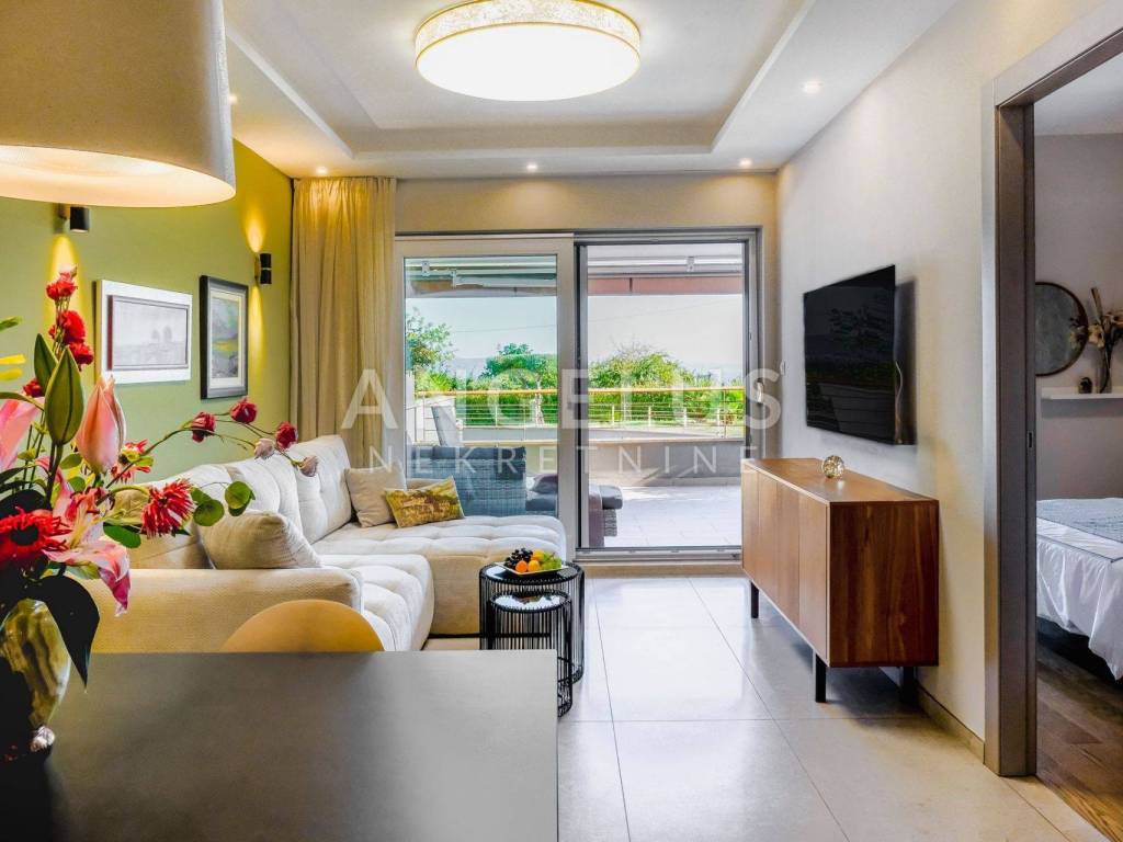 A luxurious and functional two-bedroom apartment is for sale located in a smaller, modernly designed building, with an impressive open view of the sea.