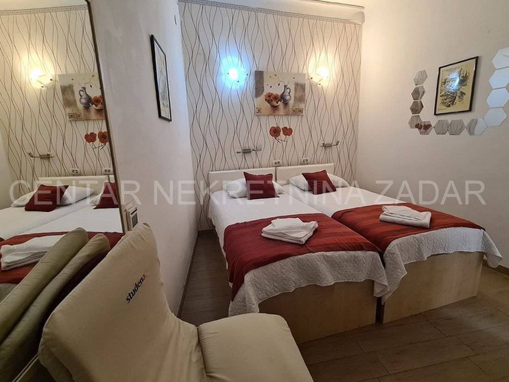 A spacious apartment for sale in Zadar, located on the first floor of a building in an extremely attractive location by the sea. Its area is 116.07 m, and it is divided into the owner's apartment and a separate part with three rooms for rent. The apartment consists of a hallway, a spacious kitchen with a dining area and a living room, a bedroom and a bathroom. The rooms have large windows from which a beautiful view of the entire Jazine bay is offered. The hallway has an exit to a small courtyard inside the building. The second part of the apartment has a separate entrance from the hallway and consists of a long hallway and three air-conditioned bedrooms with private bathrooms. One room has an exit to a small terrace with a sea view, while the other has an exit to a small courtyard. The rooms are fully equipped and are successfully rented out. The apartment is an excellent investment opportunity for a family who wants to engage in tourism or divide the apartment into two smaller ones. The location of the building is excellent - it is easily accessible by public transport, with a large public parking lot in the immediate vicinity. Shops, restaurants, primary and secondary schools, public transport, a polyclinic and all other facilities necessary for a comfortable life are within walking distance. For a viewing, please call +385 99 325 2763.