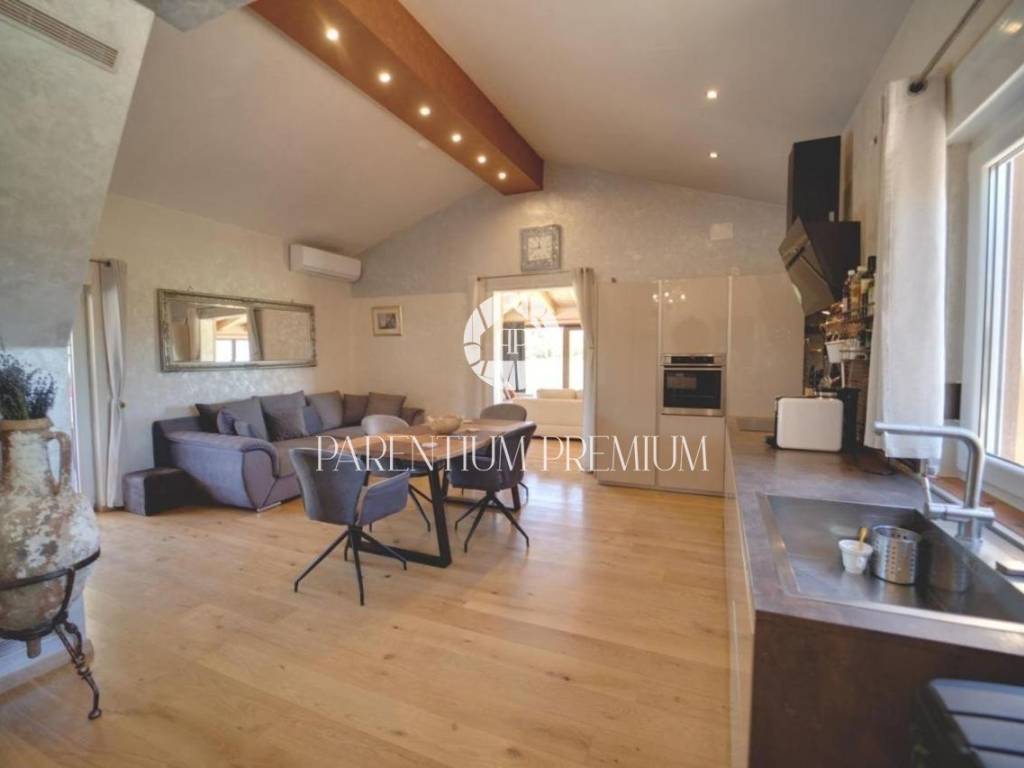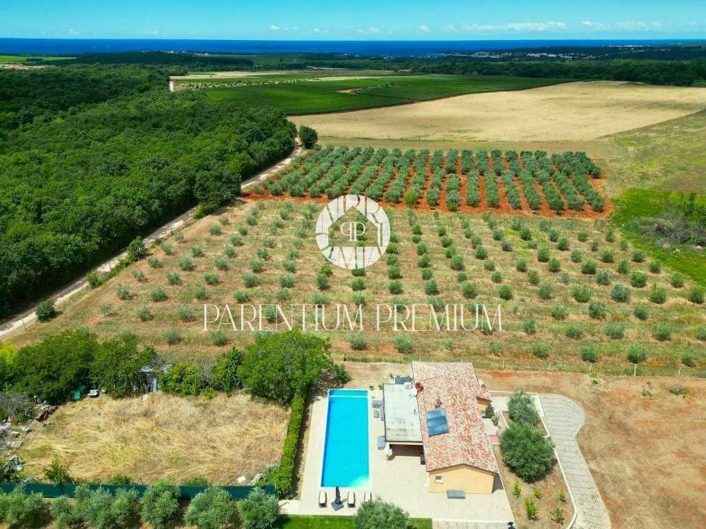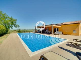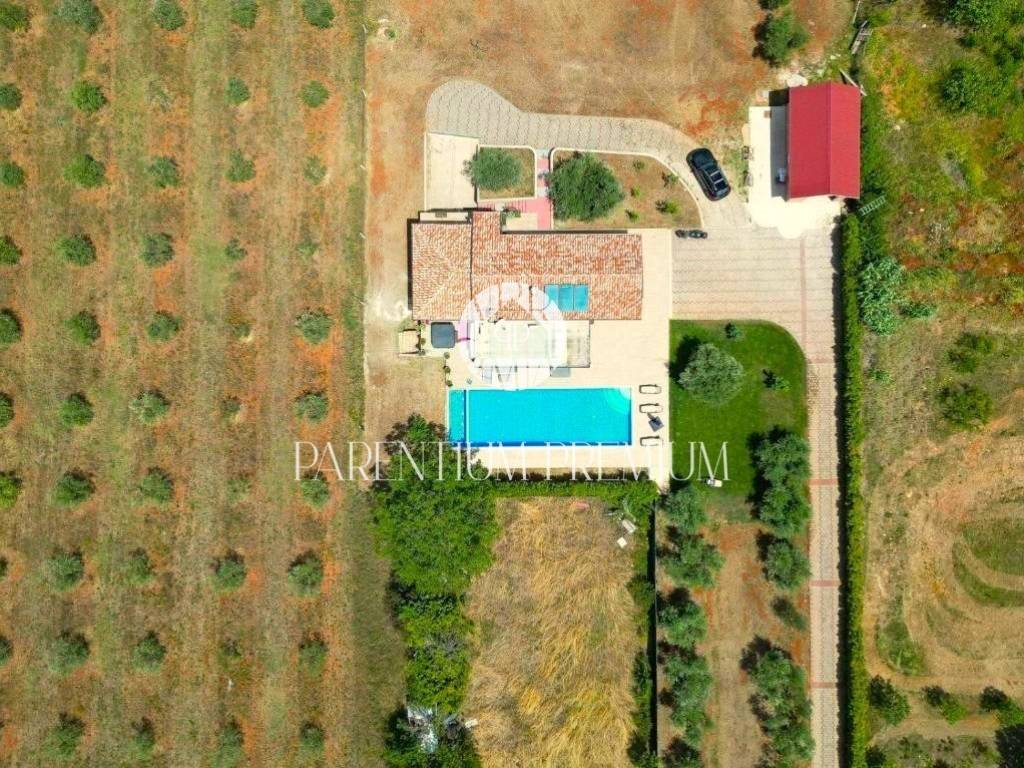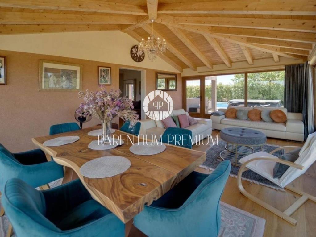 The house is equipped with air conditioning and an underfloor heating system for year-round comfort, while a rustic wood-burning fireplace adds charm and warmth to the living areas. Solar heat collectors are used to prepare hot sanitary water.