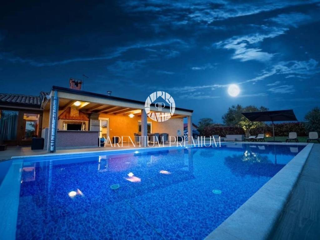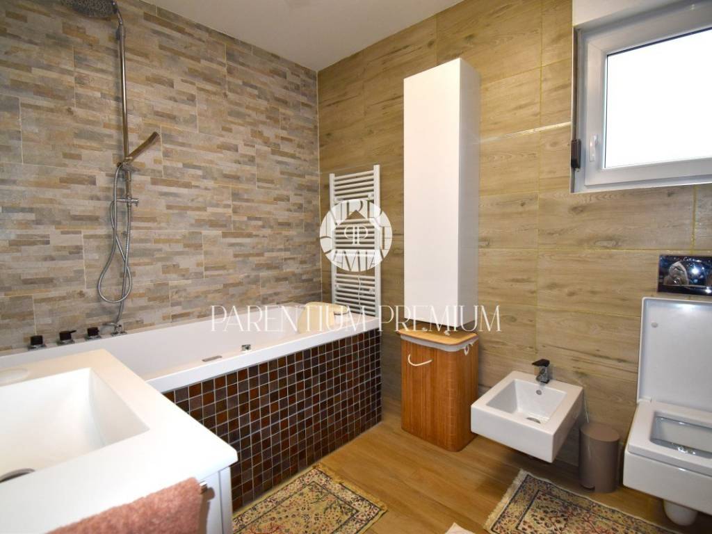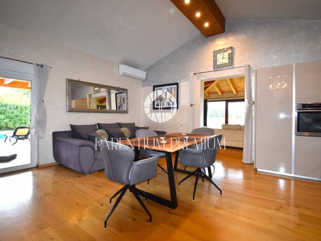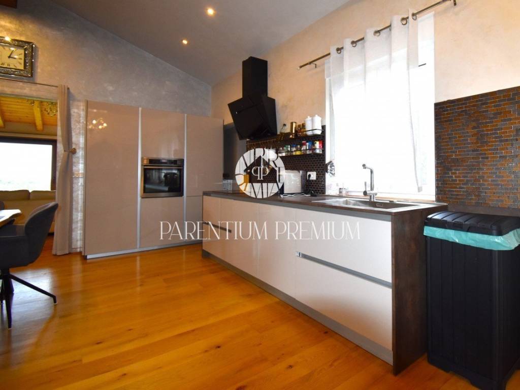 The house is equipped with air conditioning and an underfloor heating system for year-round comfort, while a rustic wood-burning fireplace adds charm and warmth to the living areas. Solar heat collectors are used to prepare hot sanitary water.