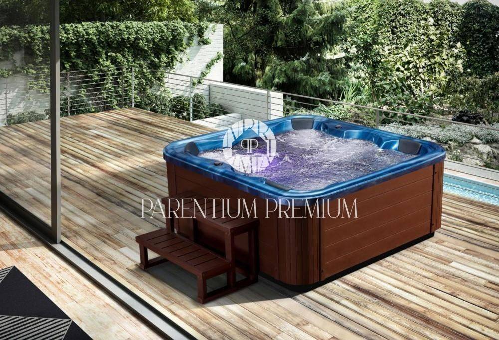 The spacious porch creates a wonderful continuity with the interior space, and here there is a modern summer kitchen and outdoor dining area, as well as a hot tub for relaxation.