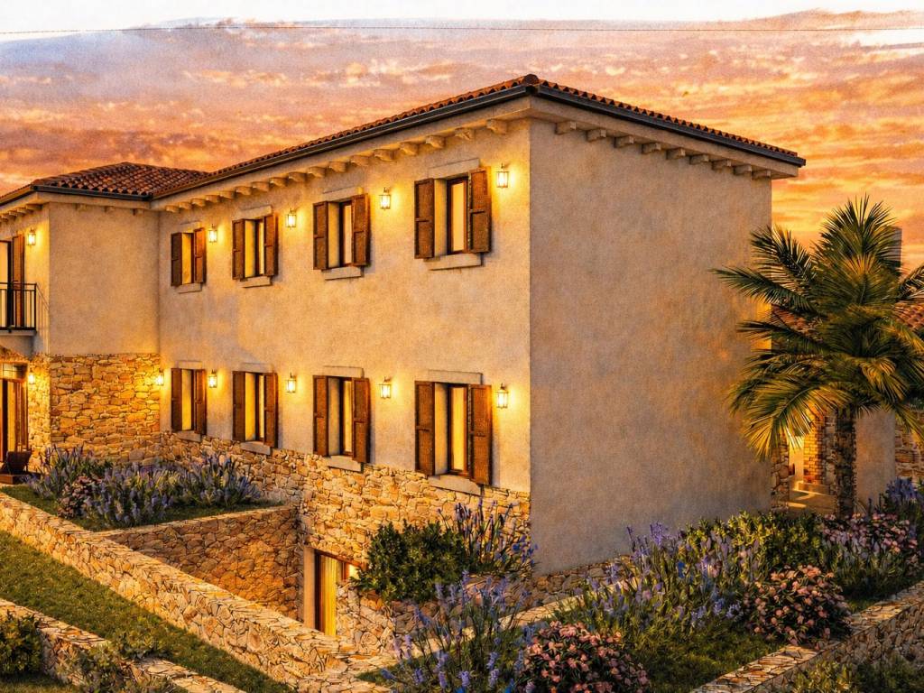 Set on a 798 m² private plot in the tranquil village of Barušići, this exceptional stone villa embodies a refined Mediterranean architectural style, carefully adapted to its location on Krk Island. The property enjoys expansive open views across the Adriatic Sea and toward the mountains above Opatija, offering a rare combination of island serenity and dramatic natural scenery.