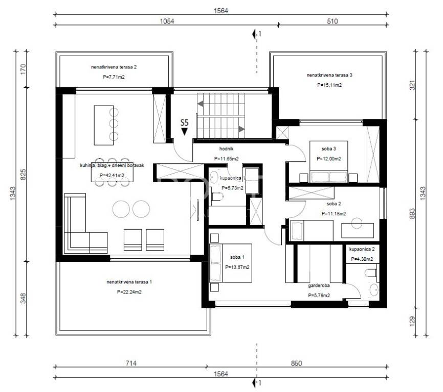 Stan S5 - četverosoban penthouse na drugom katu, zatvorene površine 106,72 m2 s tri nenatkrivene terase ukupne površine 45,04 m2 i dva garažna parkirna mjesta.