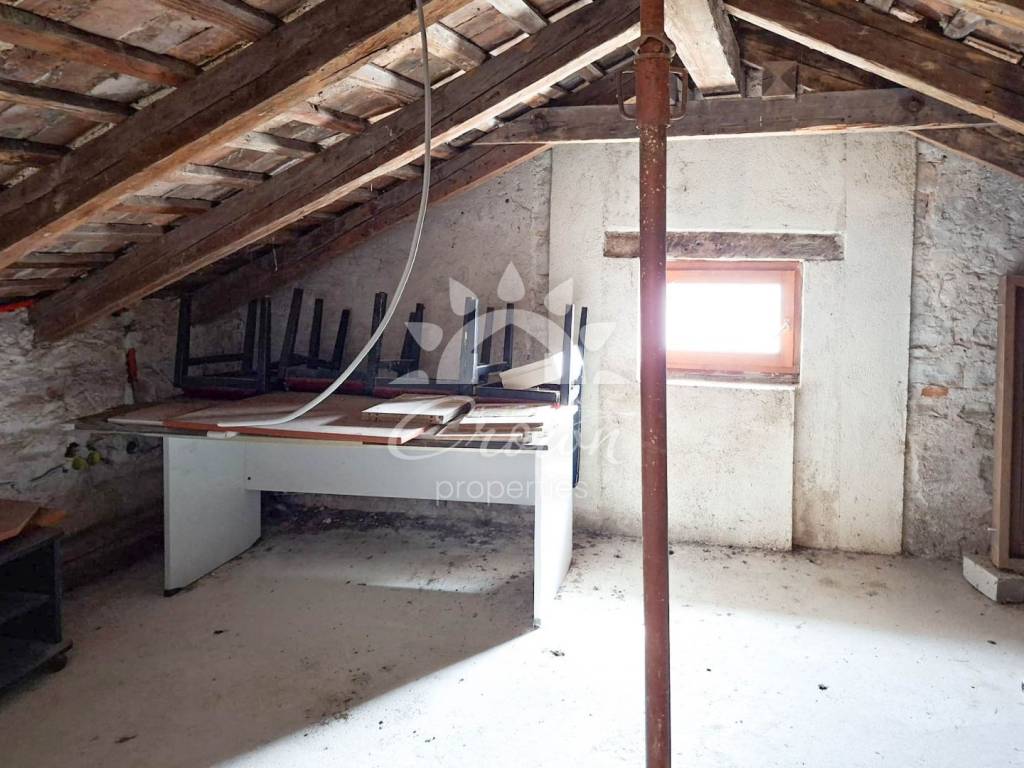 A stone house with a total area of approximately 260 m² is divided vertically into two residential units that extend from the ground floor to the roof. Each residential unit has around 120 m² of usable living space. The house consists of a ground floor, first floor and a high attic. The property is in a condition that allows living in it with minimal investment.