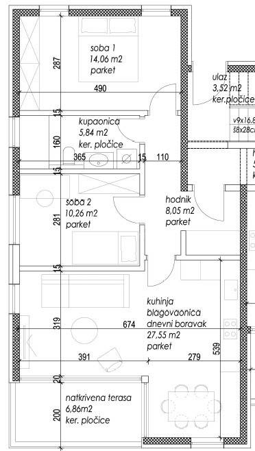 Kvalitetno iskorišten tlocrt sastoji se od ulaznog hodnika, prostranog open-space koncepta kuhinje, blagovaone i dnevnog boravka s izlaskom na terasu, kupaonice te dvije spavaće sobe.