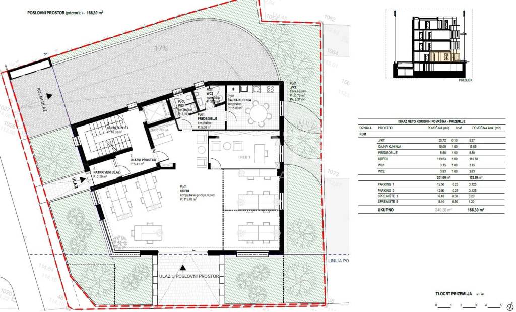 Poslovni prostor u prizemlju, sastoji se od fleksibilno organiziranih uredskih prostora s recepcijom, čajnom kuhinjom te dvije sanitarne jedinice. Tlocrt prostora omogućuje jednostavnu prilagodbu rasporeda prema potrebama budućeg zakupca.